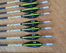 Fletched with Bohning Air vanes, Beiter nocks, 120gr break-off points with top and bottom collars.