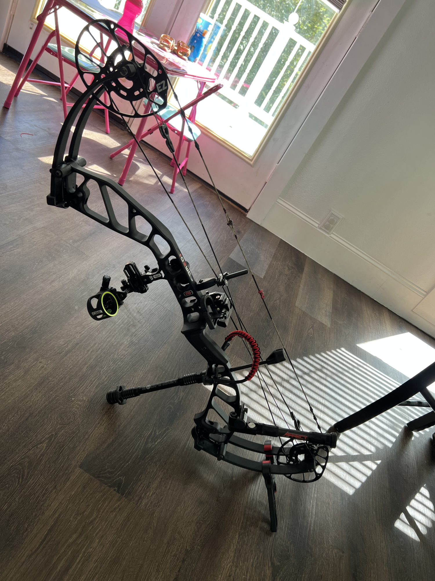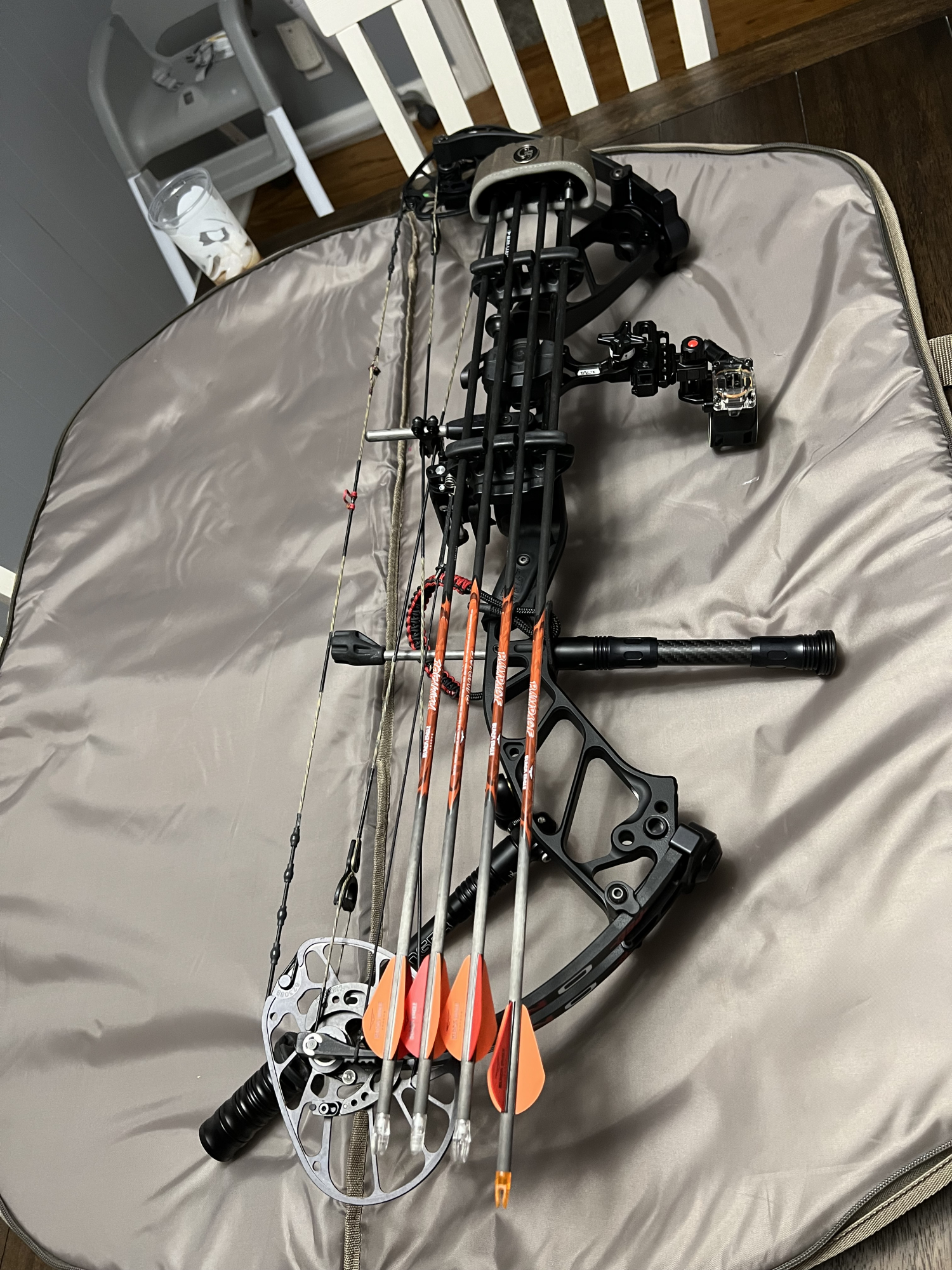 2023 PSE OMEN 33, black eagle rampage arrows 300, CBE tactical hybrid sight 3 pin, Hamskea trinity hunter pro rest, B3 rock release, bow finger hunter stabilizer 8”, G5 head loc air quiver, tarantula delux bow case, bow finger ultimate rear riser side bar, bow finger 10oz black stack weight.