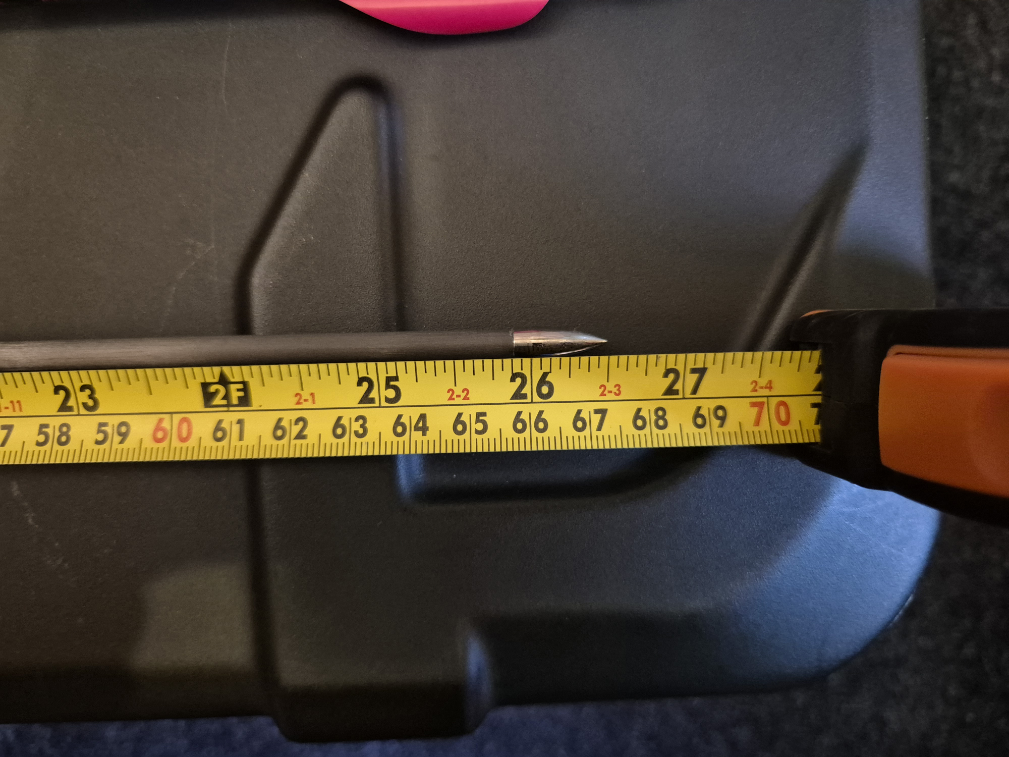 Easton ACE'S 720 spine at 26 1/2 inches from end of pin to end of point.