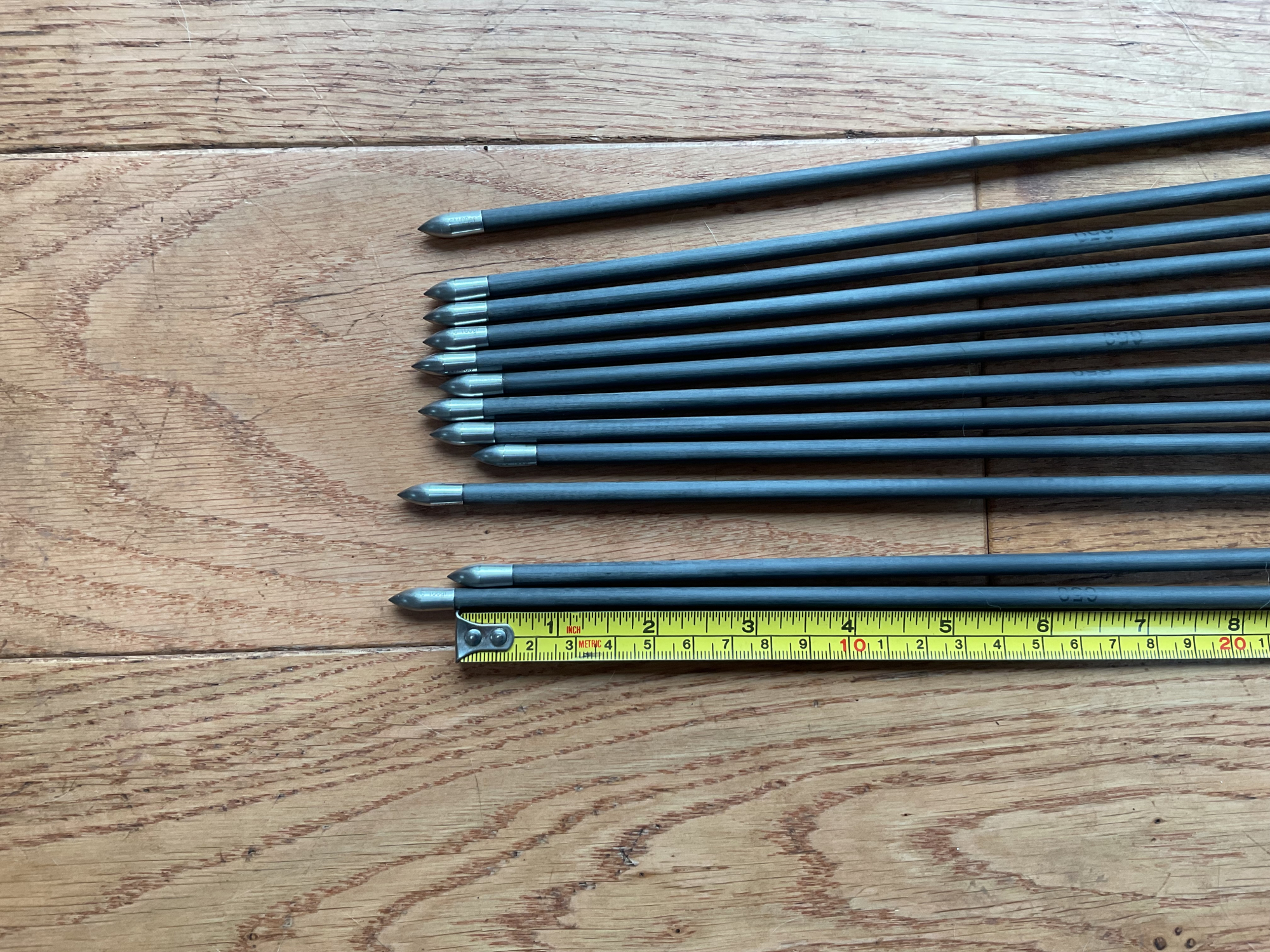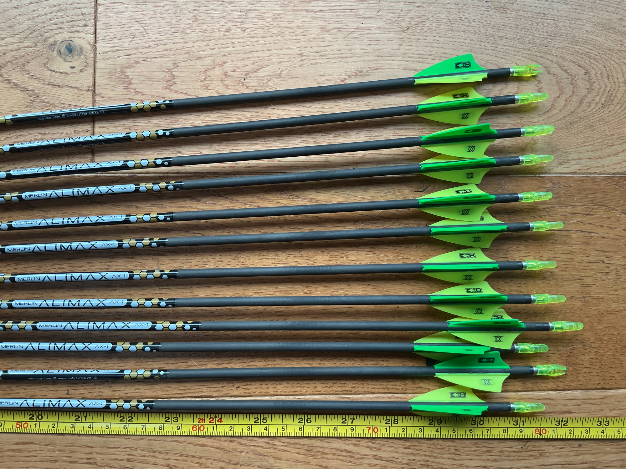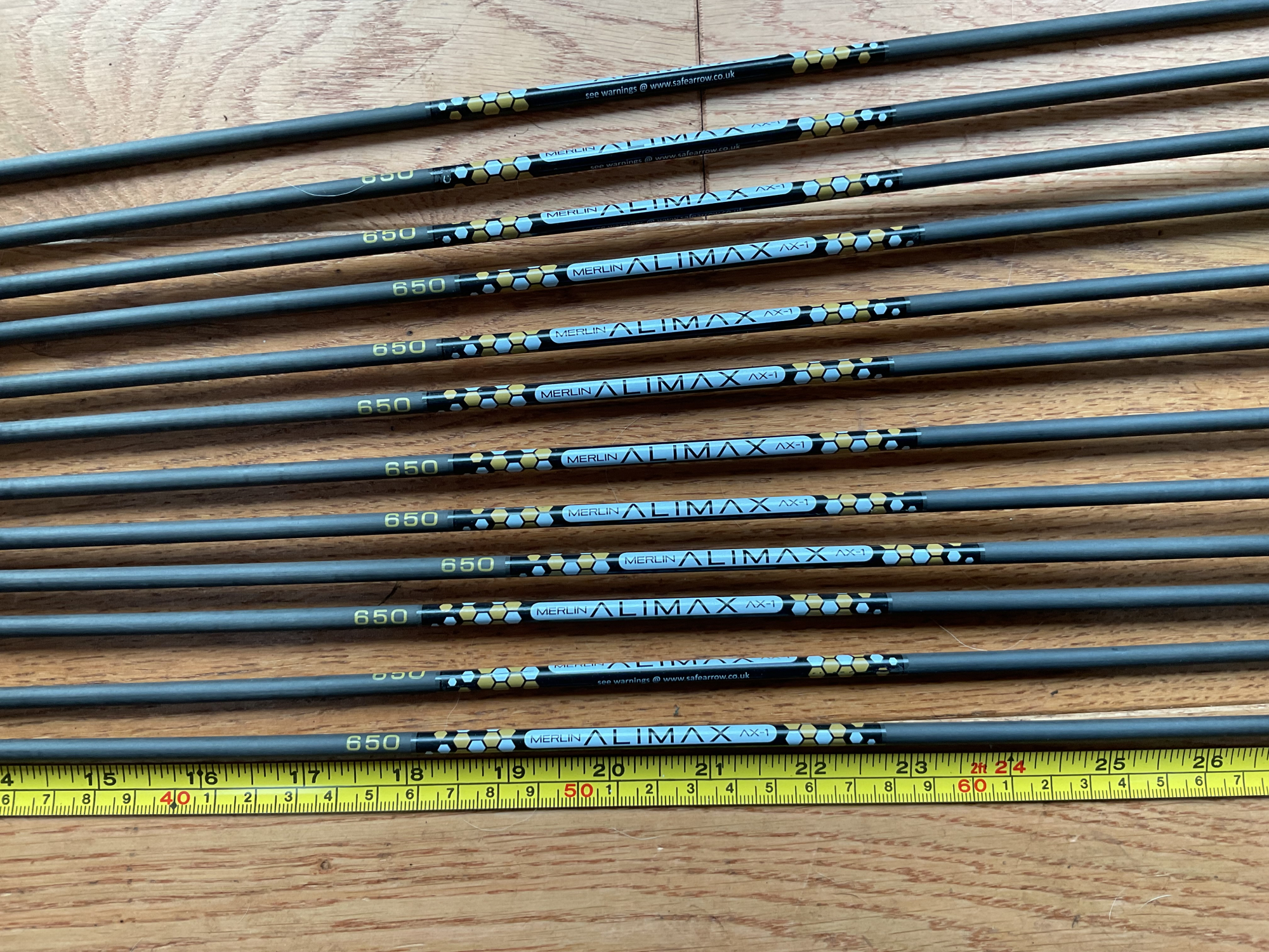 12 Merlin Alimax arrows, 650 spine, 31.25” from nock slot to end of shaft. They have had very little use and are in nearly new condition, although two arrows have a single fletching missing.