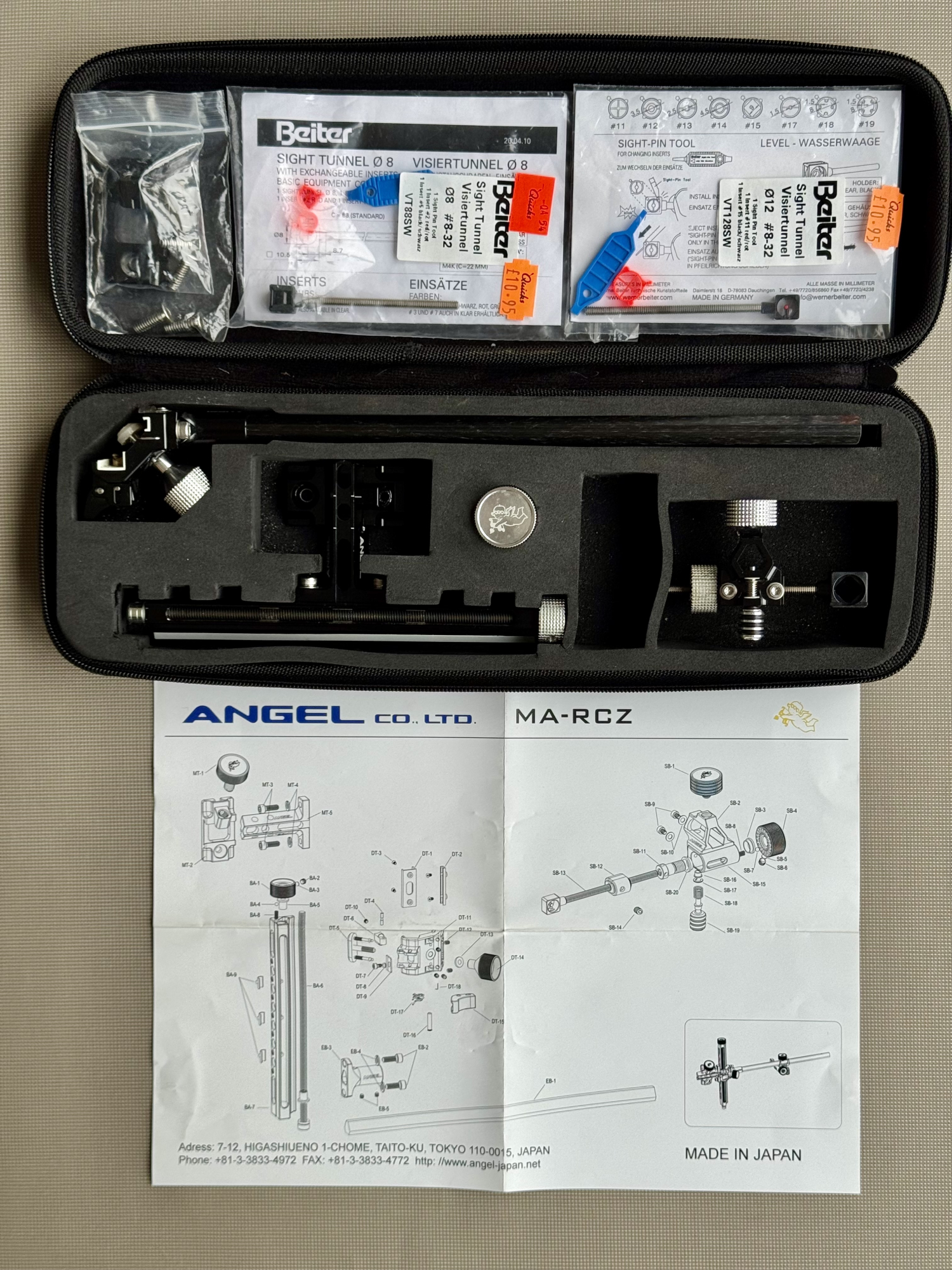 Angel MA-RCZ recurve sight in very good condition, with additional mounting block so can easily be mounted on 2 risers. Very high quality Japanese manufacture, often compared to high-end Shibuya sights such as the Ultima II and well regarded. Has distinctive "inboard" design with the bulk of the weight close to the riser.
