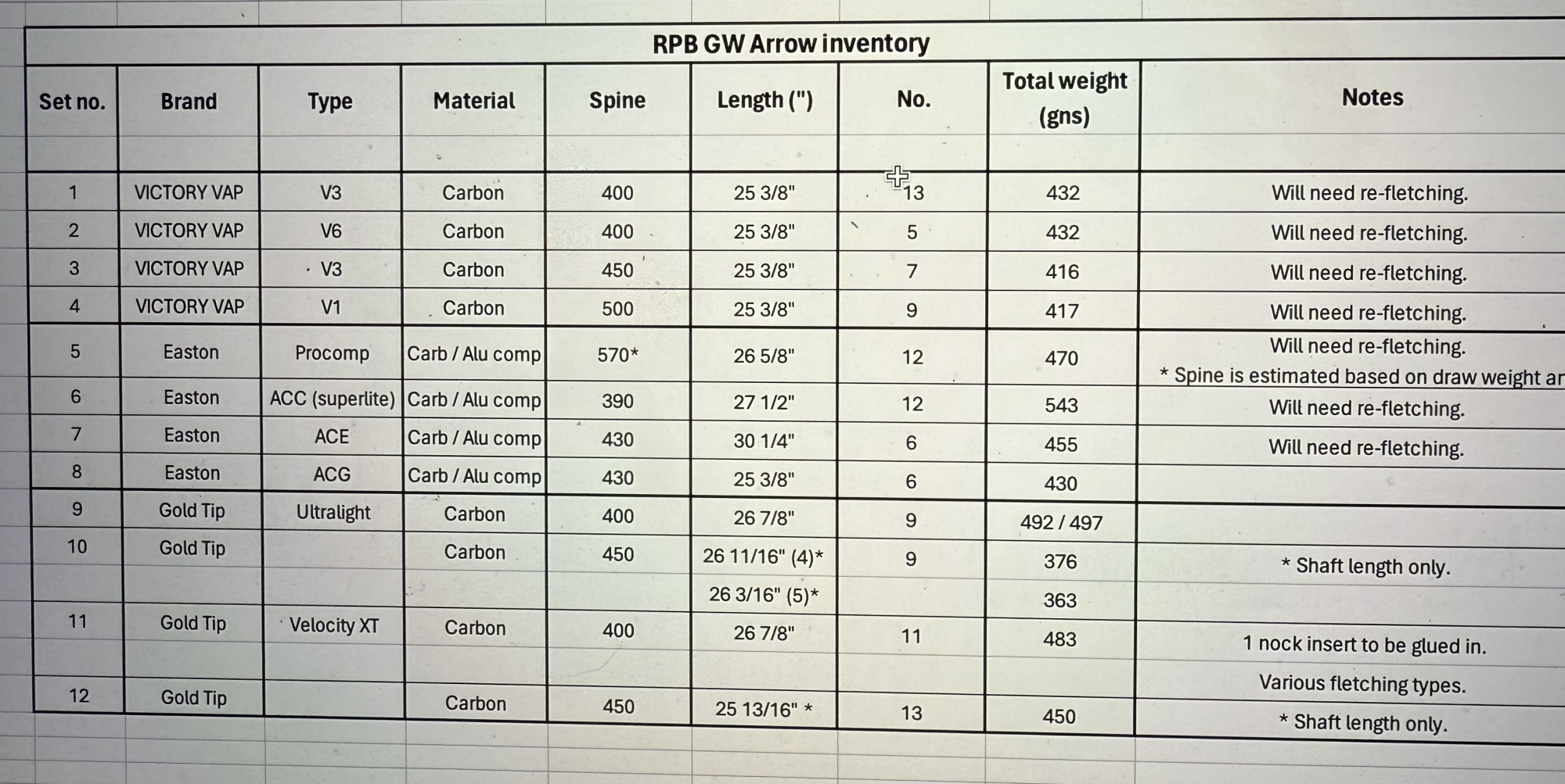 Various sets of arrows for sale. Victory, Easton and Gold Tip. Table attached for initial review. If you would like a picture of a particular set, please contact me and I can supply.....too many pictures to upload on this posting.
