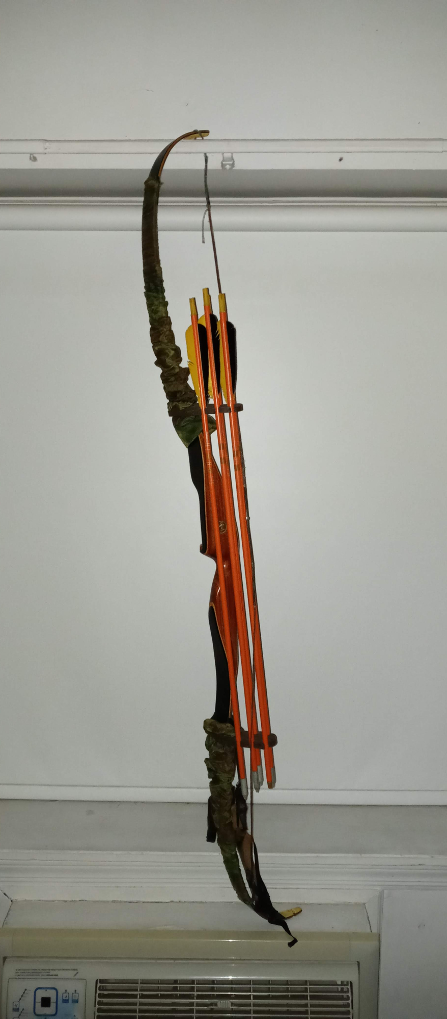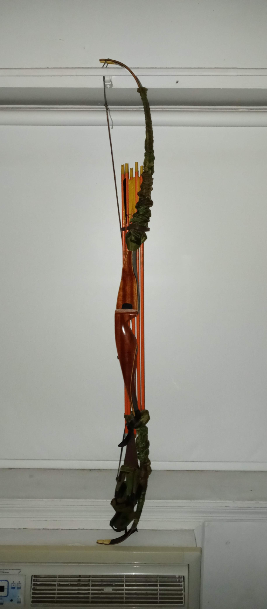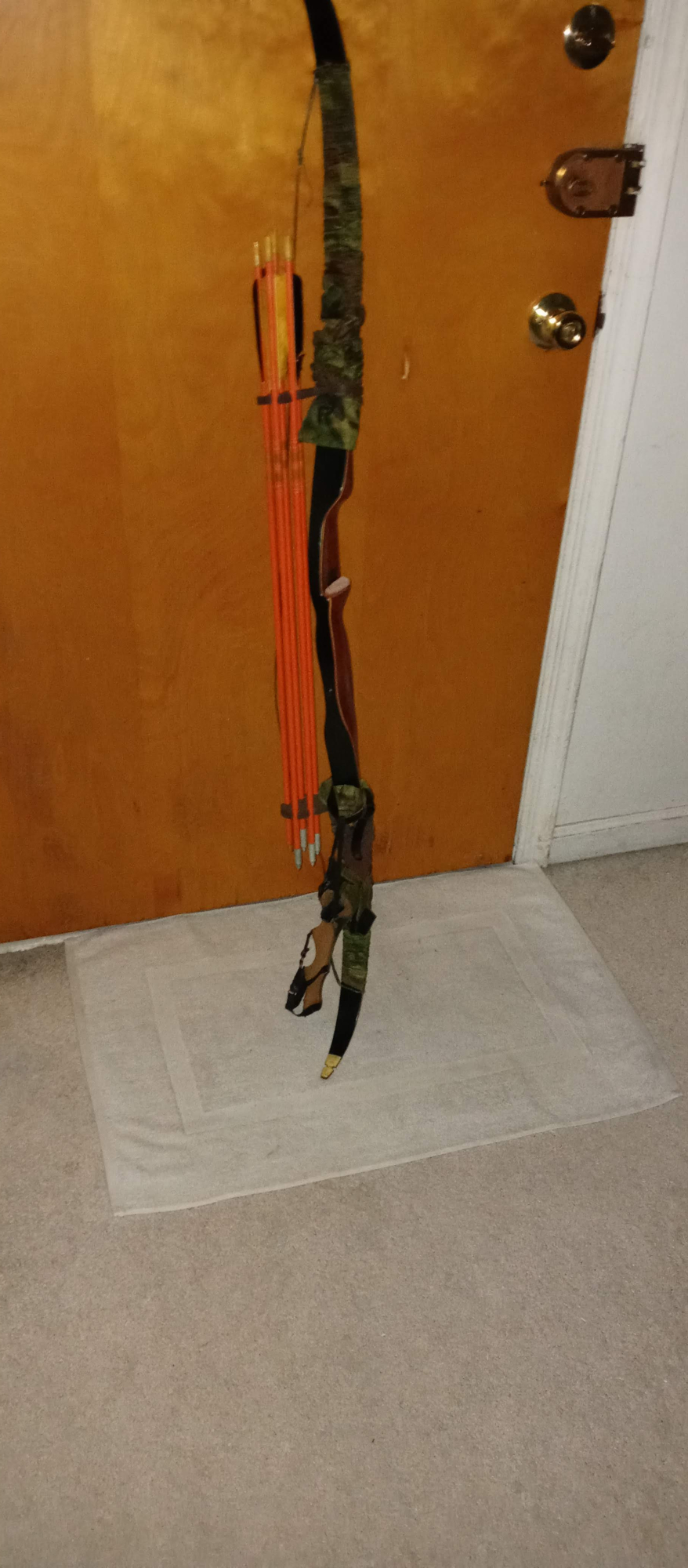 Bear Hunting Bow : 1971 right handed Bear Classic Recurve Hunting Bow. Used, in good shape. Amo-58" Length. 45Lbs at 28" draw. Includes camouflage covering, camouflage glove, arm guard, five practice arrows and bowstring.