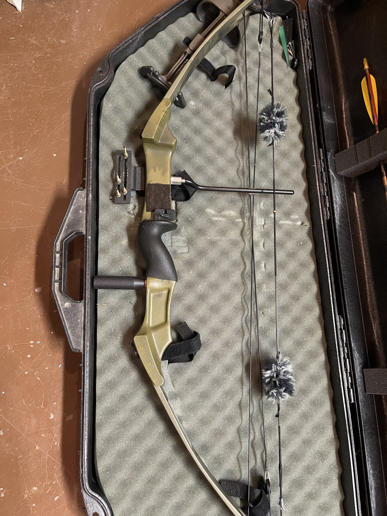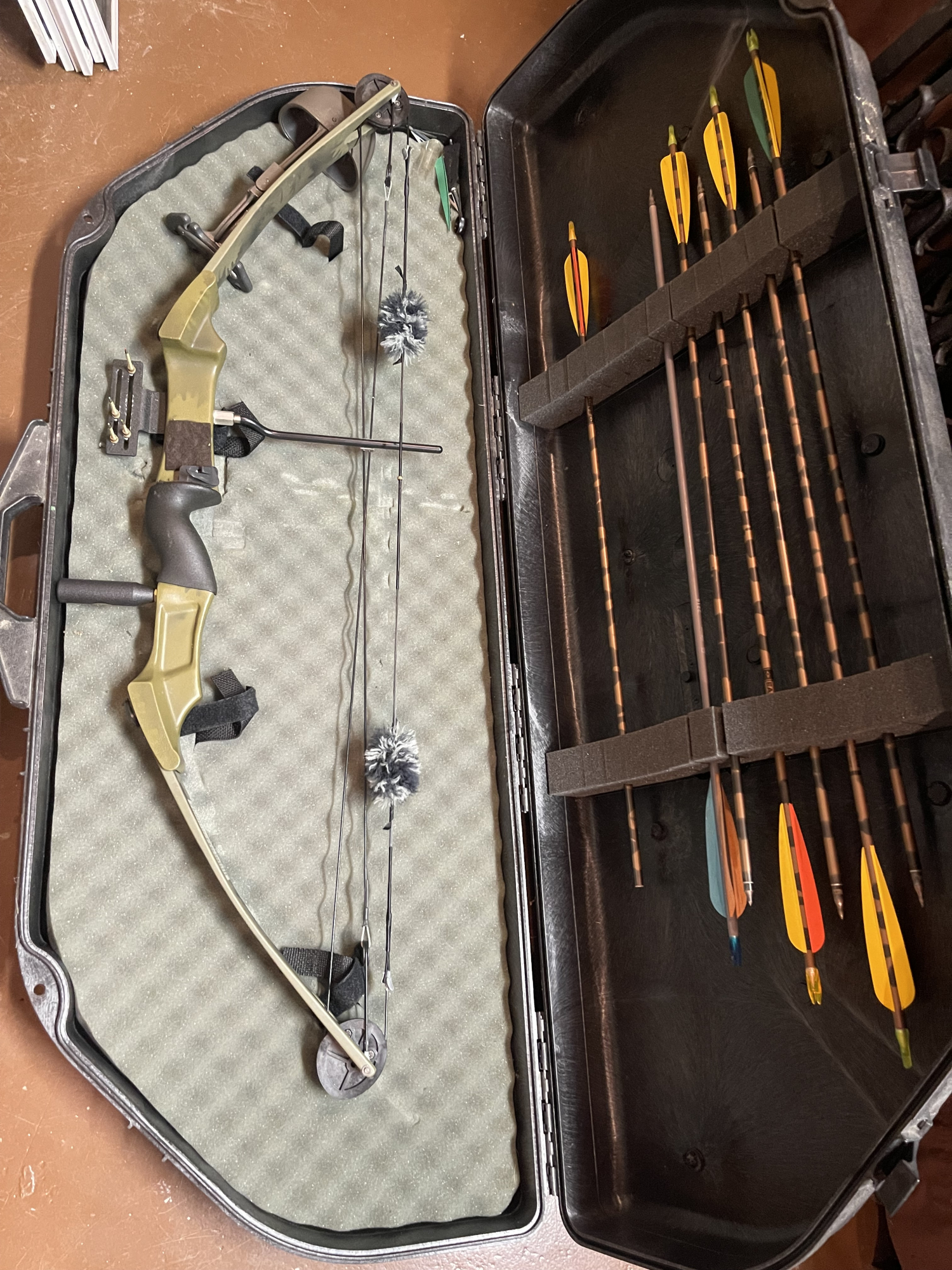 This is a Bear Whitetail II compound bow that’s from the early 90s but never been used. It comes with 7 arrows and 2 broad heads.