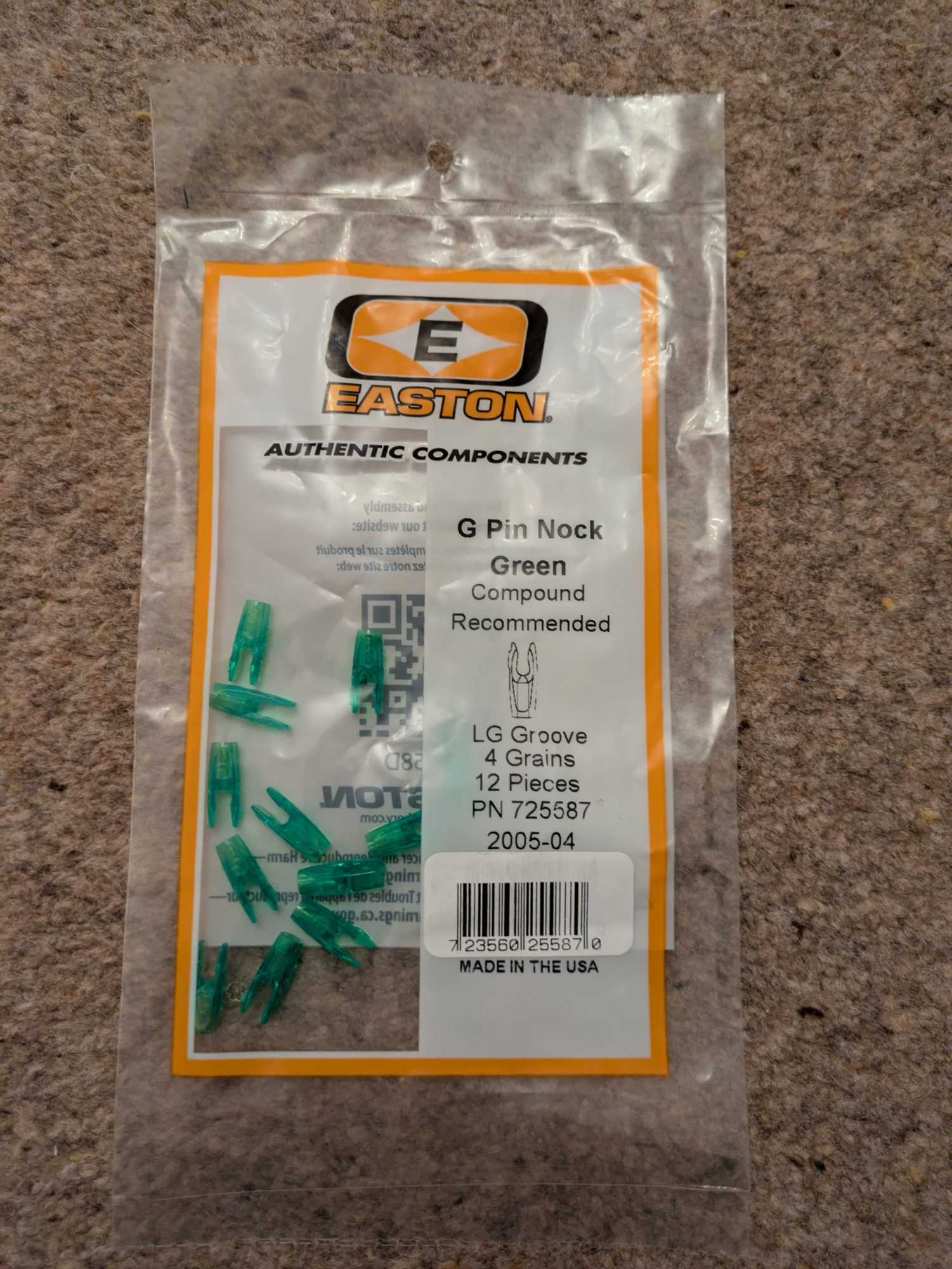 Brand new unopened packet of one dozen Easton G-Pin nocks, large groove in green. Perfect for compound bows, there are five available.