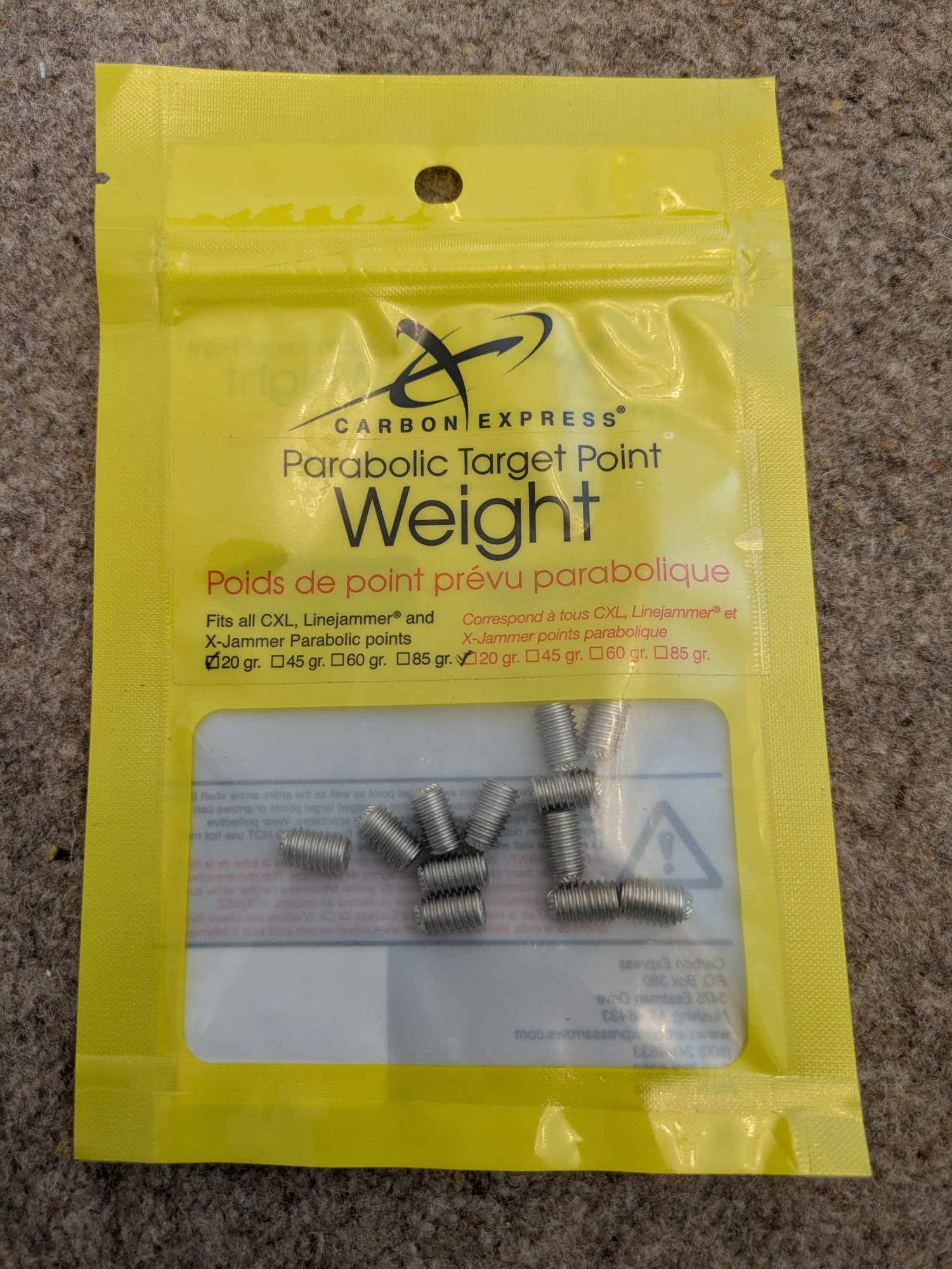 Unopened pack of 20 grain screw in point weights for Carbon Express arrows. They fit a wide range of models including X-Busters and CXL's.