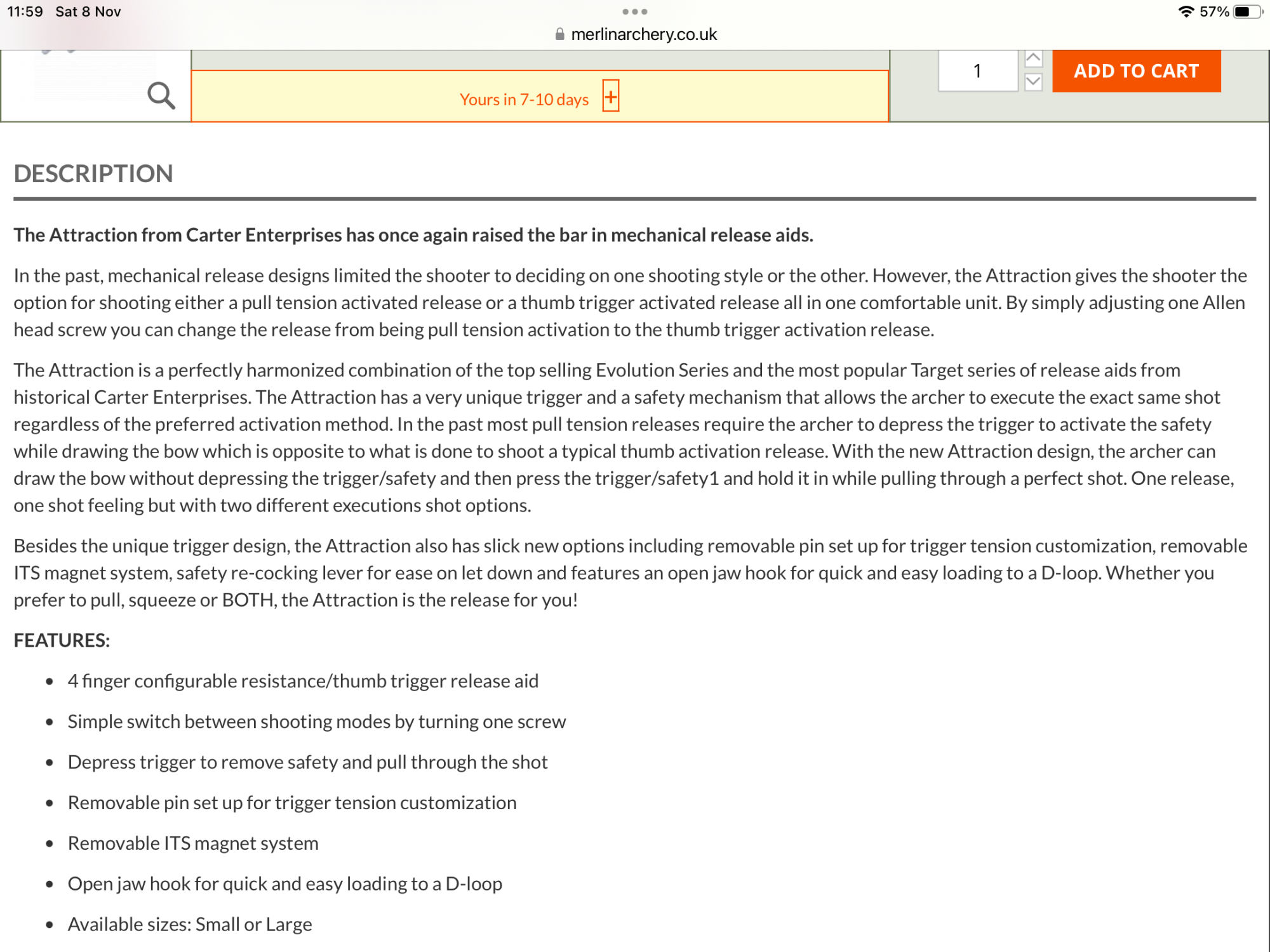 Carter Attraction Release Aid. Little used see photo custom solid brass thumb wheel mint condition.If you can’t decide thumb release or tension this does both read Merlin’s description before you purchase. The price includes postage at half the price of a new one.