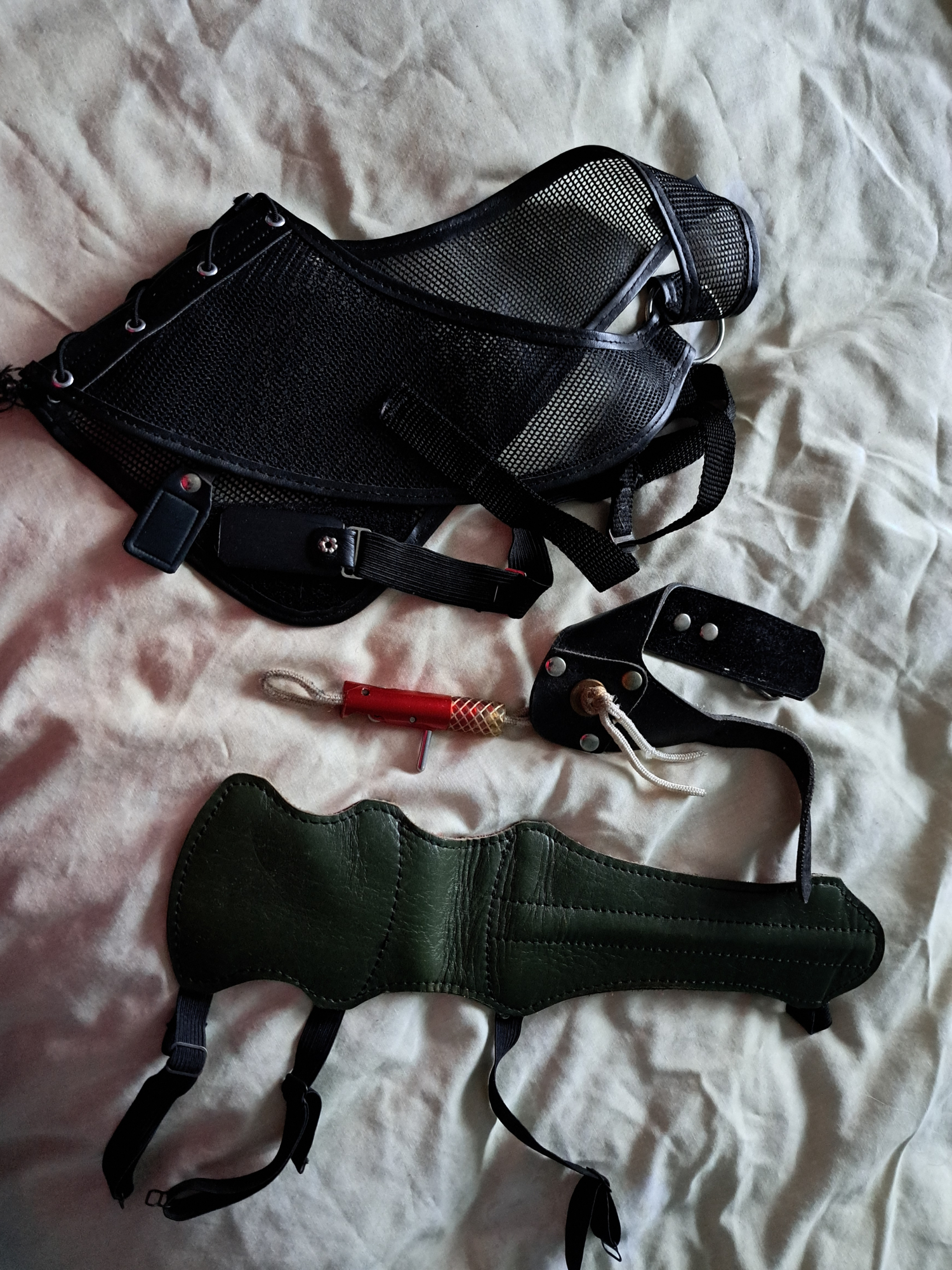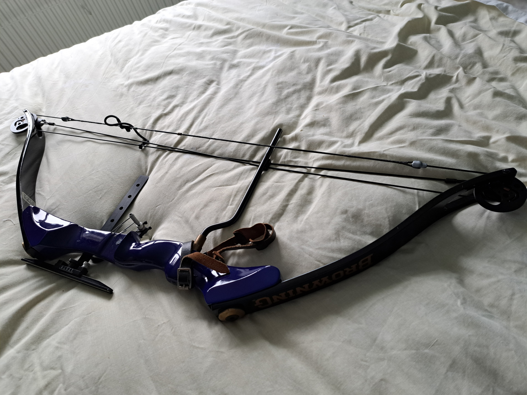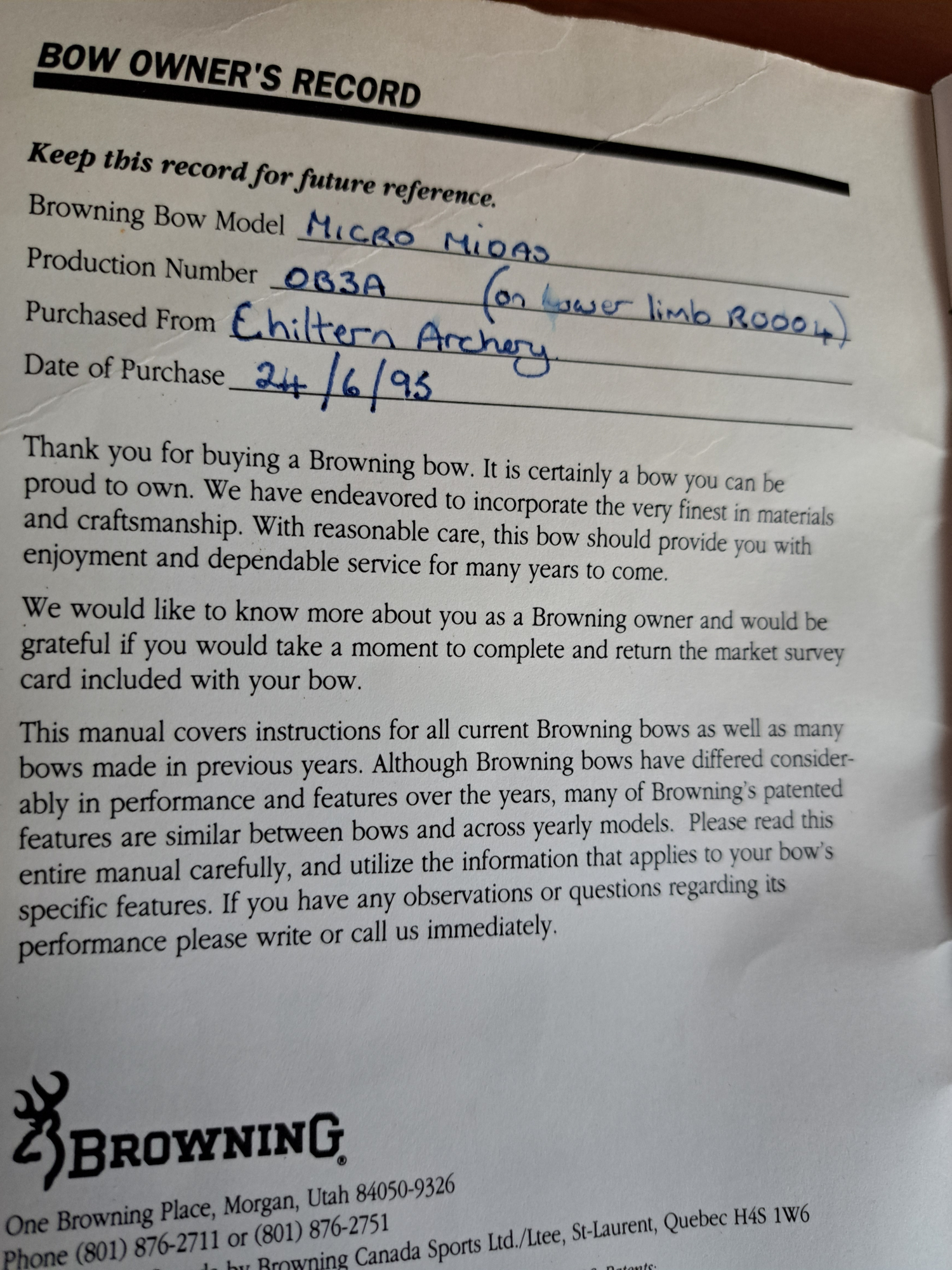 Collectors compound bow by Browning. Micro Midas, bought in 1995. This bow has not been re cabled therefore must be inspected by a qualified technician, not to be drawn. Also included are Browning arrows, 63cm, storage bag, stabiliser, scope sight, bow stand, fletching jig, release aid, chest guard, arm guard. There are a few spare nocks and fletches too. Also the original book from when the bow was bought.