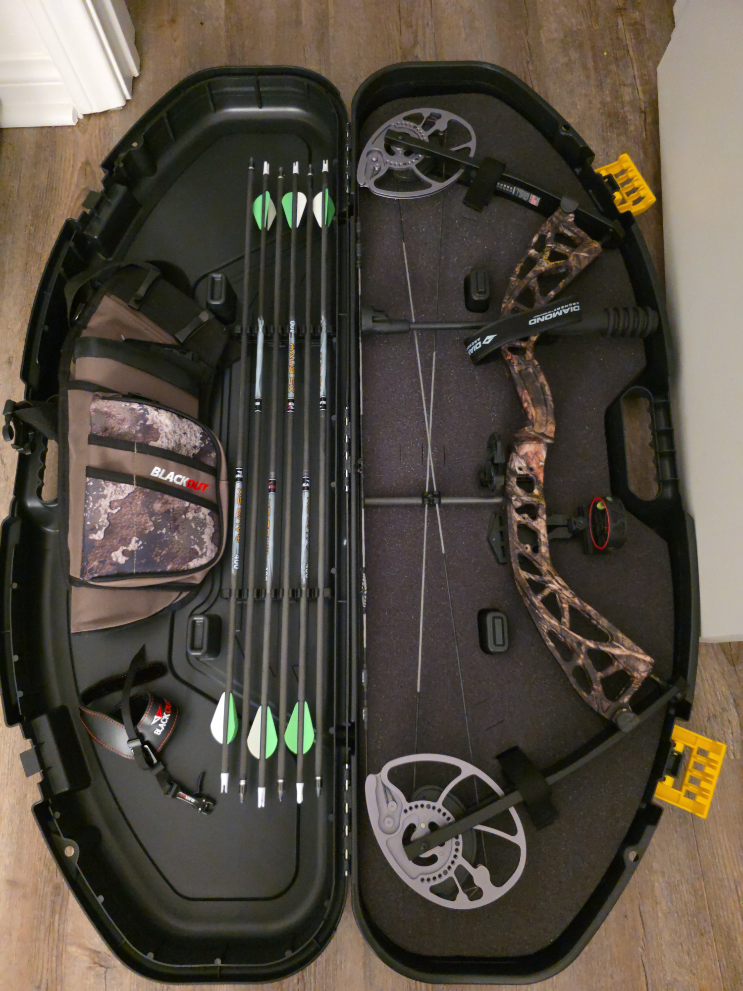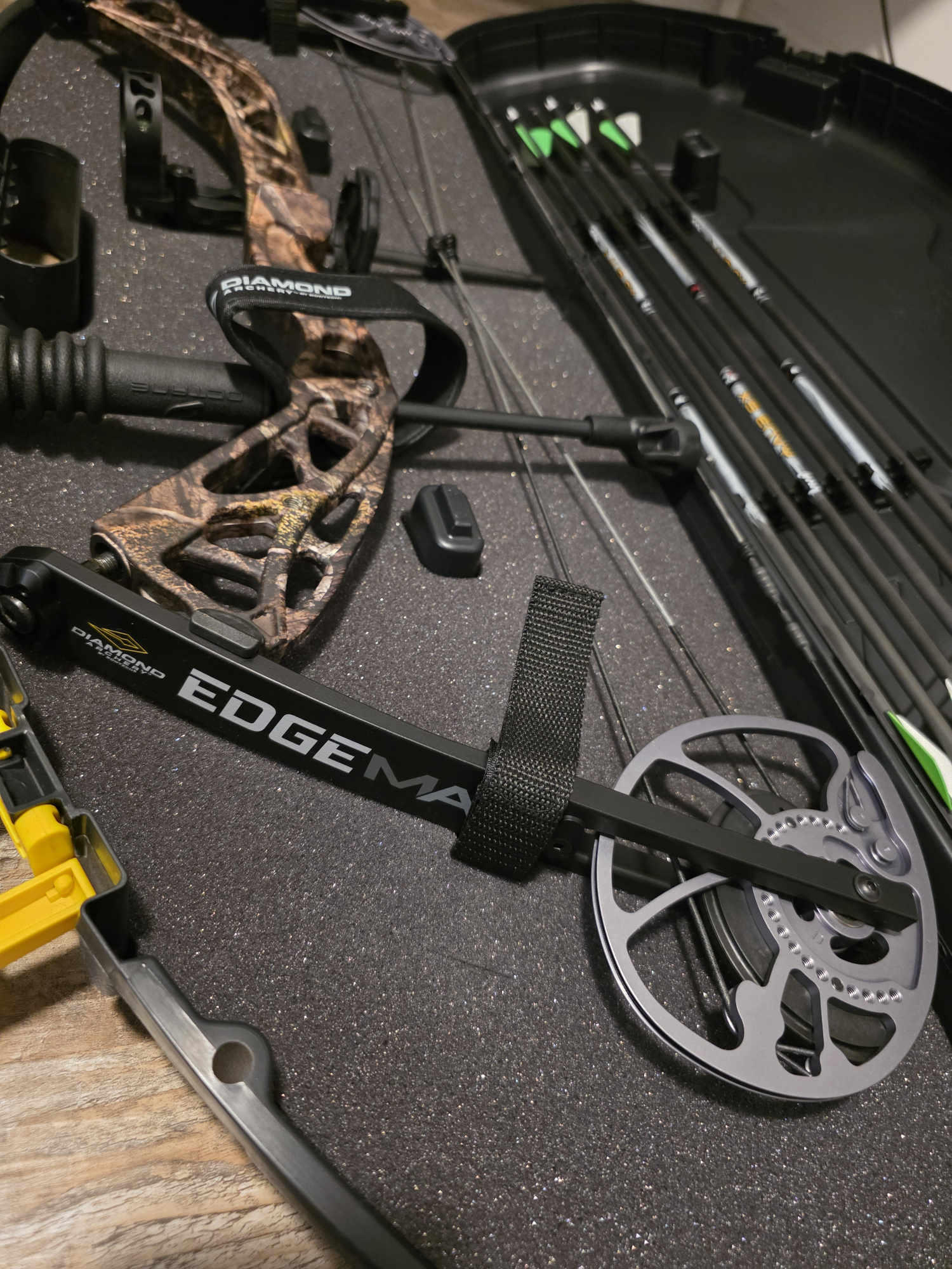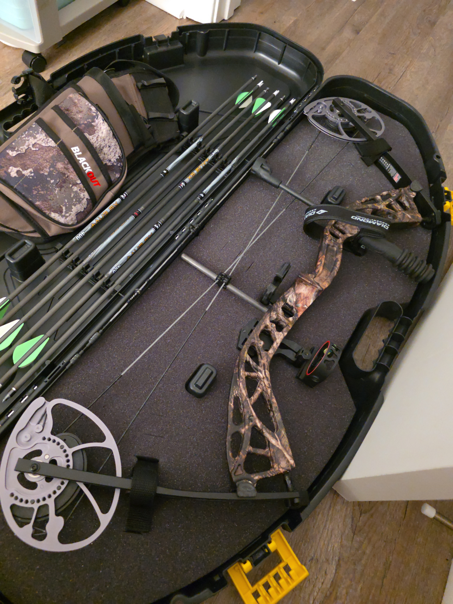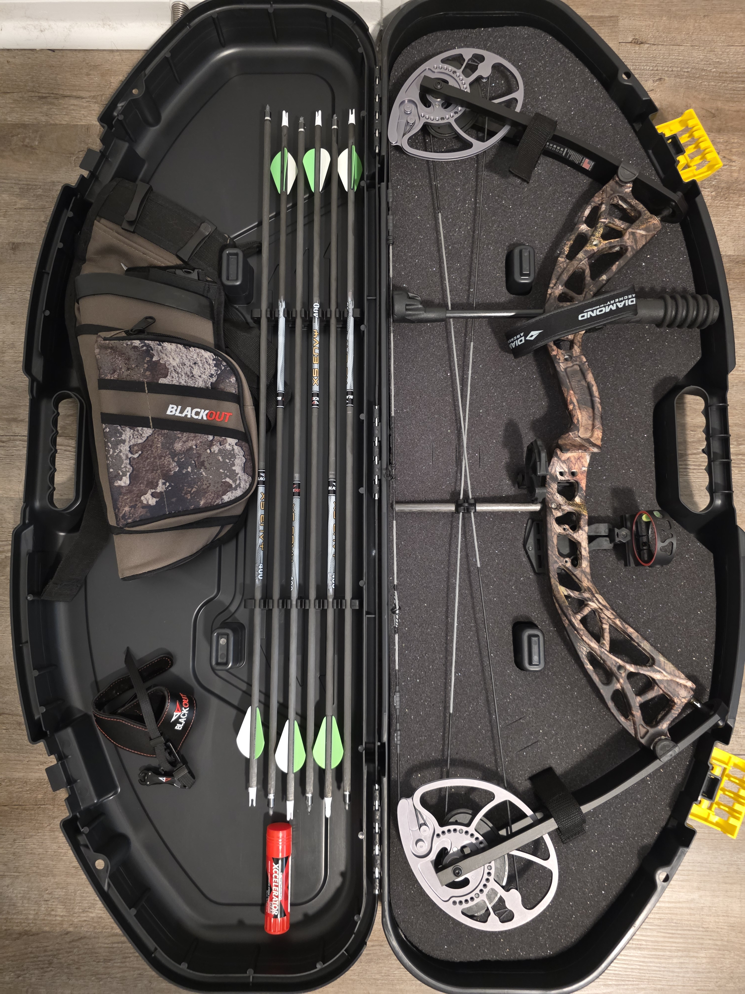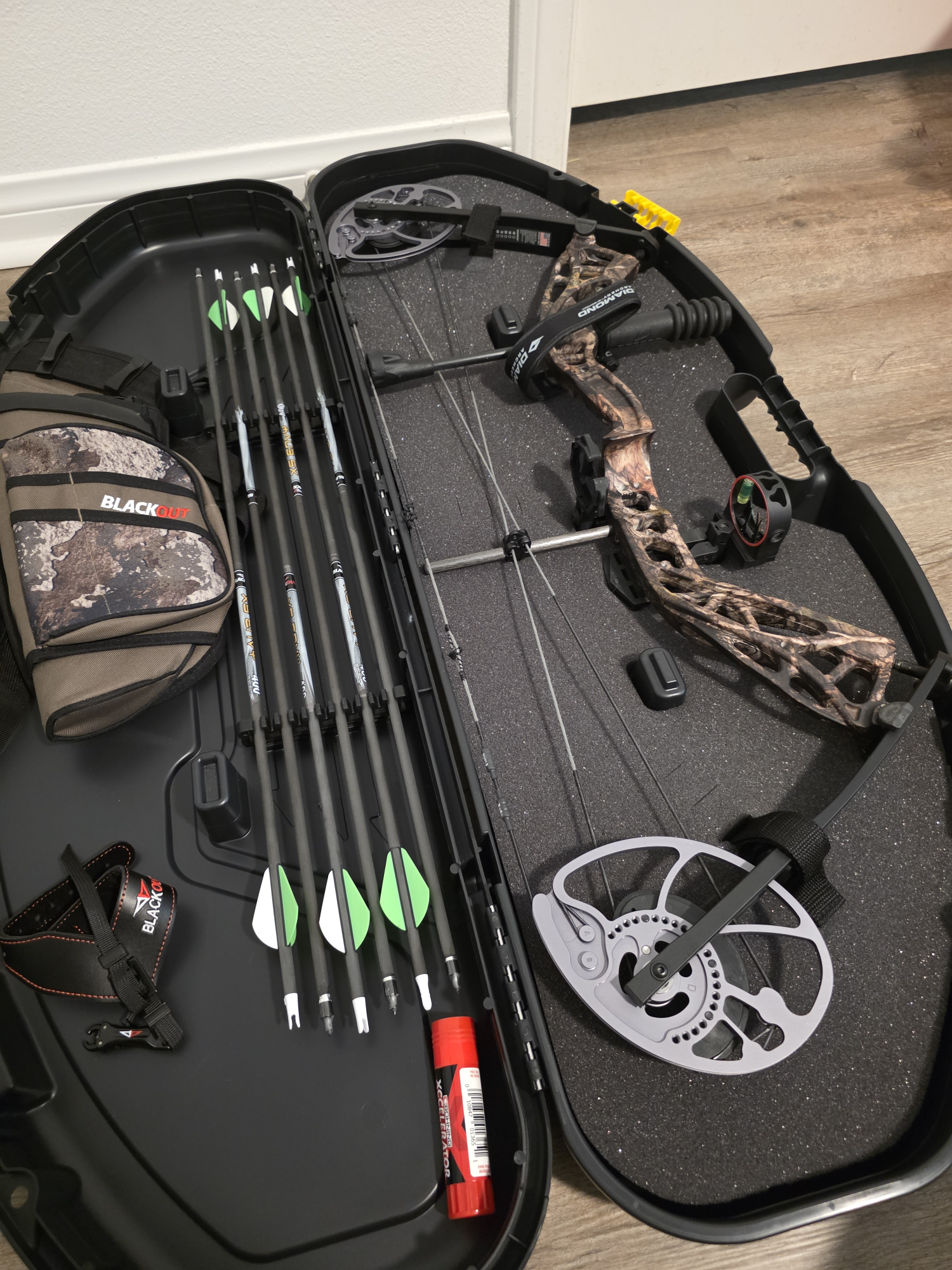 Brand new fired only 3 times in Bass Pro Shop complete set with additional arrows and range waist strap quiver i purchased seperately as well as hard side mount matching quiver the bow came with and case I purchased seperately. Adjustable 20-70 pounds.