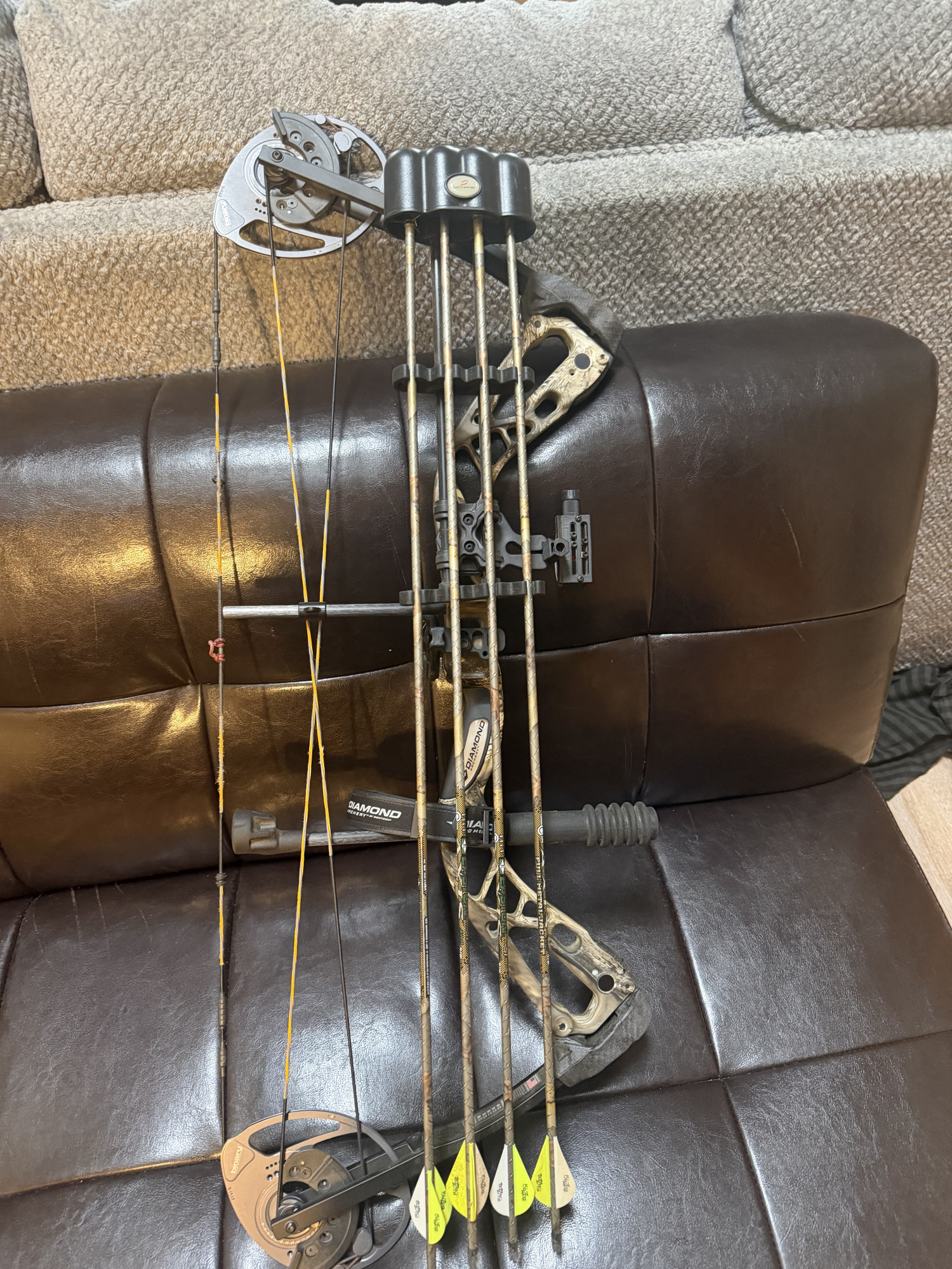 Diamond Edge 320 compound bow setup. Barely used. Full setup including Octane glow and lighted site with a Octane Quiver. Whisker arrow rest. This is a sweet setup that will go up to 70 lbs. Also includes a set of Full Metal jacket arrows with Target tips and hunting tips. All ready to go and practice and hunt. MSRP $469