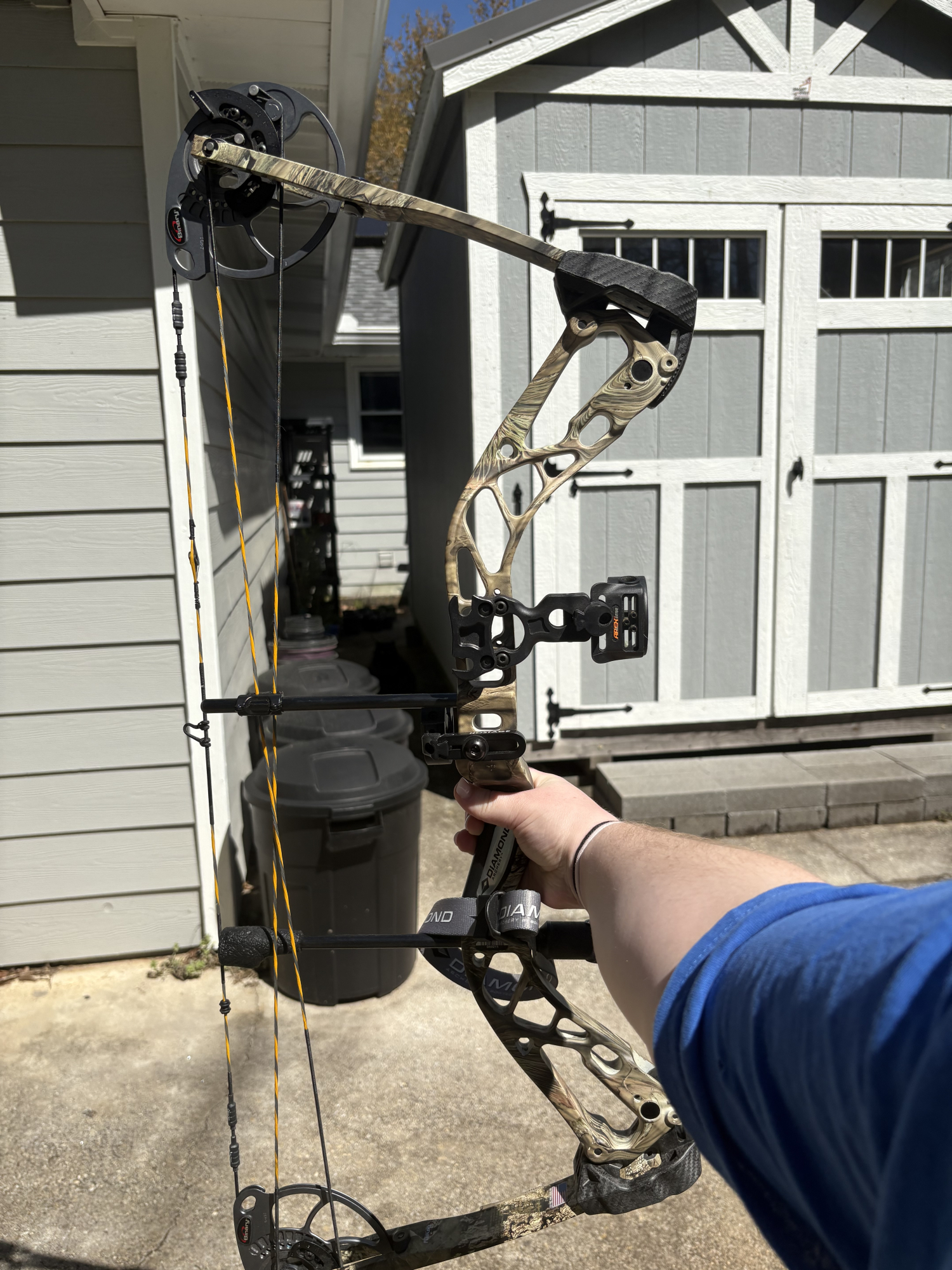 This is a Diamond Edge SB-1 bow, it is camo. It has an Apex Gear sight, Hostage arrow rest, and an Octane stabilizer. I do not have a quiver for this bow. It is in pretty good condition, it has hardly been used. The strings look like they are in good condition but may need to be changed just because of age.
