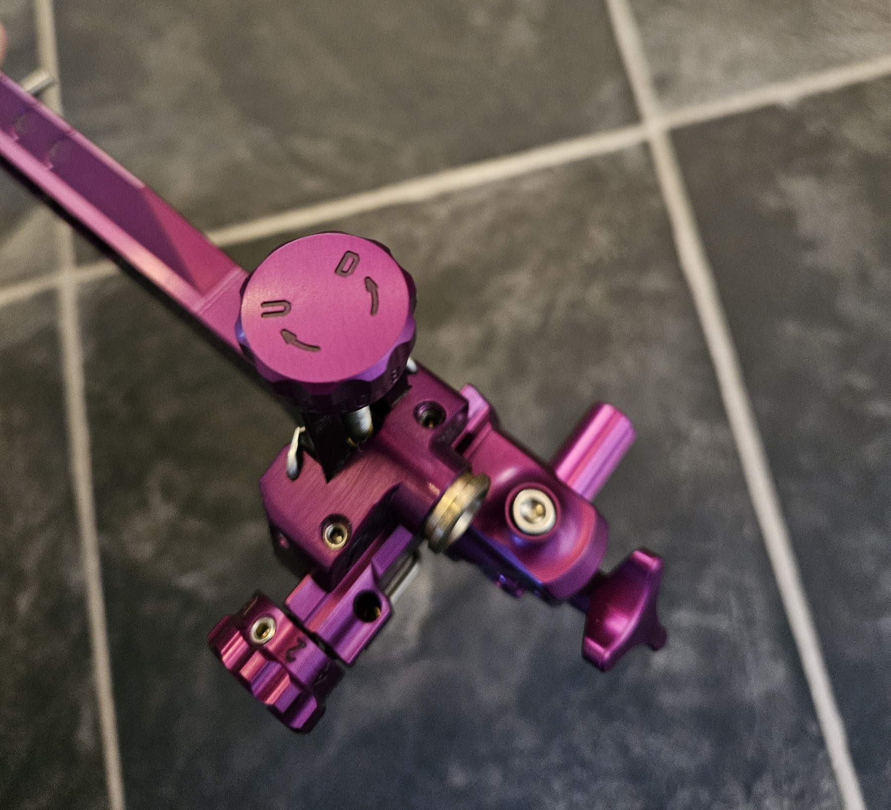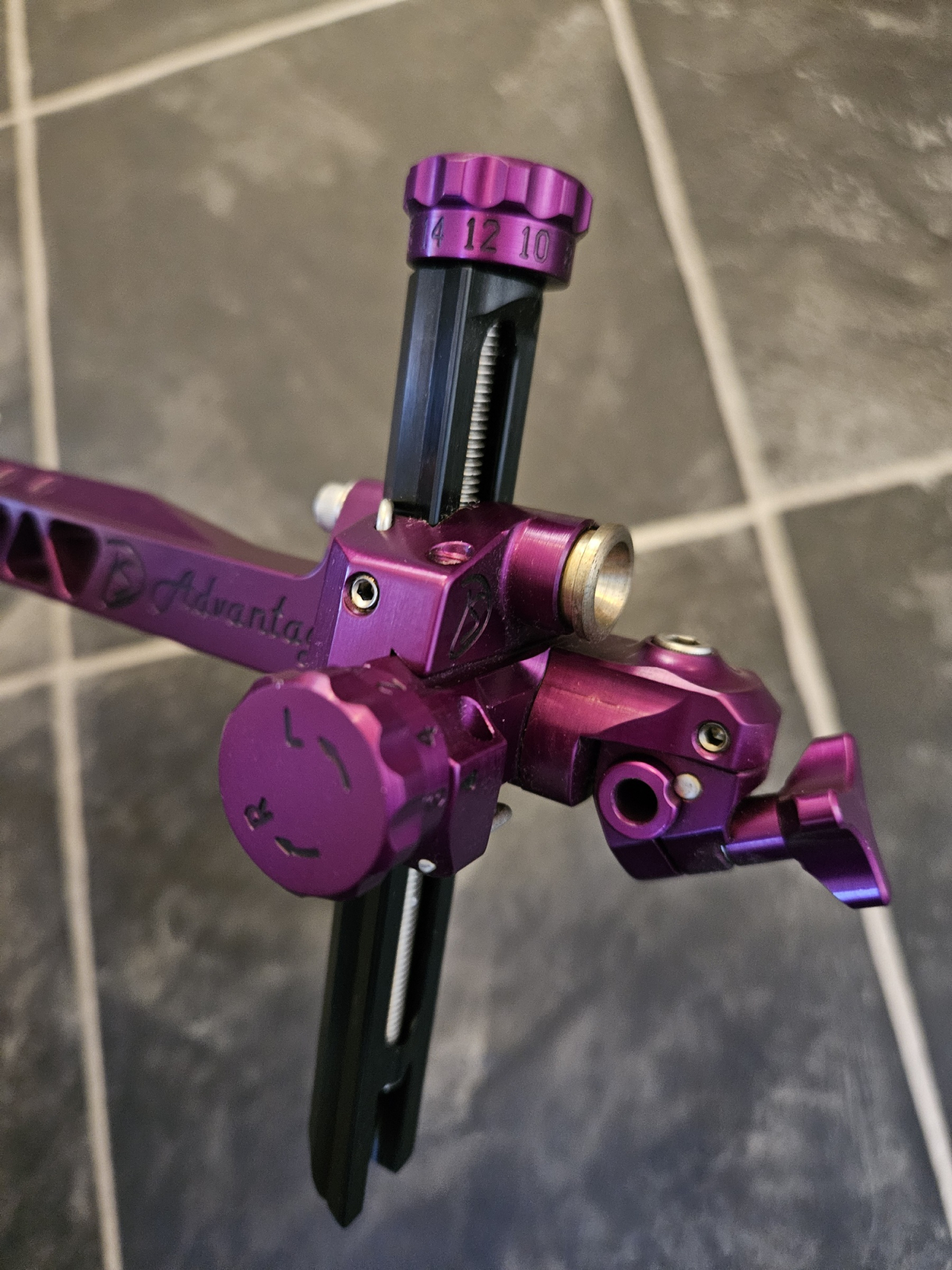 DS Advantage compound sight. Purple anodise. 9" extension. These sights, if you haven't come across them, are made to order as one-offs by a machinist in Canada and are therefore pretty hard to come by (and cost double this). Absolutely fantastic sights, quick adjust and all the adjustments you could want with a beautiful finish and colour. In near perfect condition.
