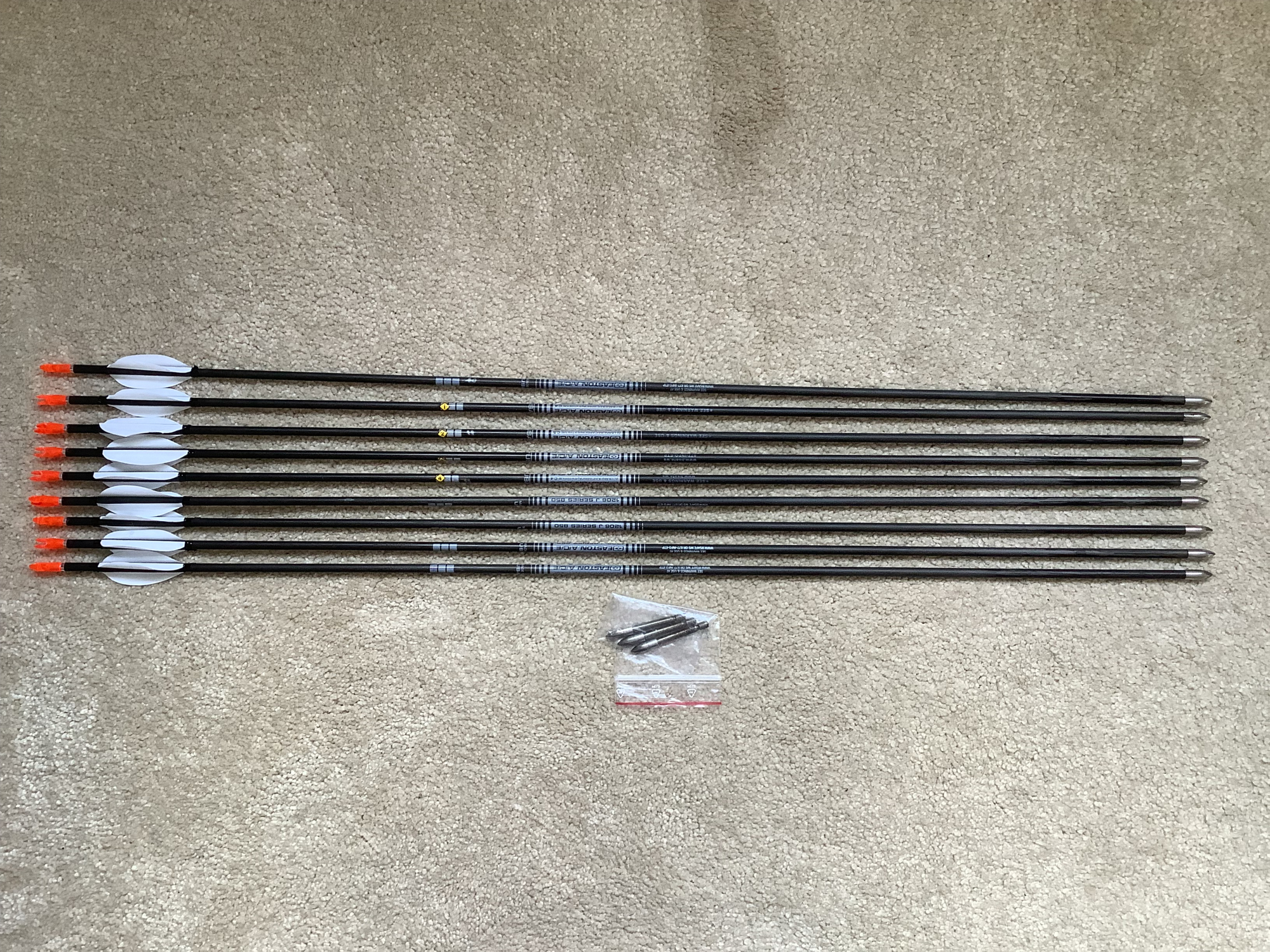 Easton ACE 850 9 arrows used. Comes with nock pin, beiter nock and steel points. Length nocks groove groove to tip of point 26 4/16”. Postage not included, can pick up from Kent.