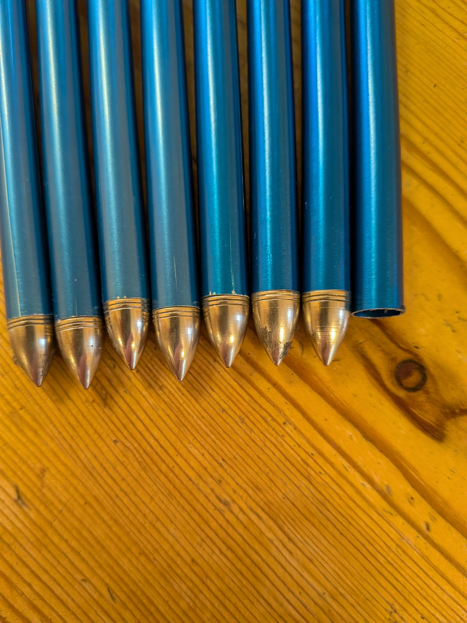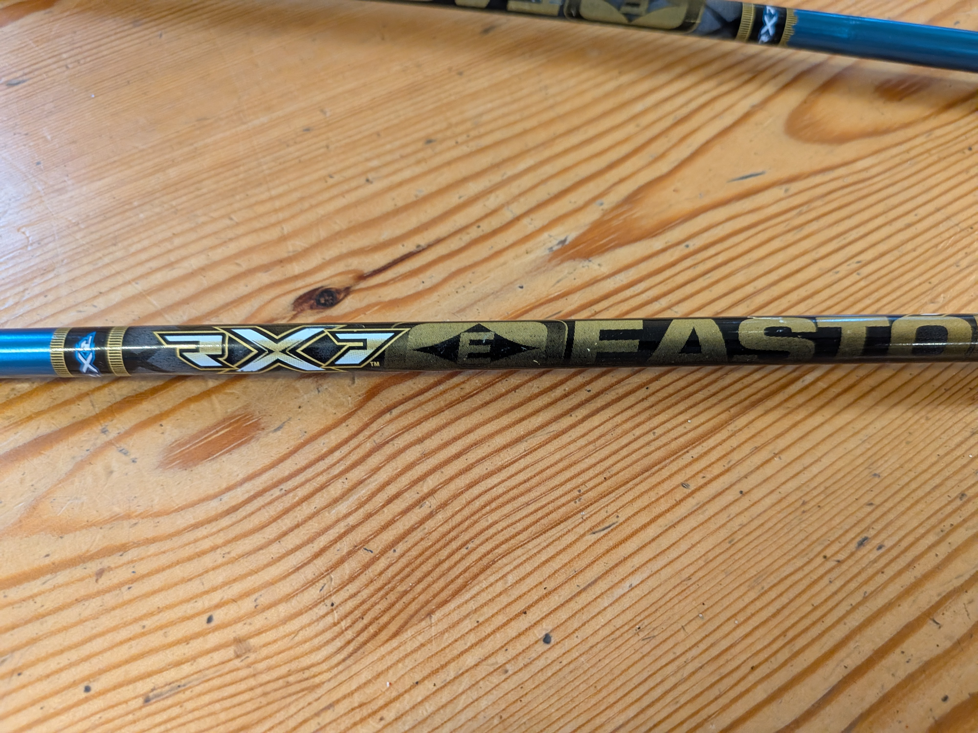 7 x Easton RX7 arrows with Bohning 4" Bronco vanes and Easton points and small nocks plus one spare shaft. Used but in very good condition - see photos.