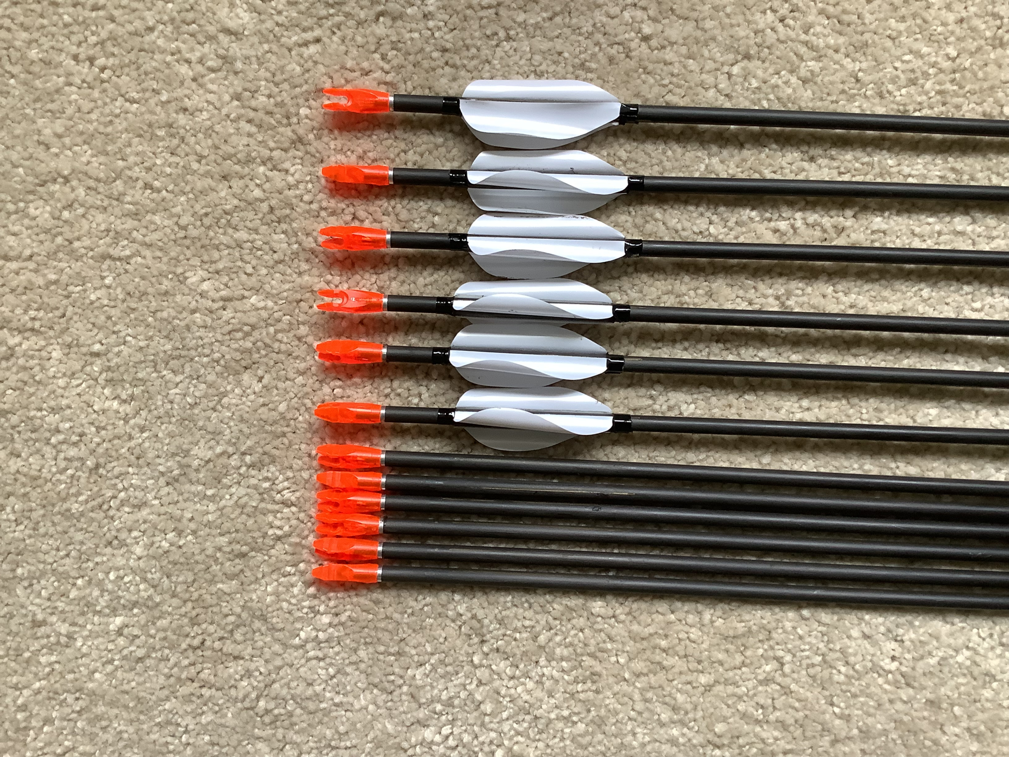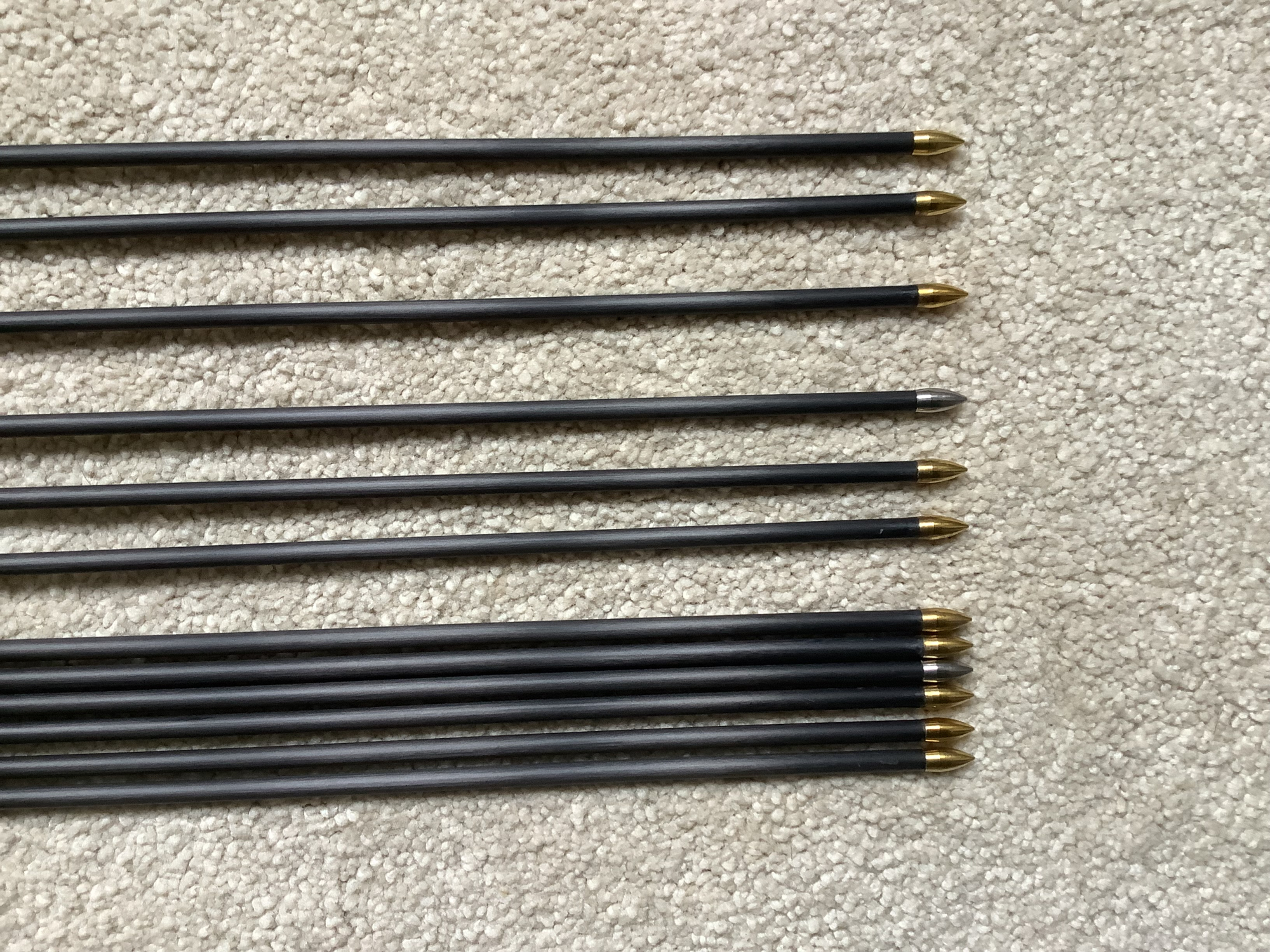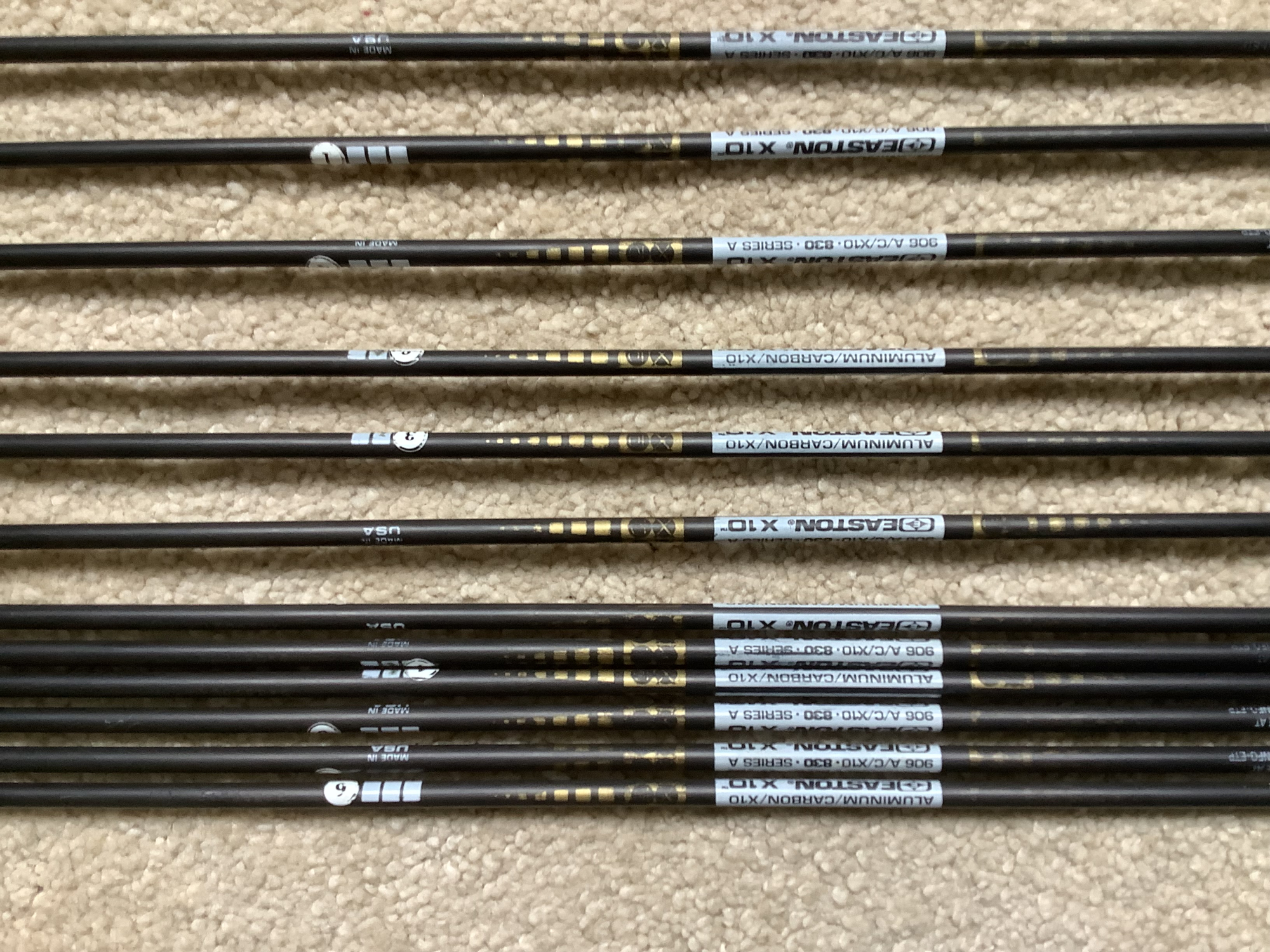 12 Easton X10 arrows 830s C1 made up of two batch numbers. 10 have Merlin tungsten points, 2 have Easton tungsten points. Length arrow tip to nock groove 26 3/8” used as a set. Selling as I have switched to ACE. Postage not included.