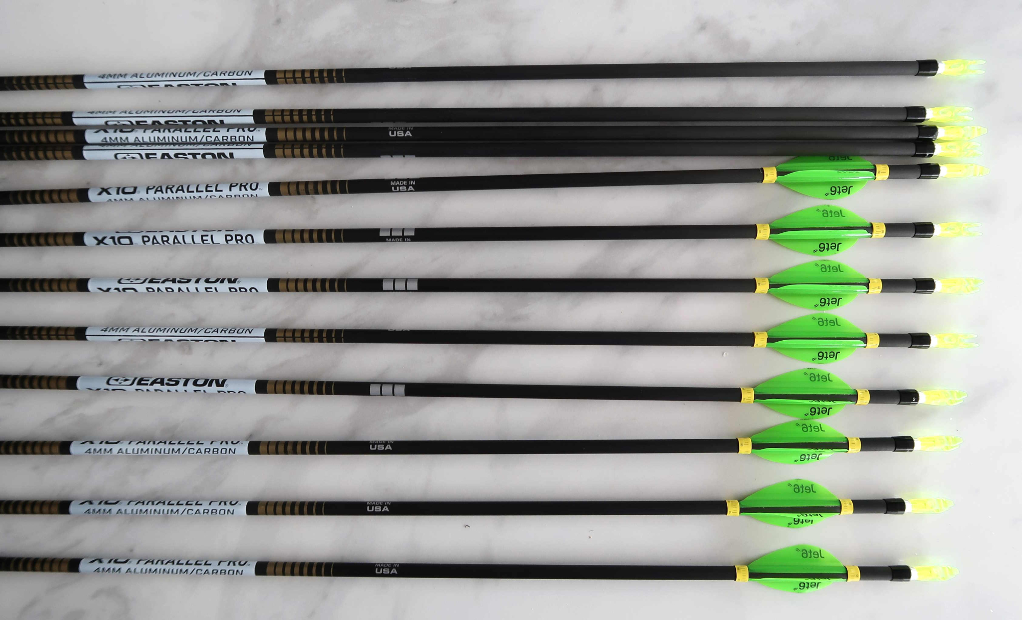 Easton X10 Parallel Pro 4mm Shafts 660 C. Comes with points and nocks, 8 off are fletched. Shafts cut to 29.5 inches inc points.