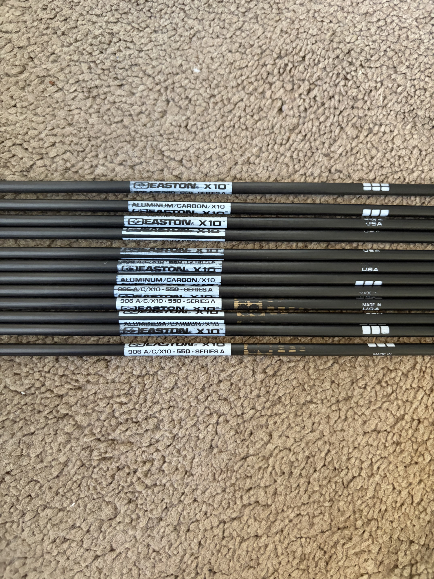 Used 1 doz Easton X10 shafts with pins. 550 spine. Shaft length 26.5”.