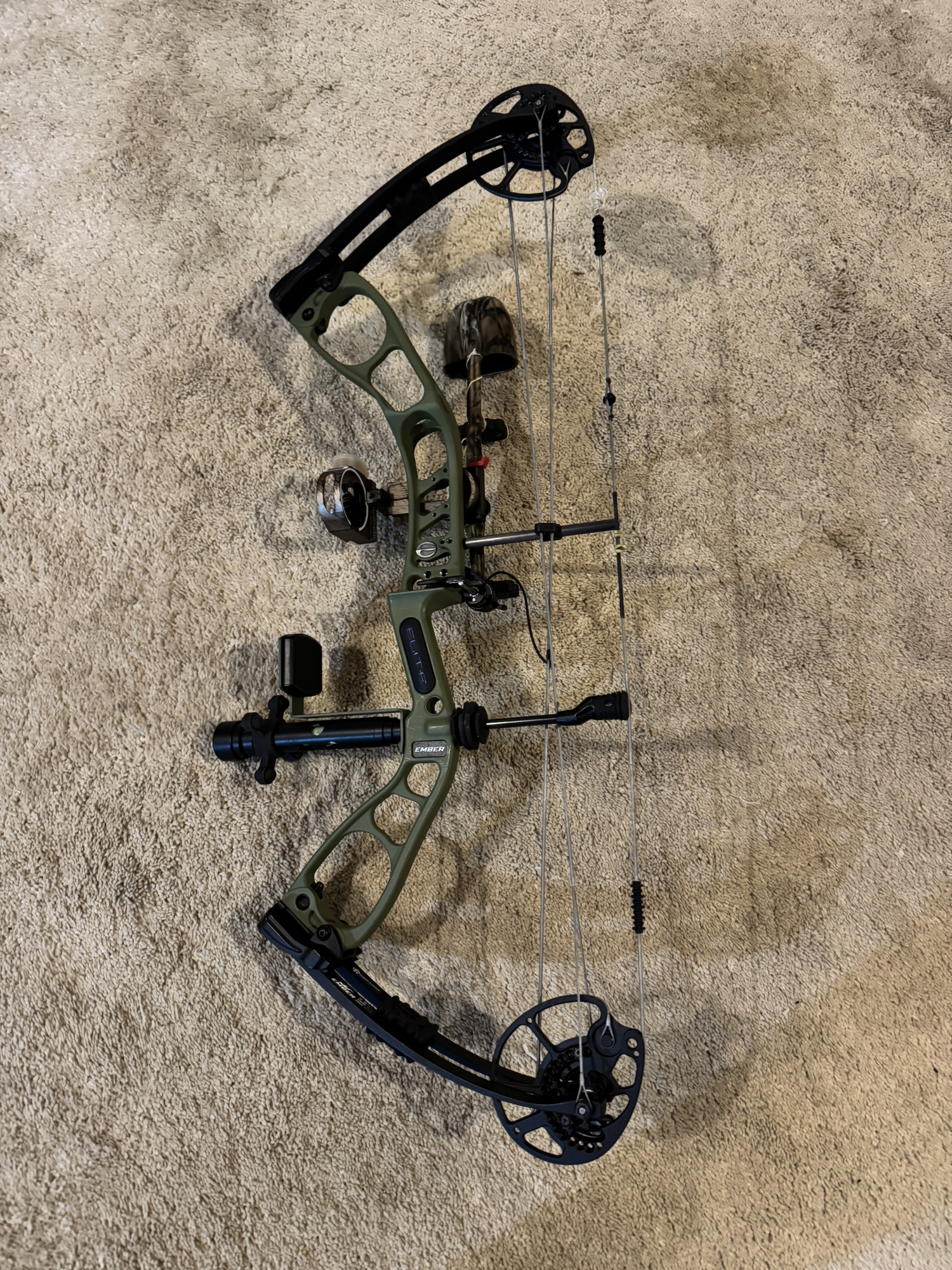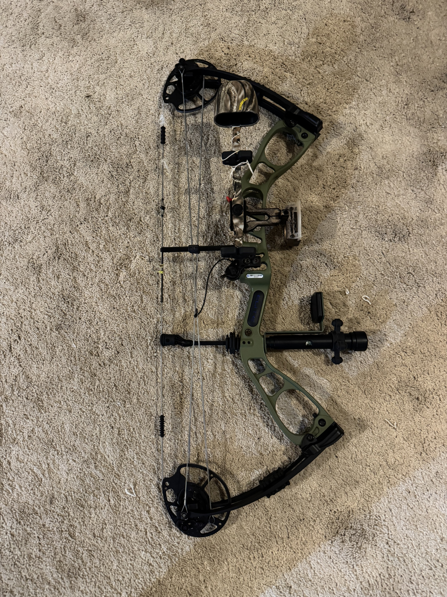 400 obo comes with qad rest standard peep sight 3 pin sight and quiver.Has some wear on the strings new strings most likely needed for next hunting season. 10-60 pound draw weight and 15-29 inch draw length. Great bow for kid getting into hunting or archery. Used for hunting 2 years bow came out in 2020 got it and it’s sat for 3 years. Sat from 2020-2023. Good condition still shoots perfect and has good groupings.