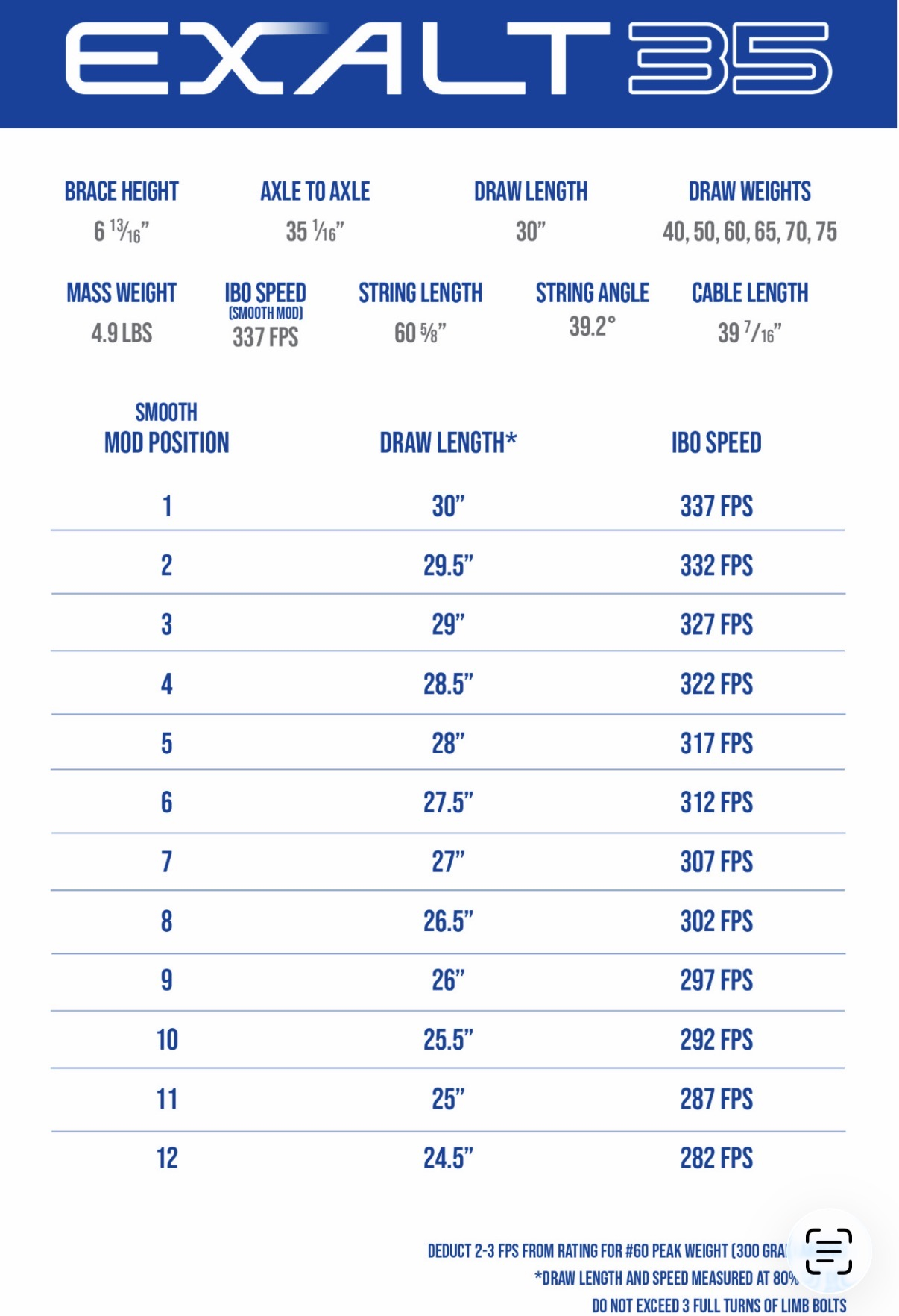 This bow goes from 50 lbs to 60 lbs and draw length from 24.5" to 30" with 1/4" adjustment.