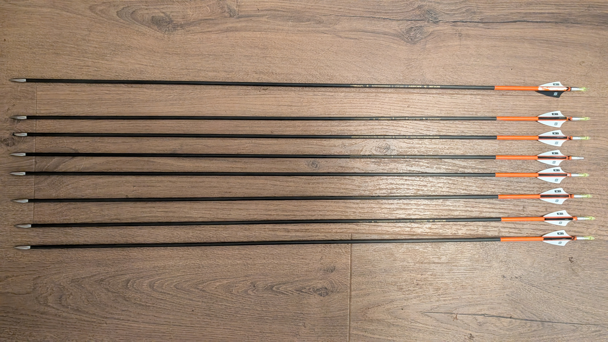 Arrows 3 - Skylon Paragon 3.2 500 - 4 unfletched with no points, 29.5", 7 fletched and ready to shoot, 1 needs refletching, all have mybo wraps with pin nocks, currently fletched with Bohning 1.5" Shield X Vanes