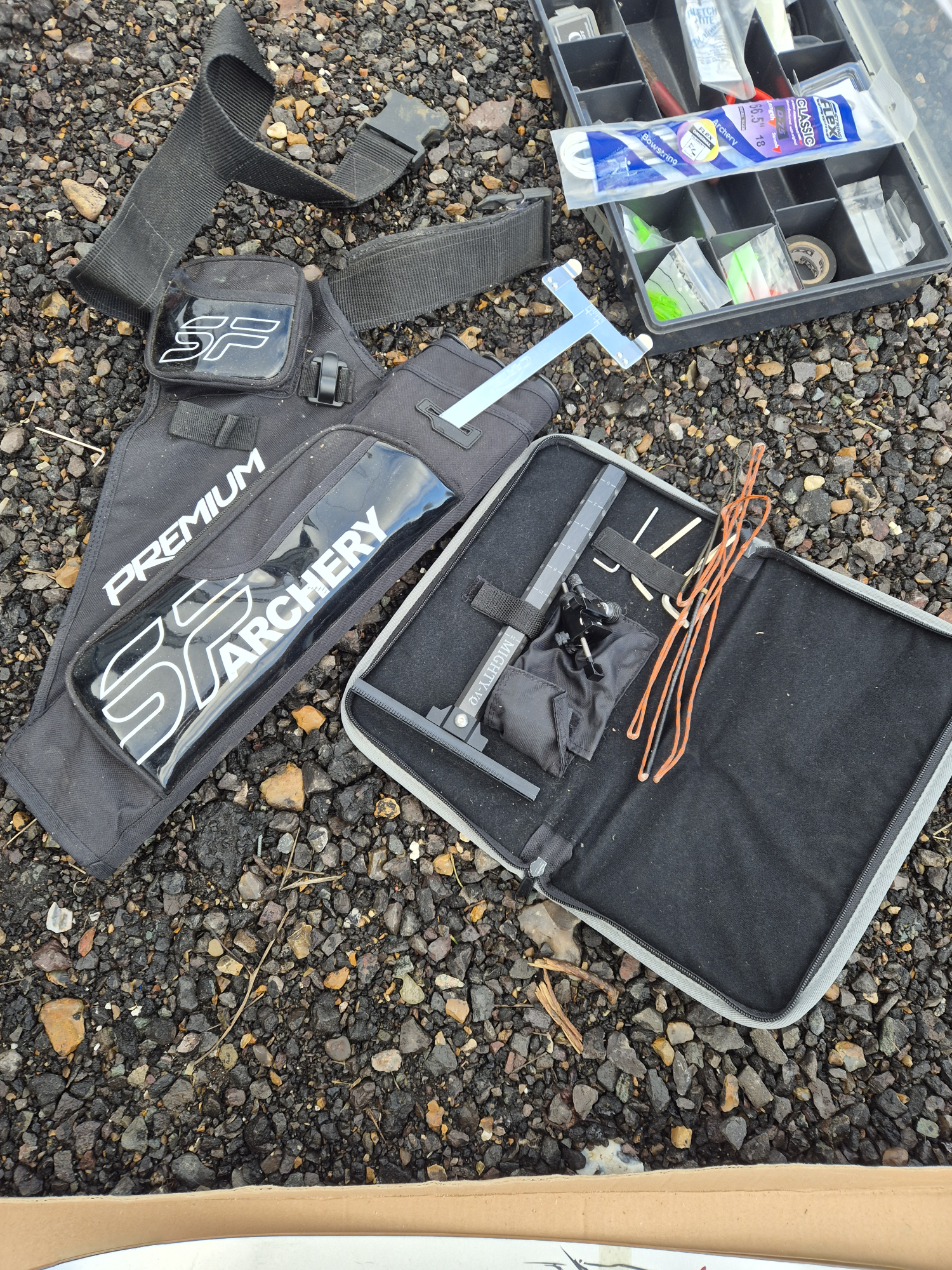 Quiver, arm guard, bow stand, 2x bow strings, spare nocks and fletchings.