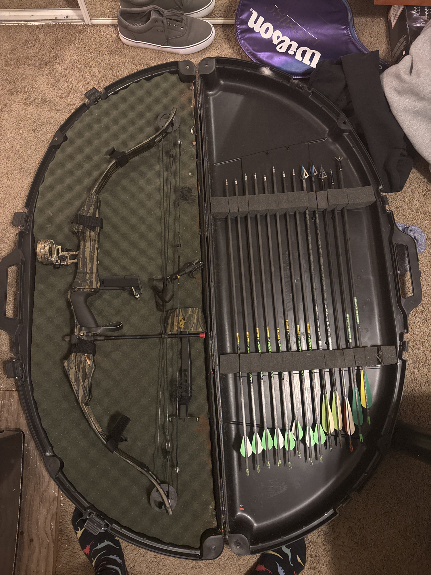 The bow is in overall great shape. The string got re waxed after I took it to Bowie Outfitters just to have it looked at. There is a slight crack at one end but they said that it was a paint crack not the actual bow. Also stated it to be around 55 lb draw weight. The sight is as far as I know is not sighted. I got a case, several arrows some field tips the others are hunting. Also has a small quiver, and a quick release.