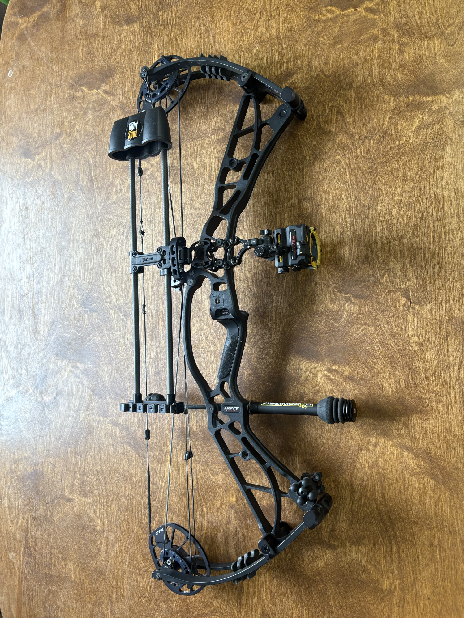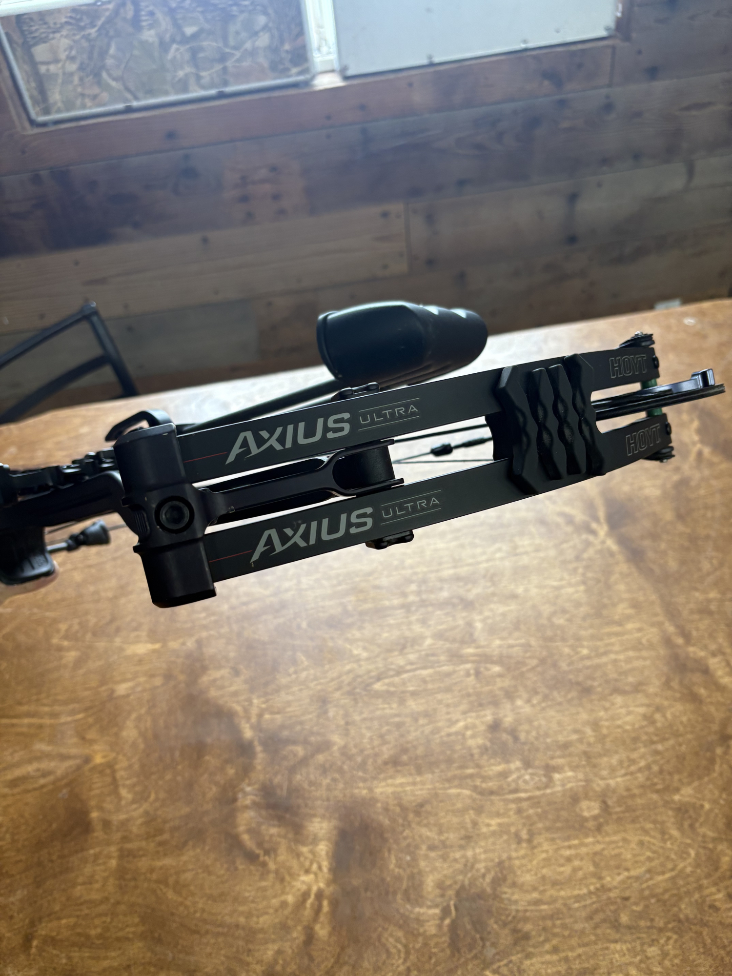 Right handed Hoyt Axius Ultra, comes with trophy ridge 5 pin horizontal sight. Bee stinger stabilizer, tight spot quiver.