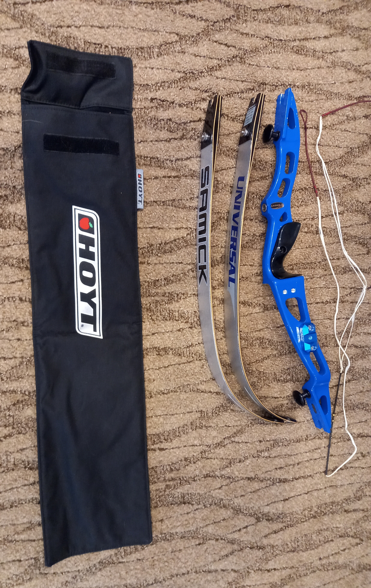 Hoyt Excel recurve handle (23”), Samick universal recurve limbs (26lbs), Bow stringer, Fivics chest guard, Scoring pad (longshot), Carter carbon stabiliser rod, Arm guard, Bow stand, Easton Jaz aluminium arrows x8 (25”), Easton 1516 XX75 patinum plus aluminium arrows x 8 (27”), SF premium sight and case (well used).