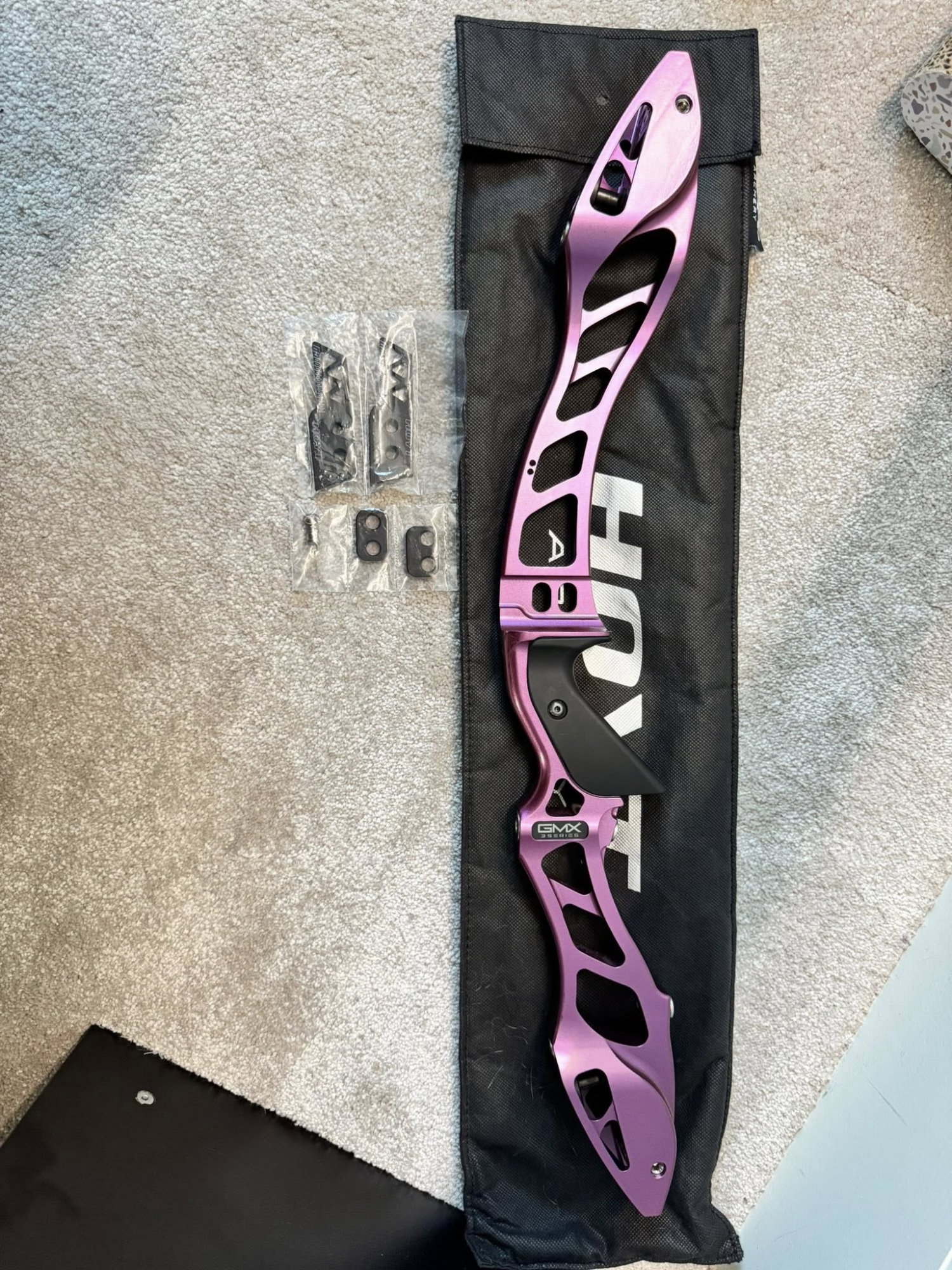 Hoyt GMX 25” RH. £375 plus postage (open to sensible offers). Has some usage marks but doesn’t affect how it works. Comes with Hoyt sleeve, new clicker plates (mid and high) and original grip.