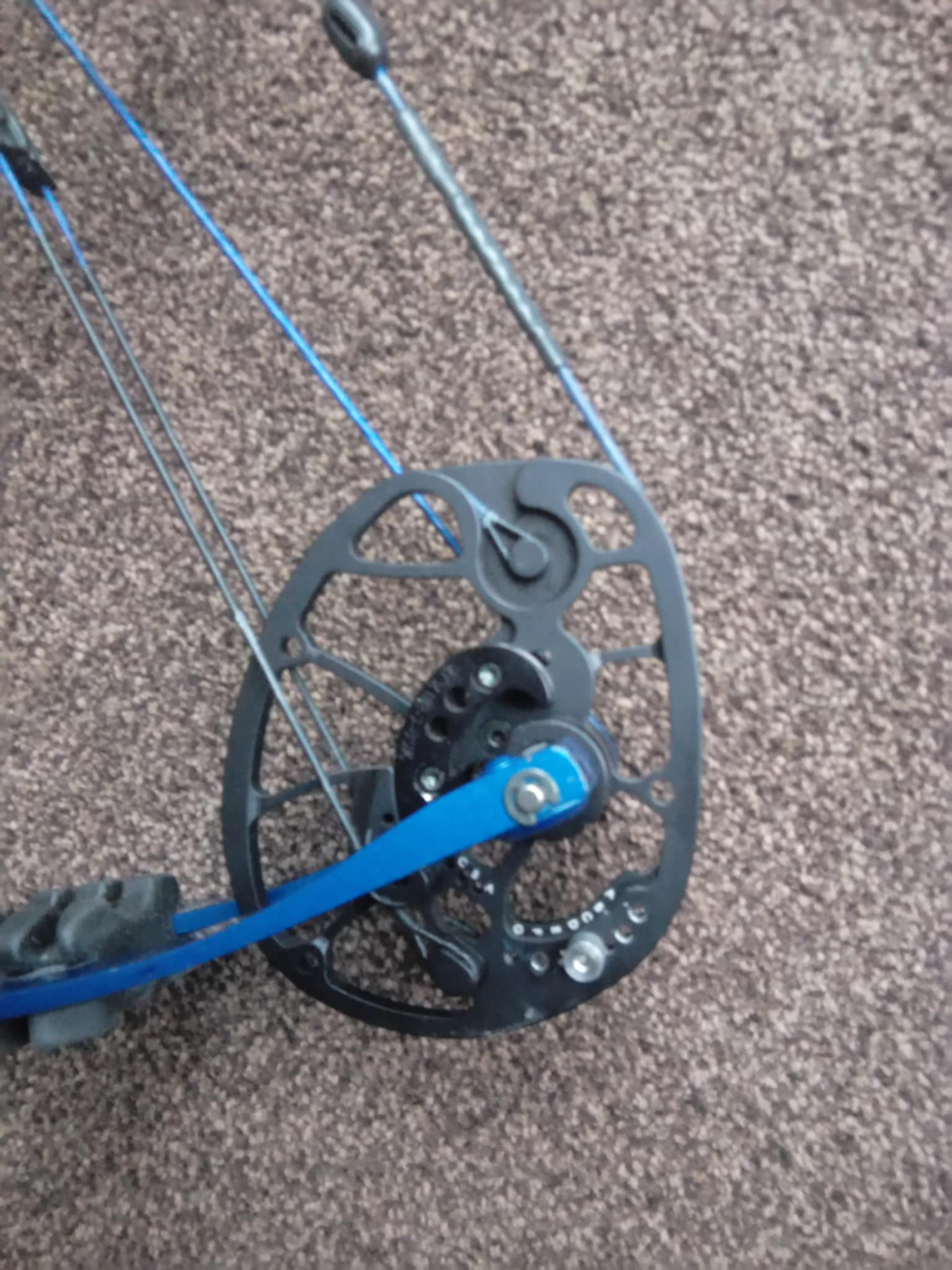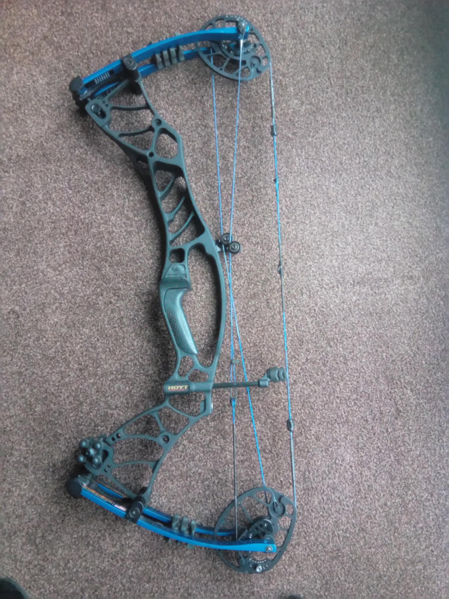 Right hand Hoyt Helix (2019) compound bow. Black with blue limbs. Draw length 25 to 28 inches, poundage 30 to 40 lbs.
