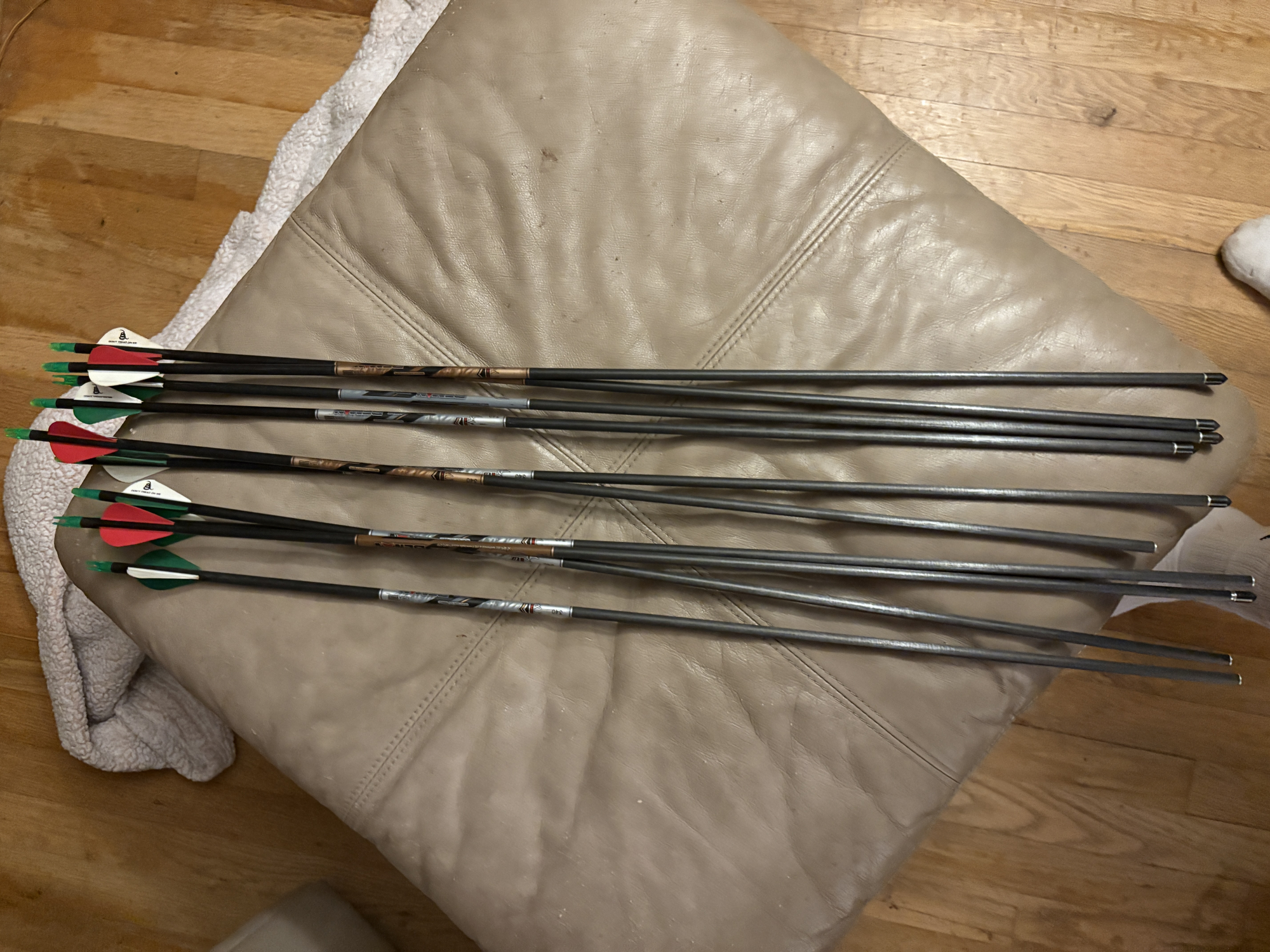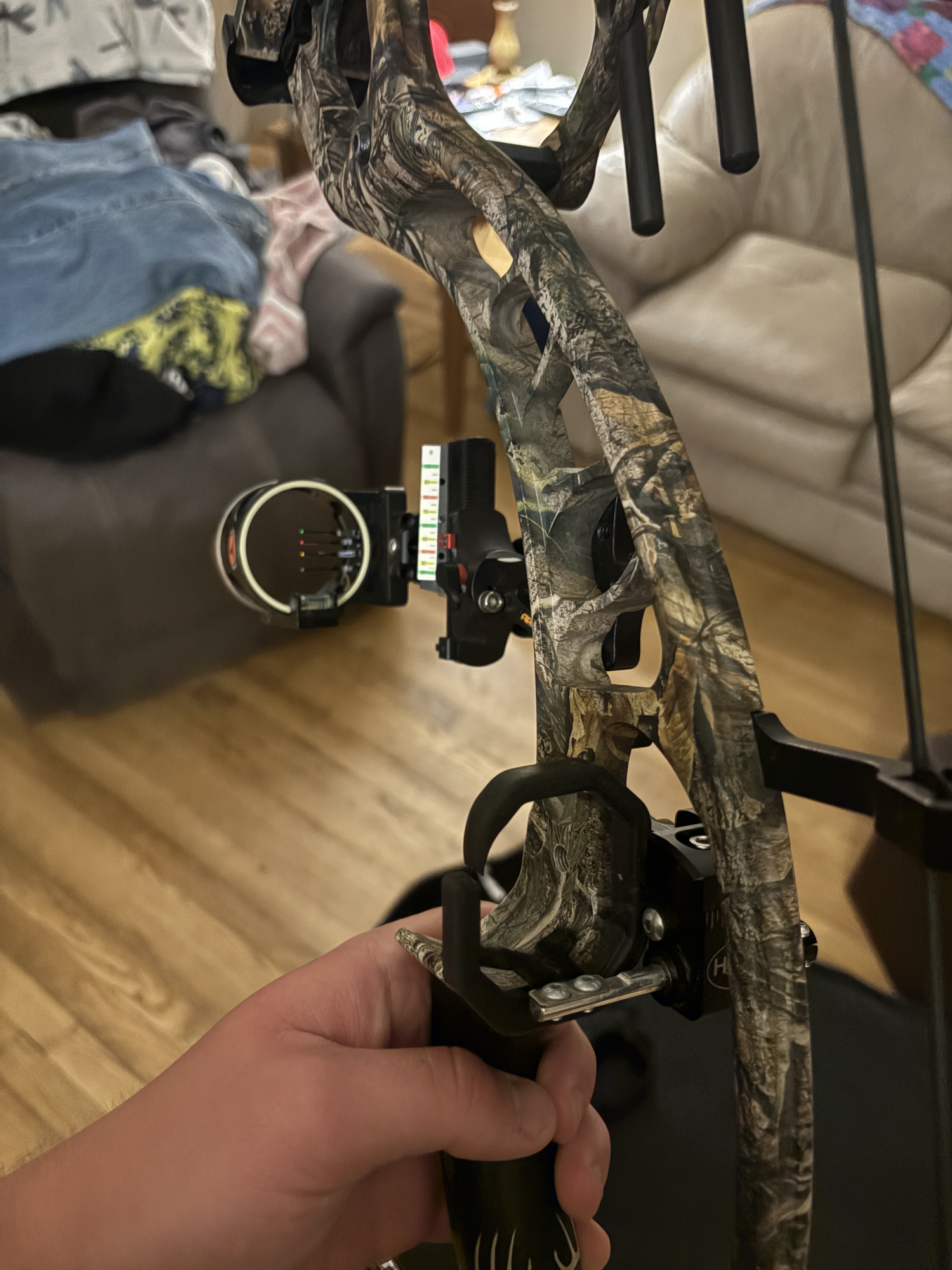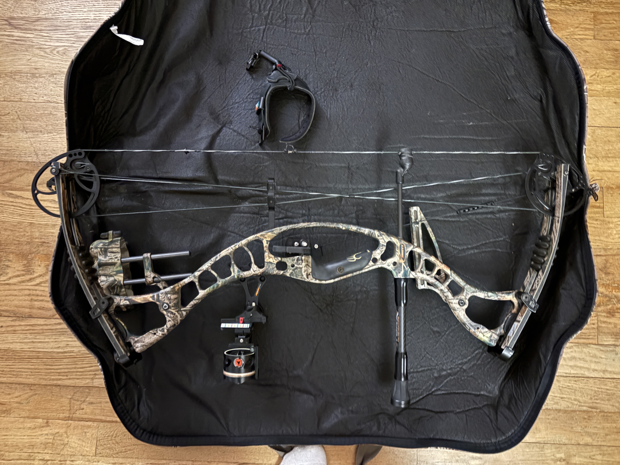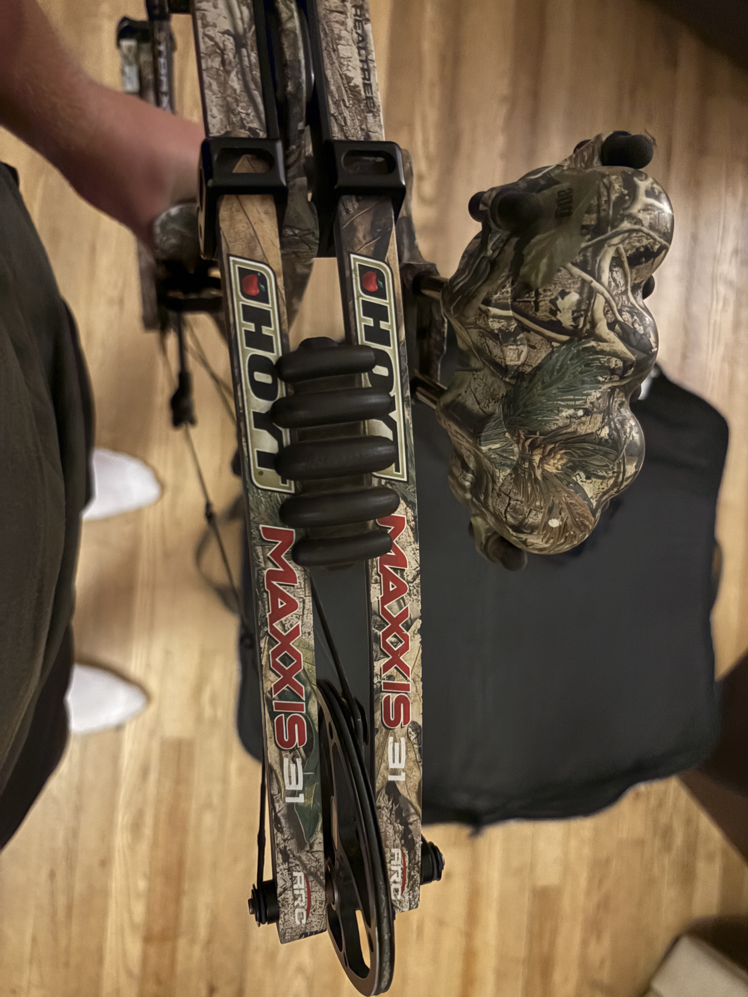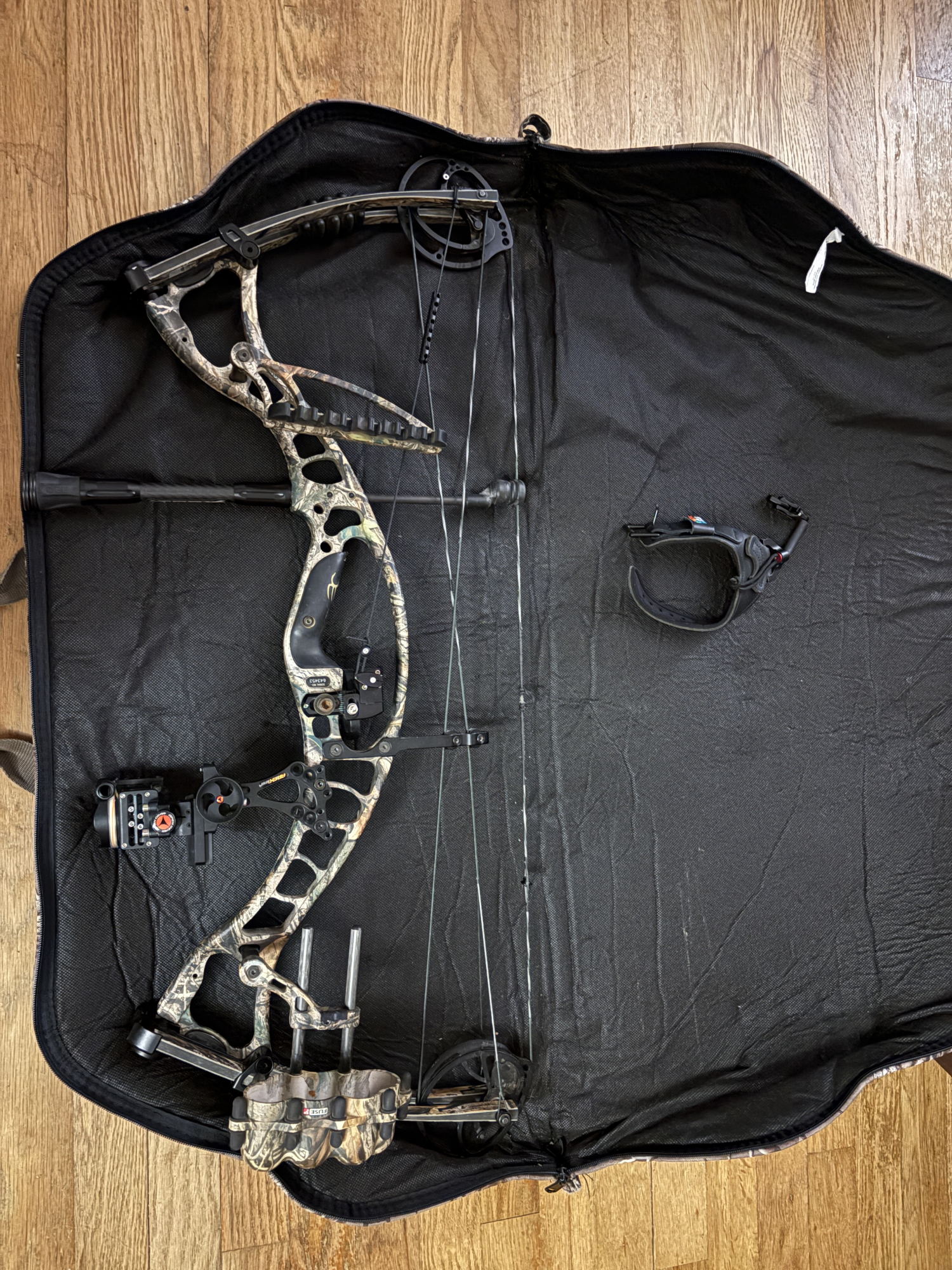 Hoyt maxxis 31. 27-30” draw length, 50-60 lbs draw weight, apex gear 4 pin slider sight with sight tapes, 10 beman 6mm arrows, trigger release, case, hamskea primer arrow rest, and a gas string that is still in good shape.