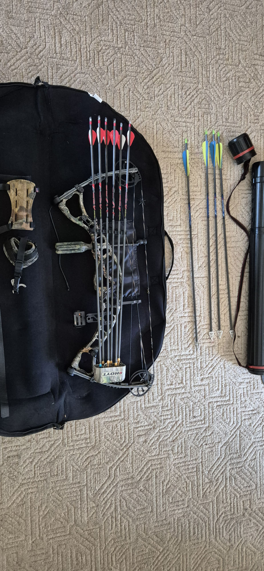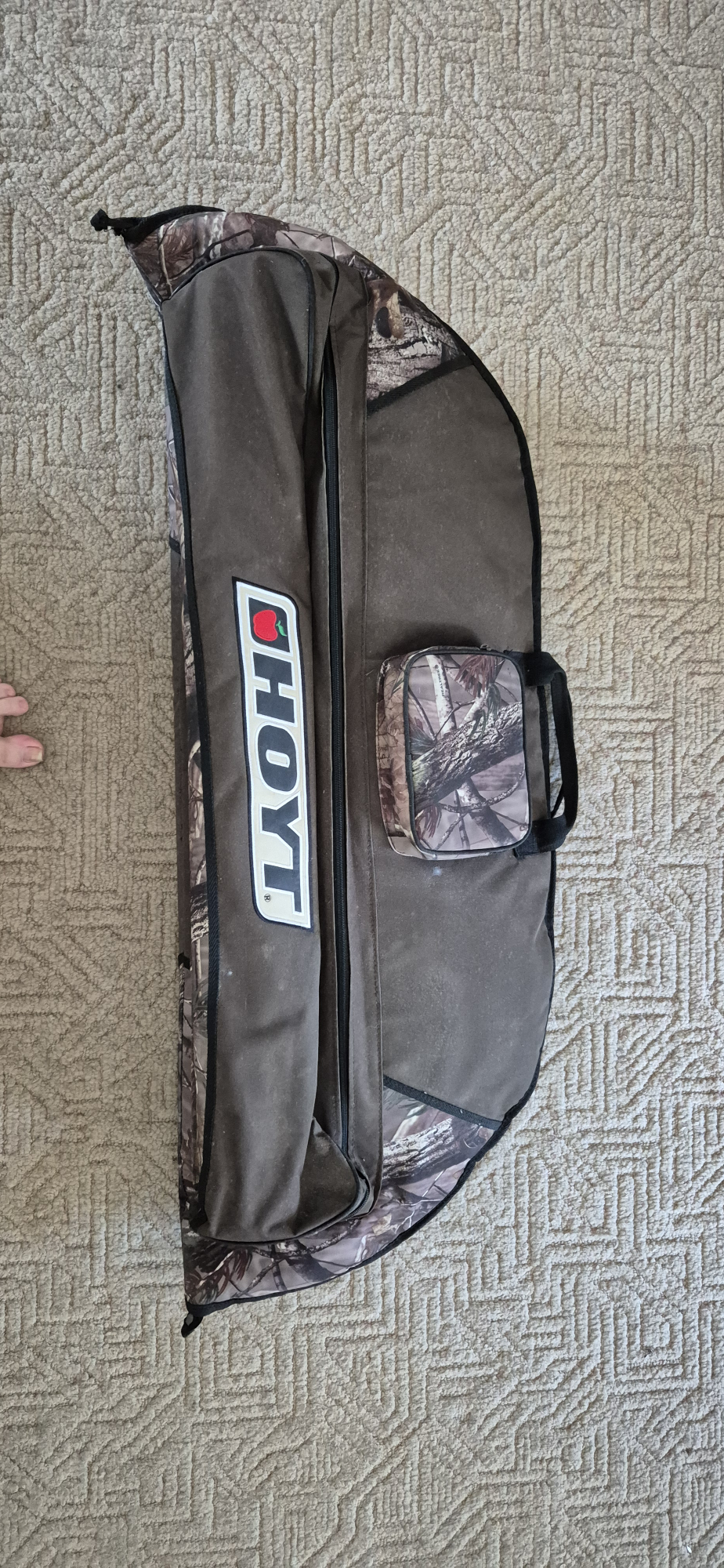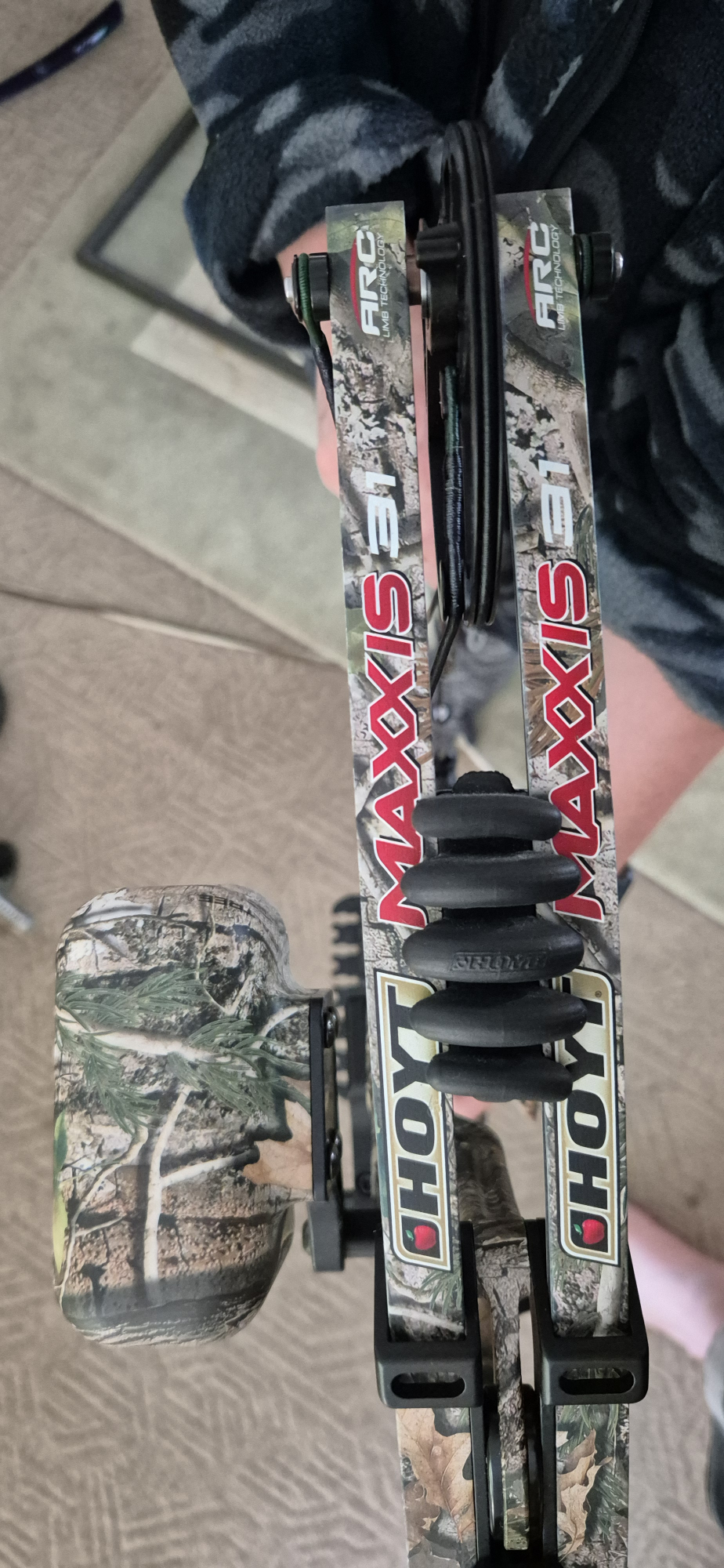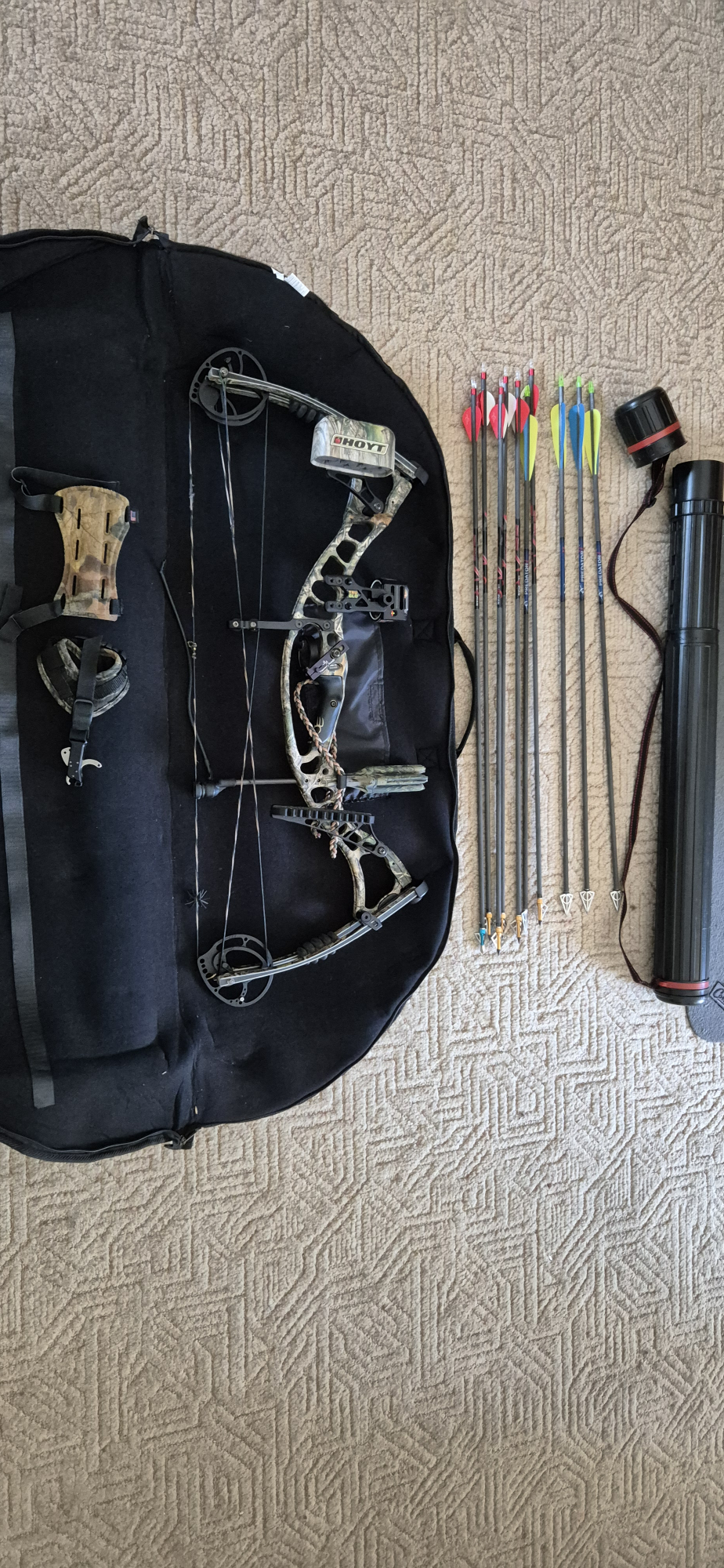 This much loved and hardly ever used Hoyt Maxxis 80 pound compound Bow has real tree camo, has true glow optics, fuse silencer and Hoyt arrow rack on bow. It comes with 10 hunting arrows, a wrist slap and a hunting string trigger release and Hoyt real tree camo bag. It is a must for any hunting enthusiast.