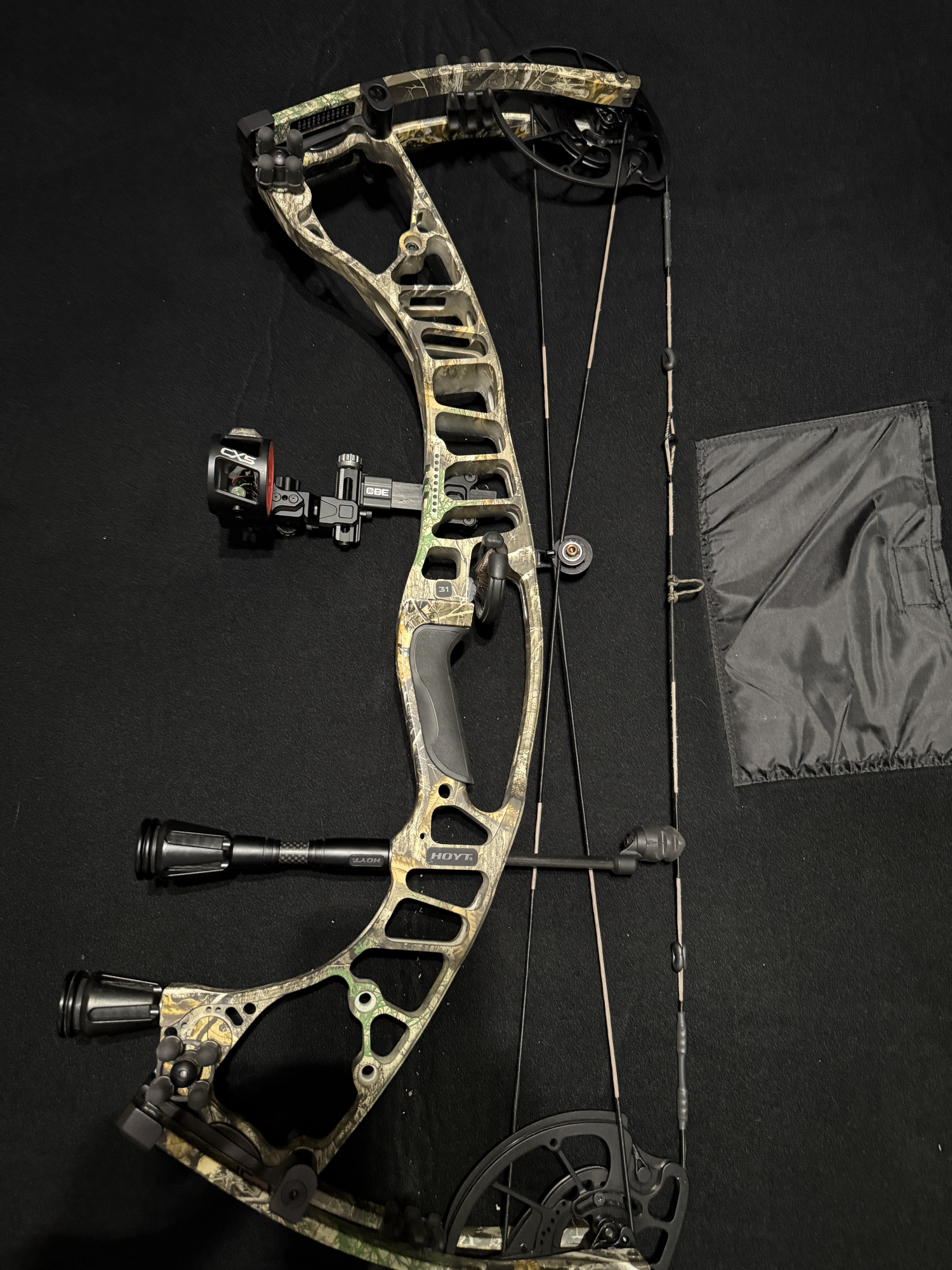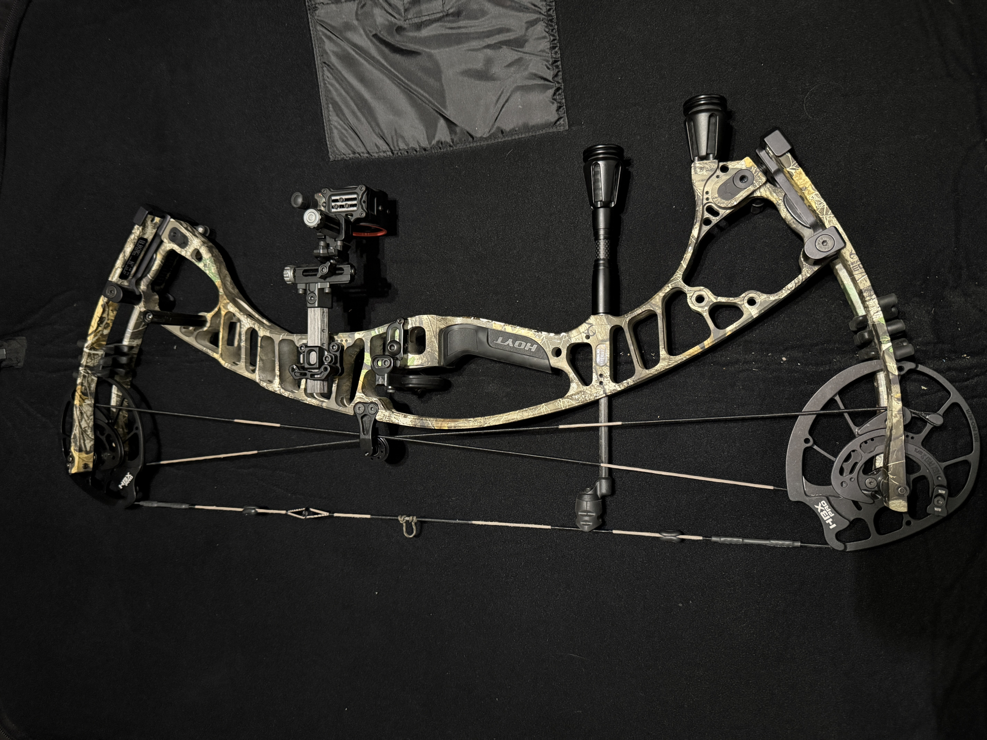 Bow has never been hunting. Has 60-70 pound limbs on it set to 27” draw. Only had enough arrows shot through it to sight it in.