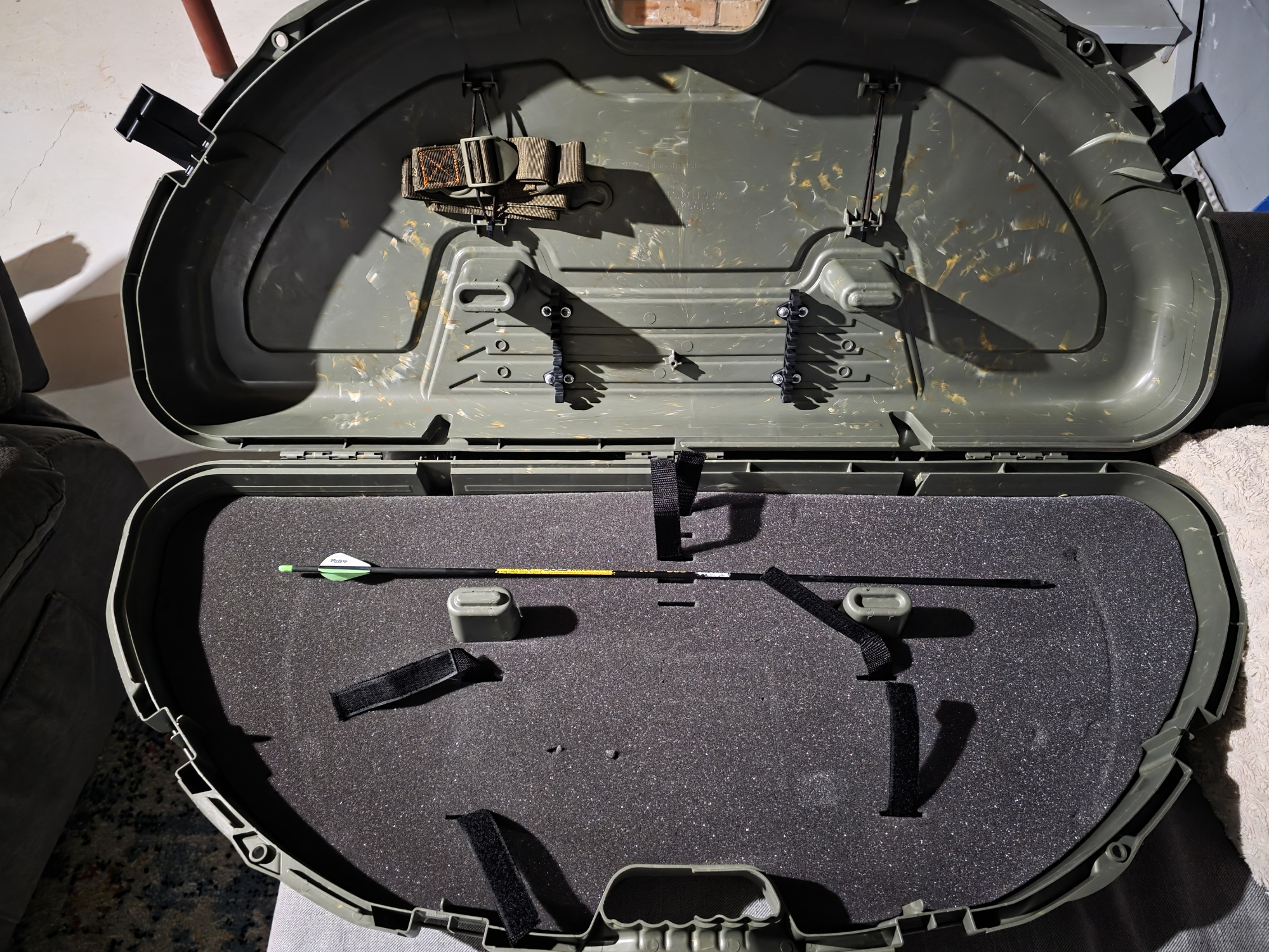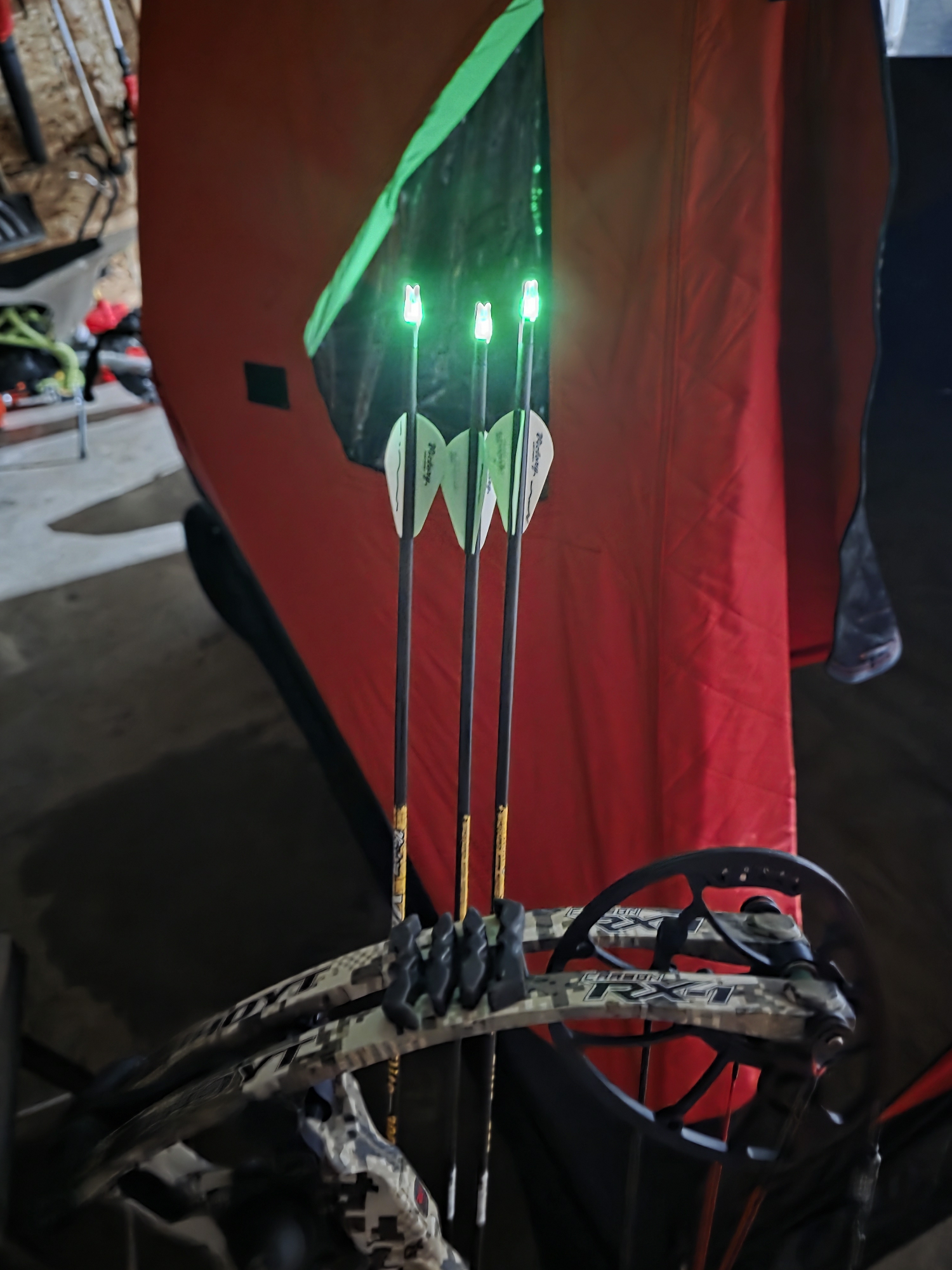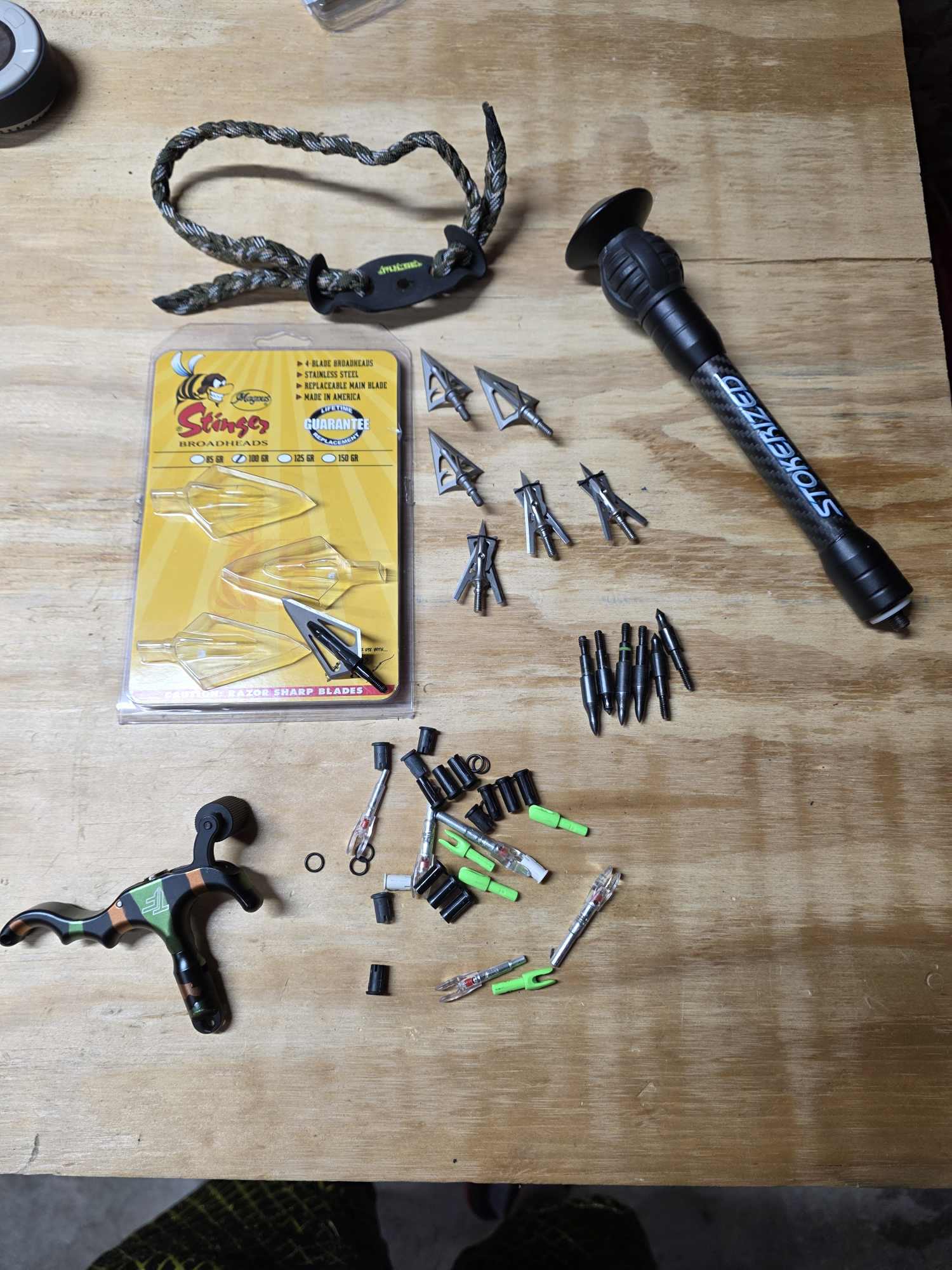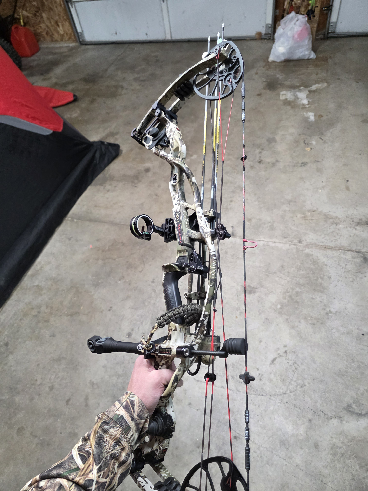 Hyot bow in good condition just tuned a couple months ago everything in pictures included as well as block used but still good draw is set to 30.5 @ 70LBs can be adjusted to your fitting the green arrows in quiver have stinger broadheads in them accurate bow has single pin that's adjustable on the fly also pictured is what these bows go for without accessories or trade for crossbow. fcfs