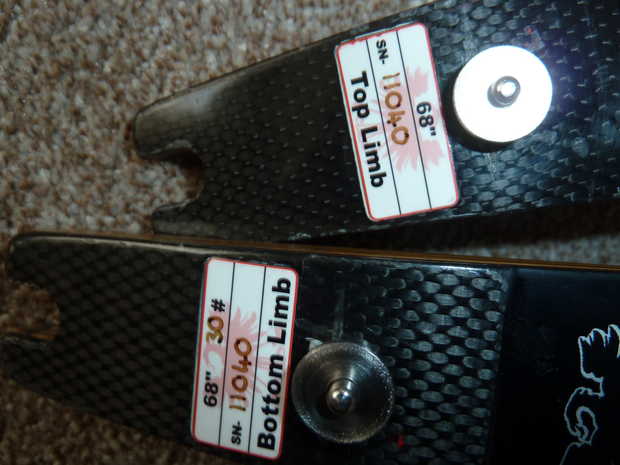 KG Nexgen Carbon Limbs. very little use. 30Lb at 68" on a 25" Riser. Usual insertion marks. Price includes the postage to a UK address only.