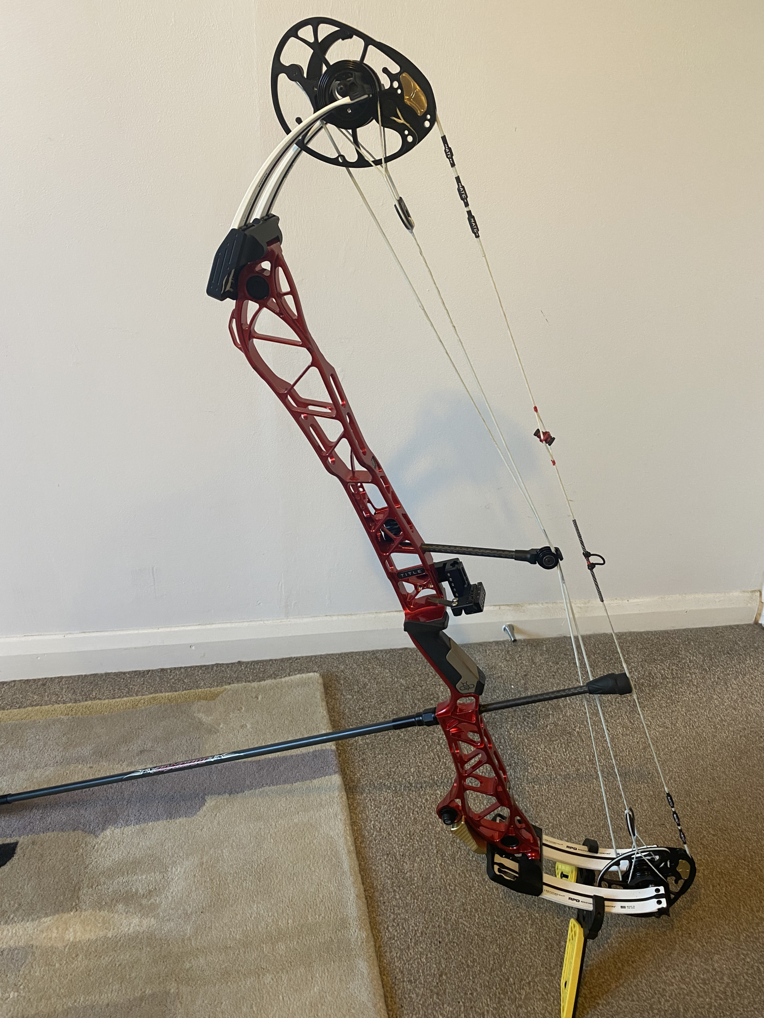 Mathews Title 38 G1 60# in metallic red, set to 28” draw length in MINT condition. Also includes Beiter rest, Bereal grip and peep with lens. Fully setup, ready to go. Selling due to recent bereavement. Stabiliser not included.
