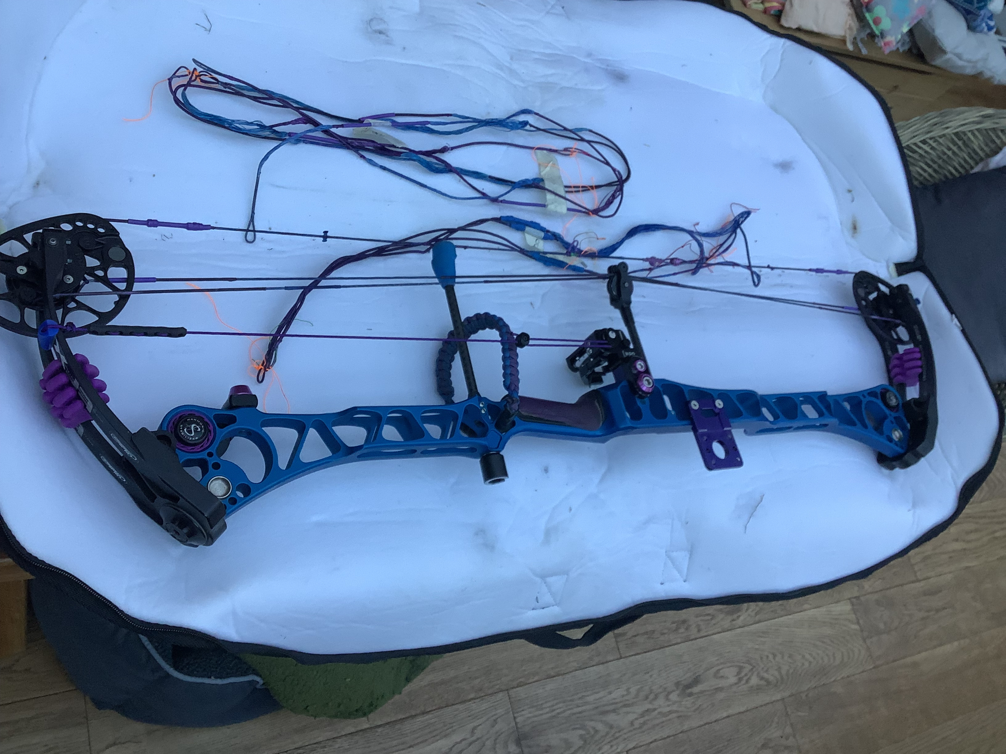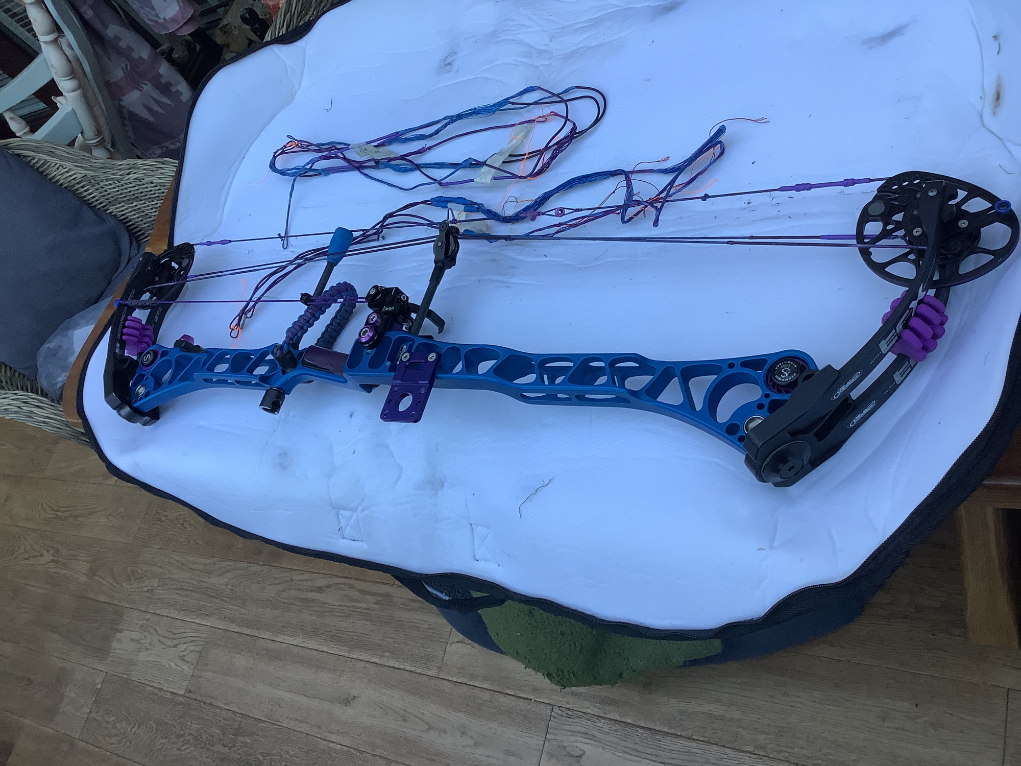 Blue Mathews TRX 7 50-60# draw weight 28,5 inch draw length. 40 inch ATA same cams as TRX38 in excellent condition comes with Hamskea Epsilon fall away rest, quick fit for long rod and one side rod, sight extension, It comes with two spare set of new purple and blue strings. It will come in the bag shown can view near Sidmouth if local.