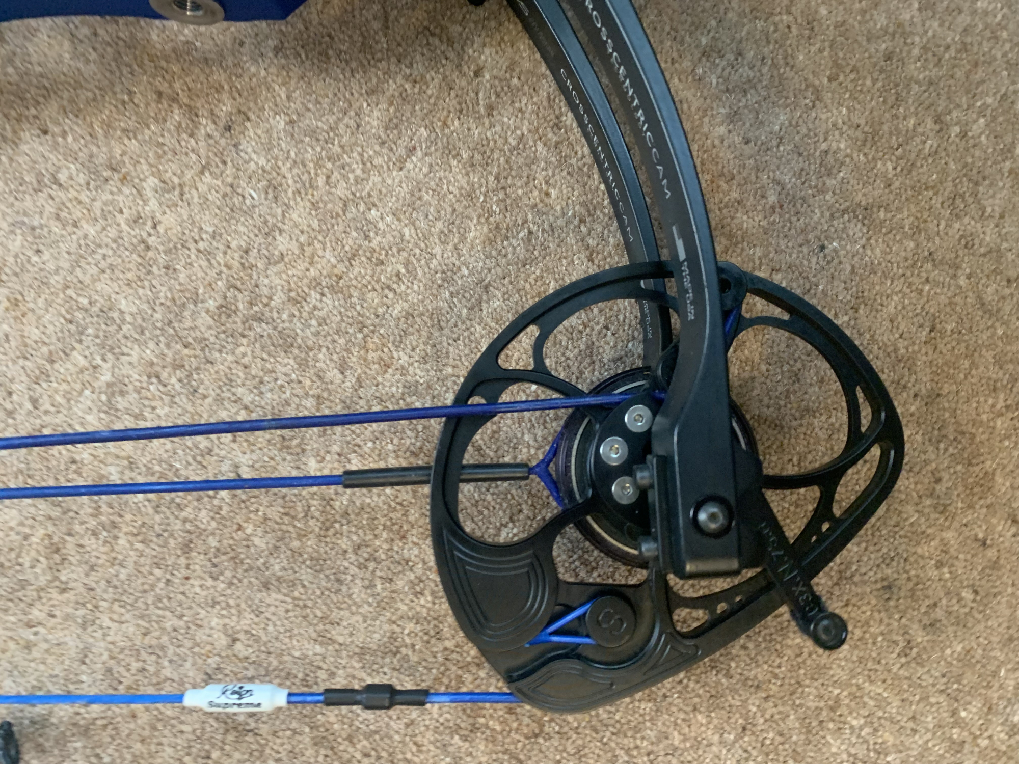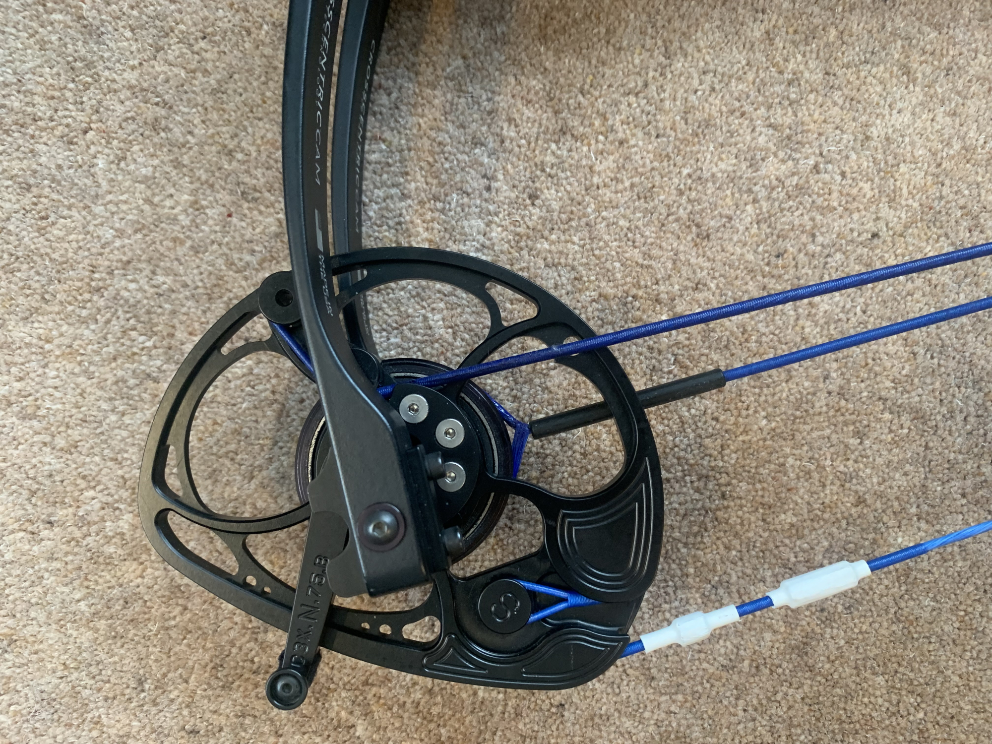 This Mathews TRX36 In blue is in very good condition with only one tiny ding which has been touched up so barely noticeable- shown in photos. The bow is 2.5 years old, 40-50lb draw weight and fitted with a blue Reign Sovereign string and cable set in excellent condition (only used for a few weeks last outdoor season, then for practice only during this indoor season, so still lots of life left in it. Also fitted is a blue Speciality hooded peep with aperture and standard Mathews engage grip. The current draw length is 24” and the modules fitted are 75% let-off. Also included but not shown in photos is another set of modules - same draw length but 70% let-off. If your draw length is different, Clickers Archery do a free module exchange to provide you with the correct set for you. The fitted and the spare modules are both in excellent condition.