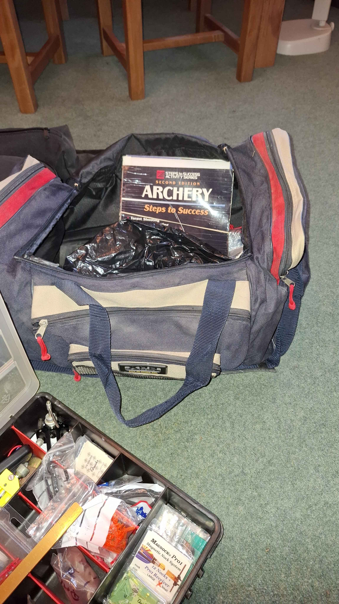 As the photos depict - there are a range of Easton Arrows (ACC, ACE & Superslams) - trigger release, Beiter Scope etc all contained in a padded Compound Bow Case. Additionally there is a holdall for all those extras needed such as wax, feathers,tuning aids together with Archery Instruction Book & Tuning Guide.