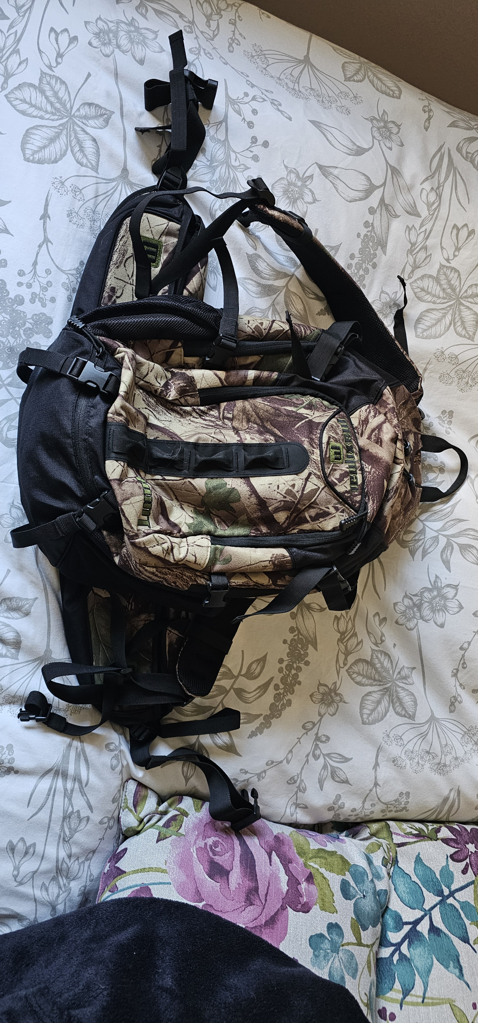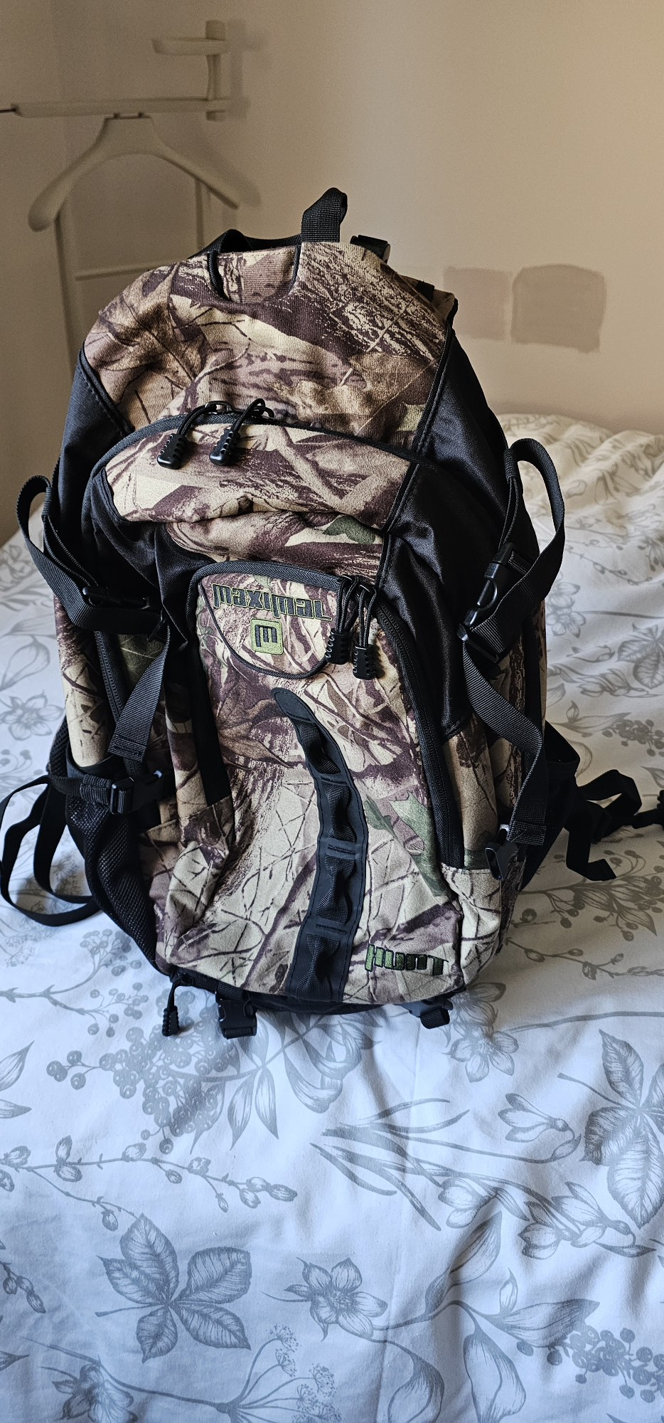 The backpack has a camofinish and is water repellent, additionally included is a rain cover which is stowed in its own compartment. Buyer pays postage, collection welcome.