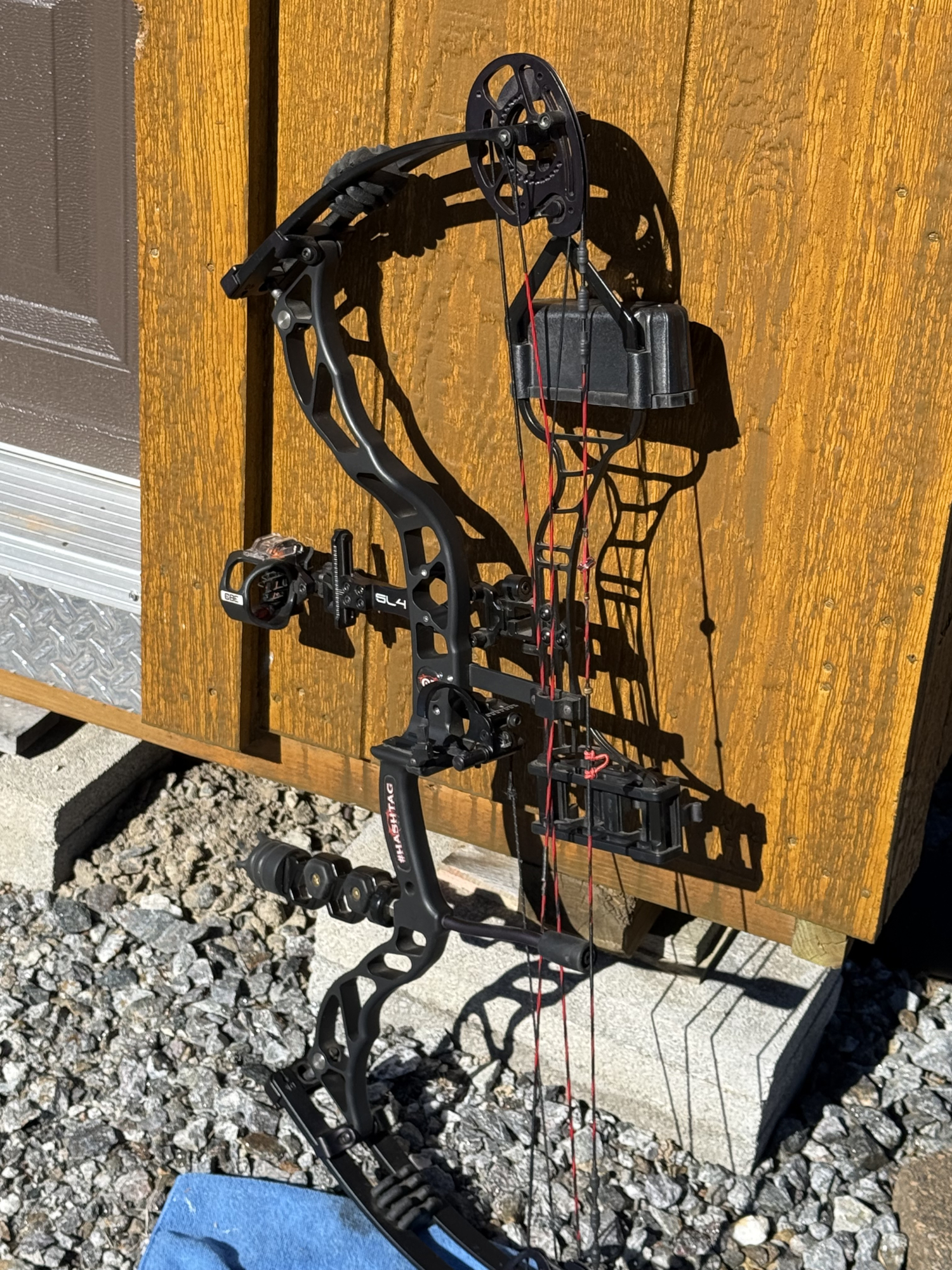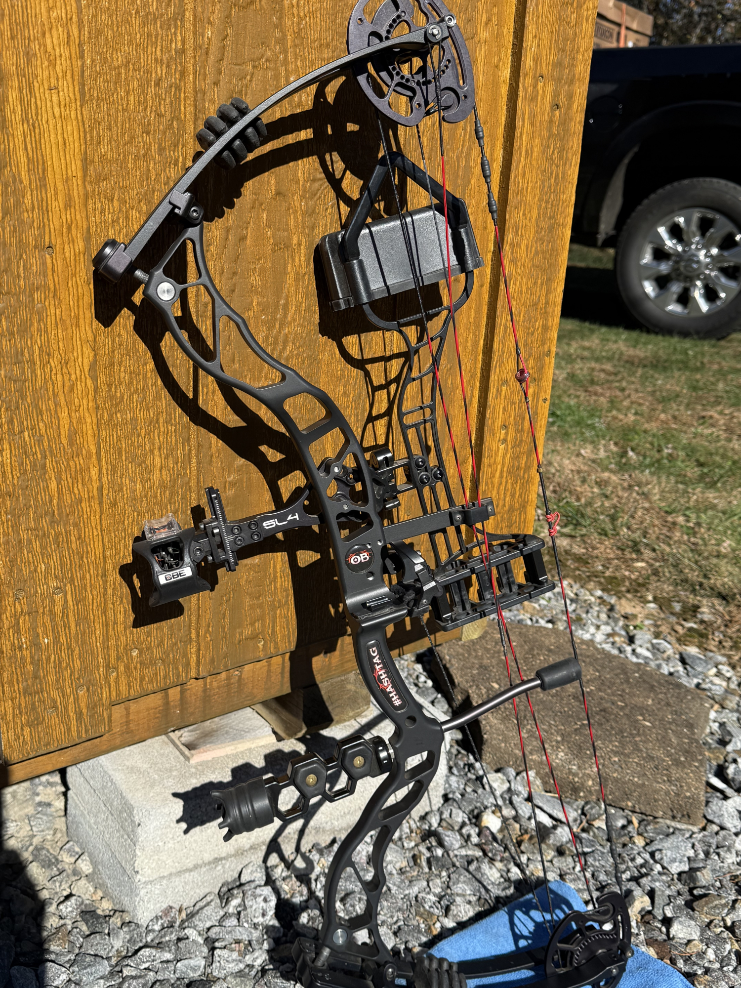 Black compound bow with various accessories. Has a stabilizer and other attachments. Used as a demo, comes with top of the line accessories as seen in the picture. 6061 CNC machined aluminum riser, adjustable draw length and weight.