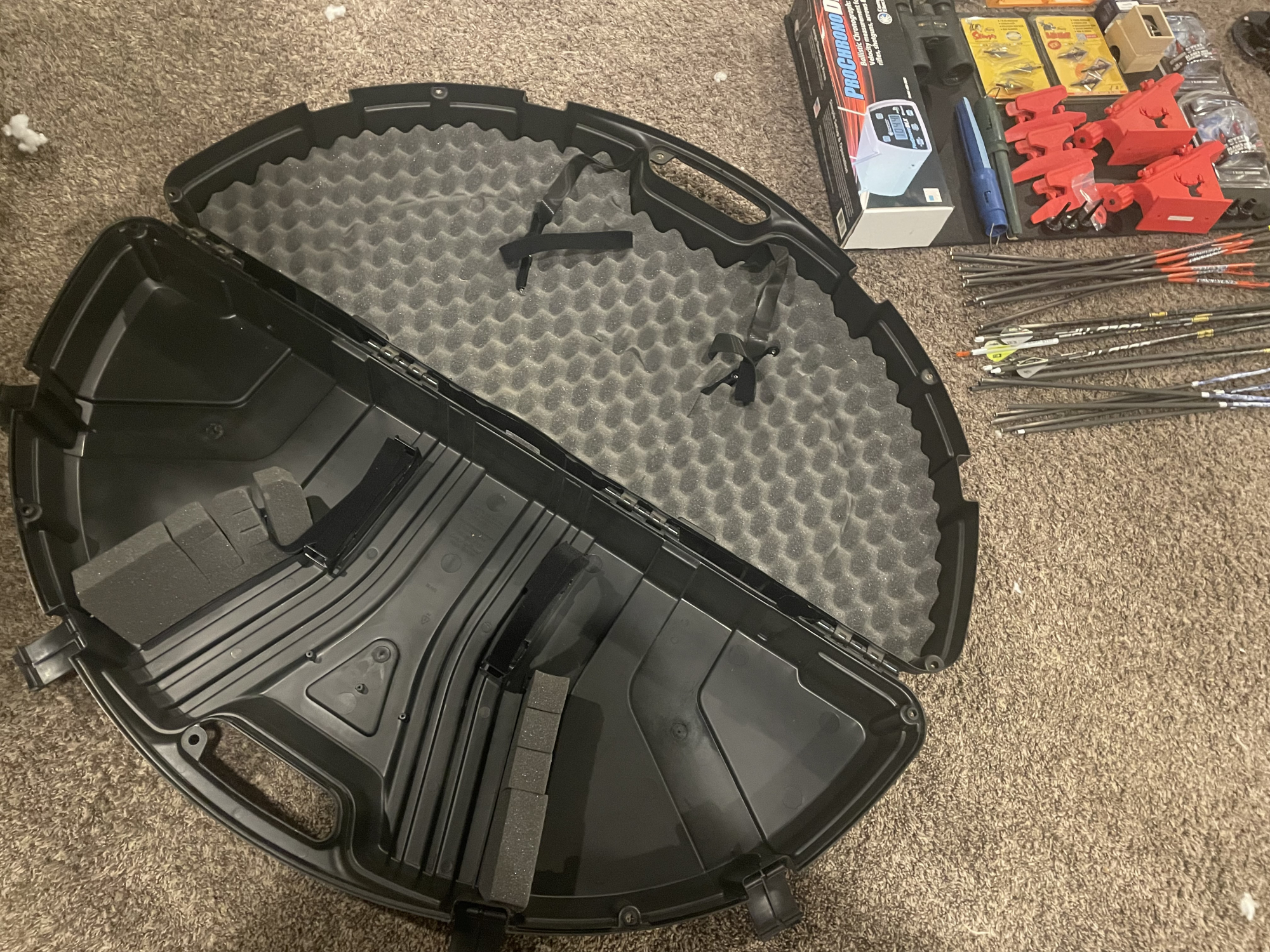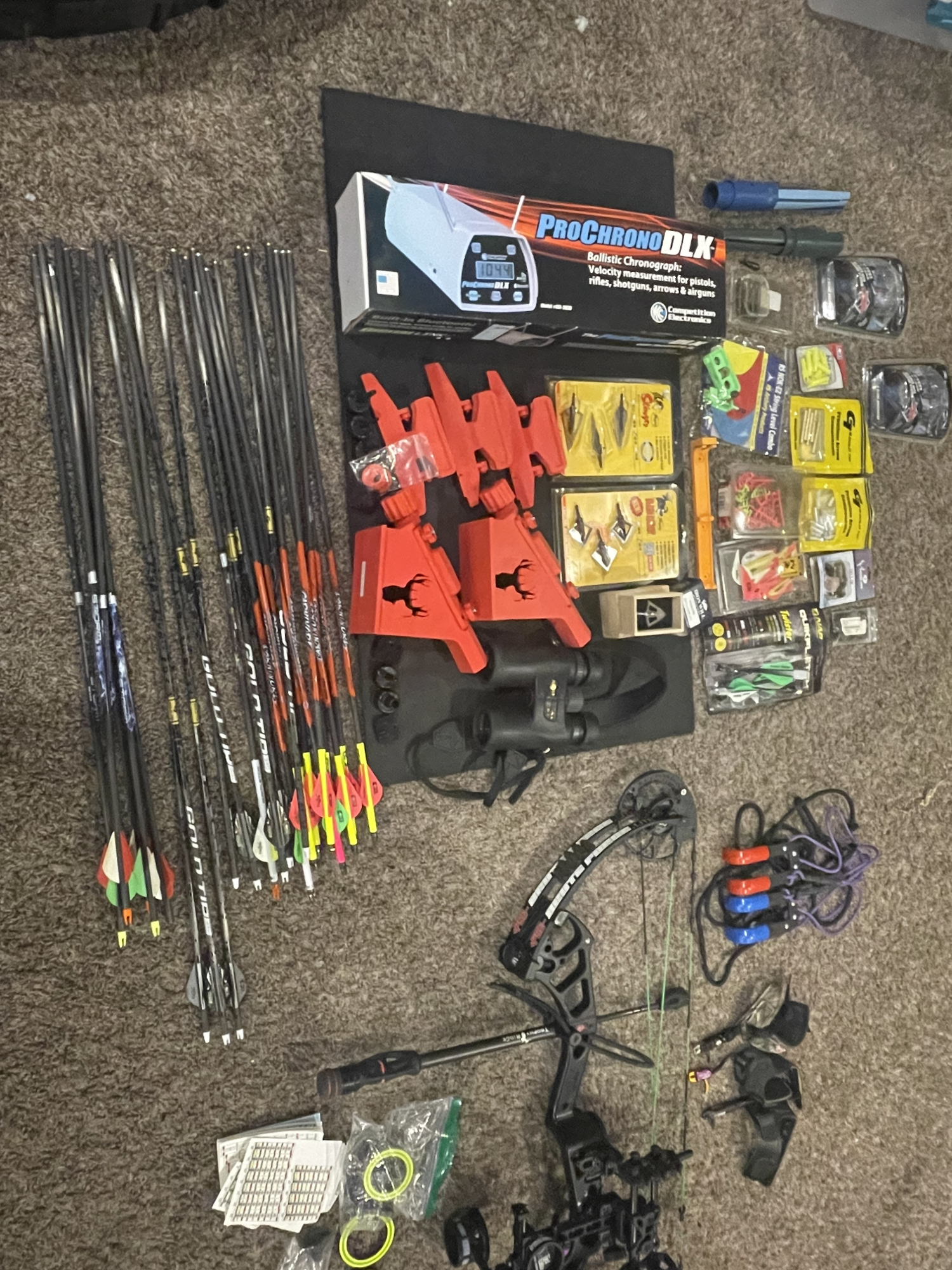 Spot Hog Fast Eddie XL two pin, Nikon Monarch 7 10x42, Synunm portable bow press (works awesomely), new ProChrono DLX, three nice wrist releases, a few sets of different broadheads, like new bow case, a couple Bohning fletching jigs with left, right, straight clamps, over 20 arrows (most cut to 25 inches), pretty sure installed cams are 40-70 pounds. Feel free to ask any questions