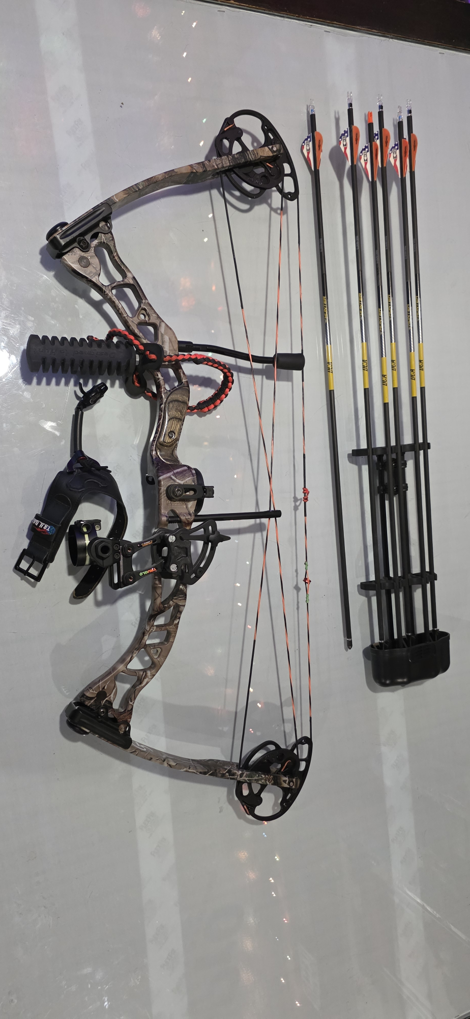 Quest g5 bow, comes with 6 arrows 3 fixed blade broadheads all arrows have been checked for cracks, cams and strings are 2 years old, well taken care of no fraying, also includes truball mechanical release, has a truglo single pin lever style sight with an aluminum peep sight.