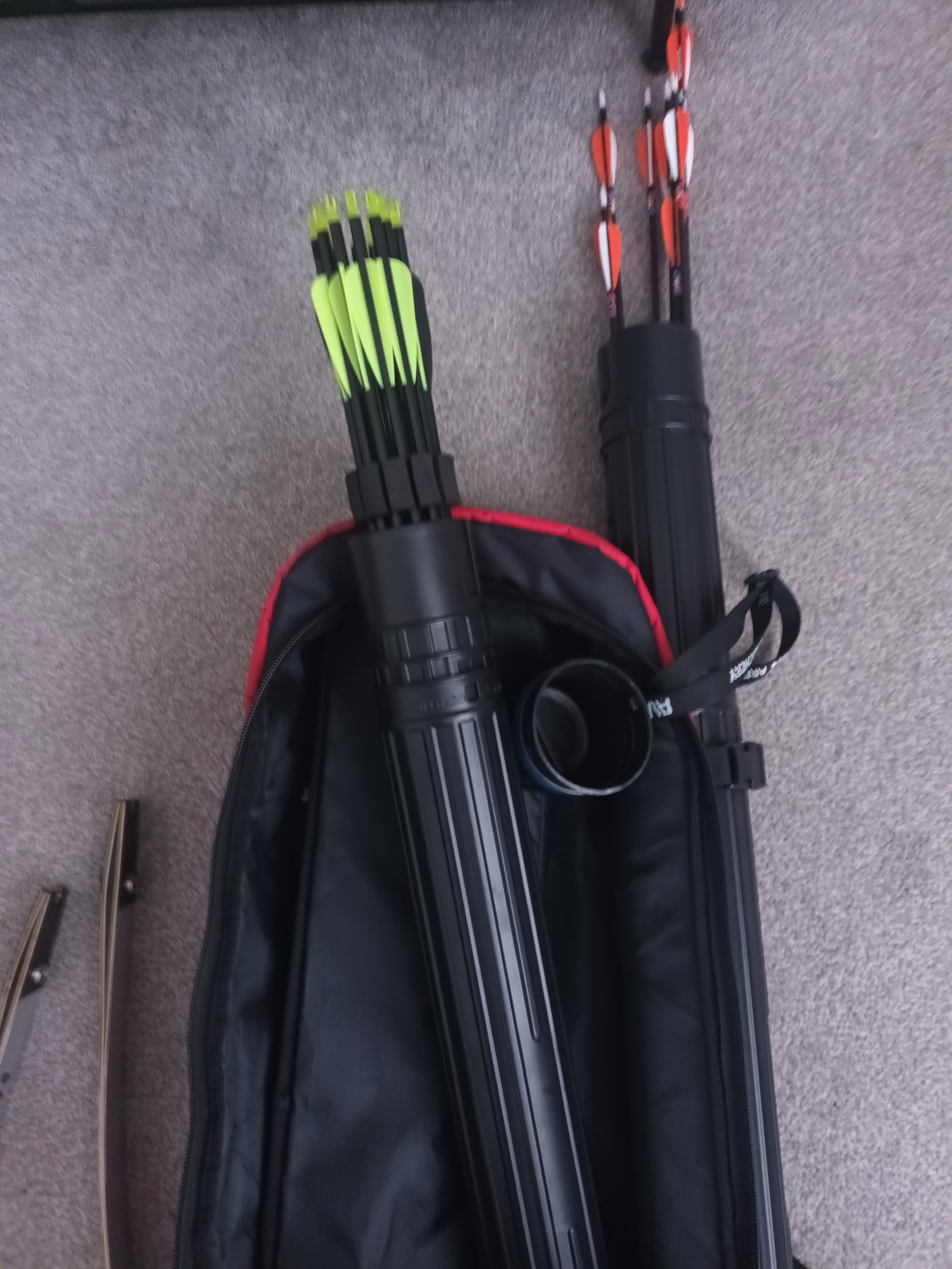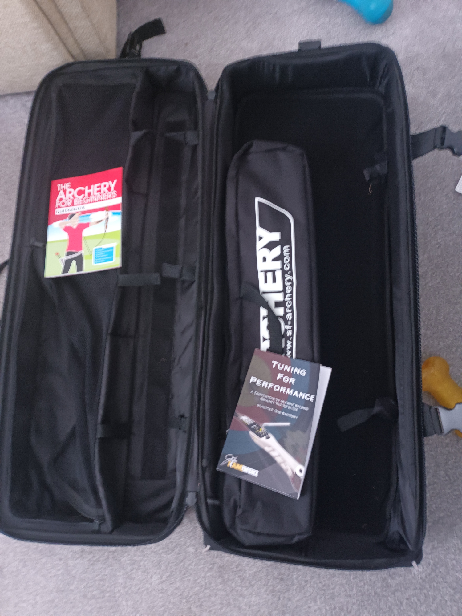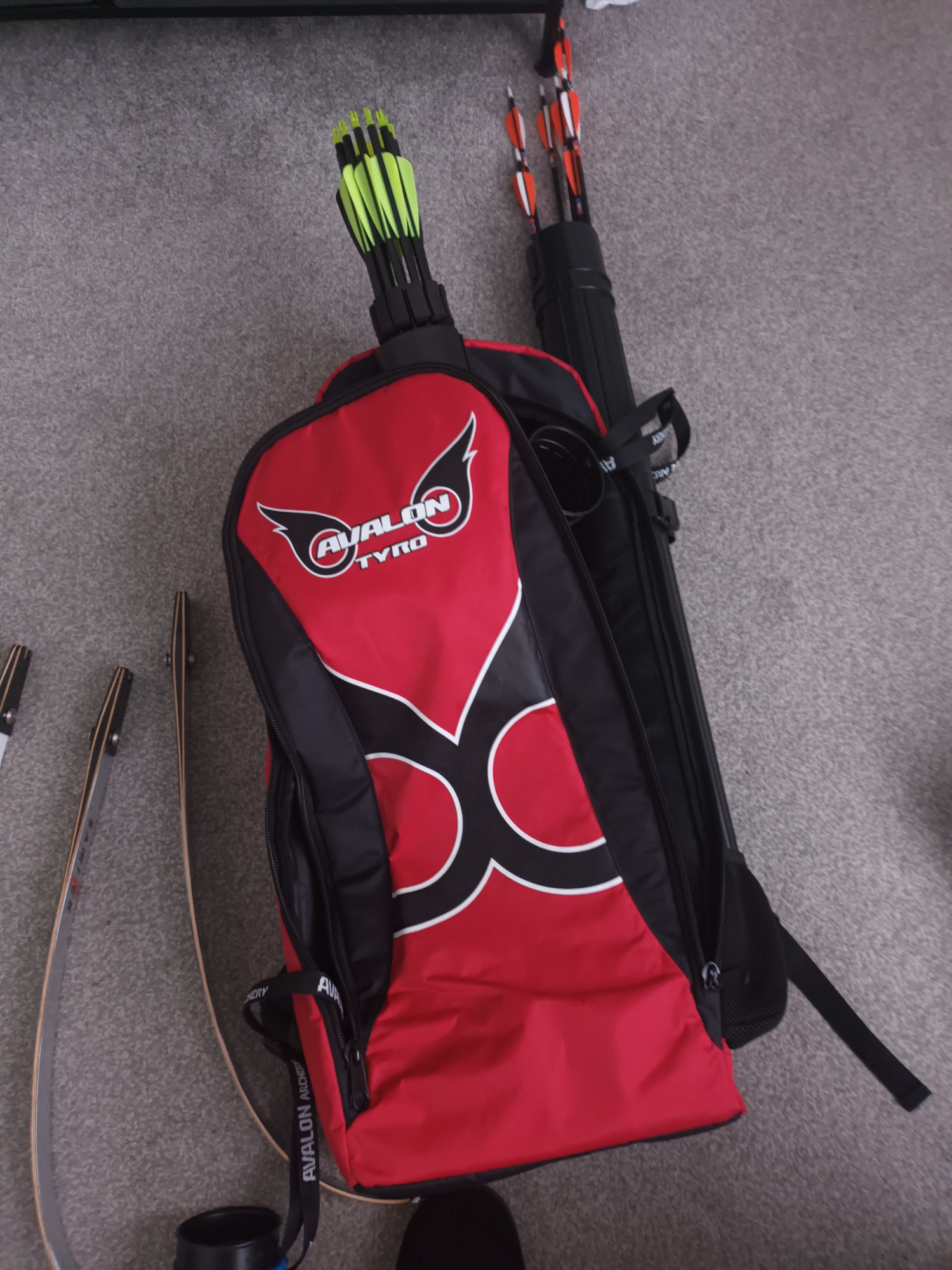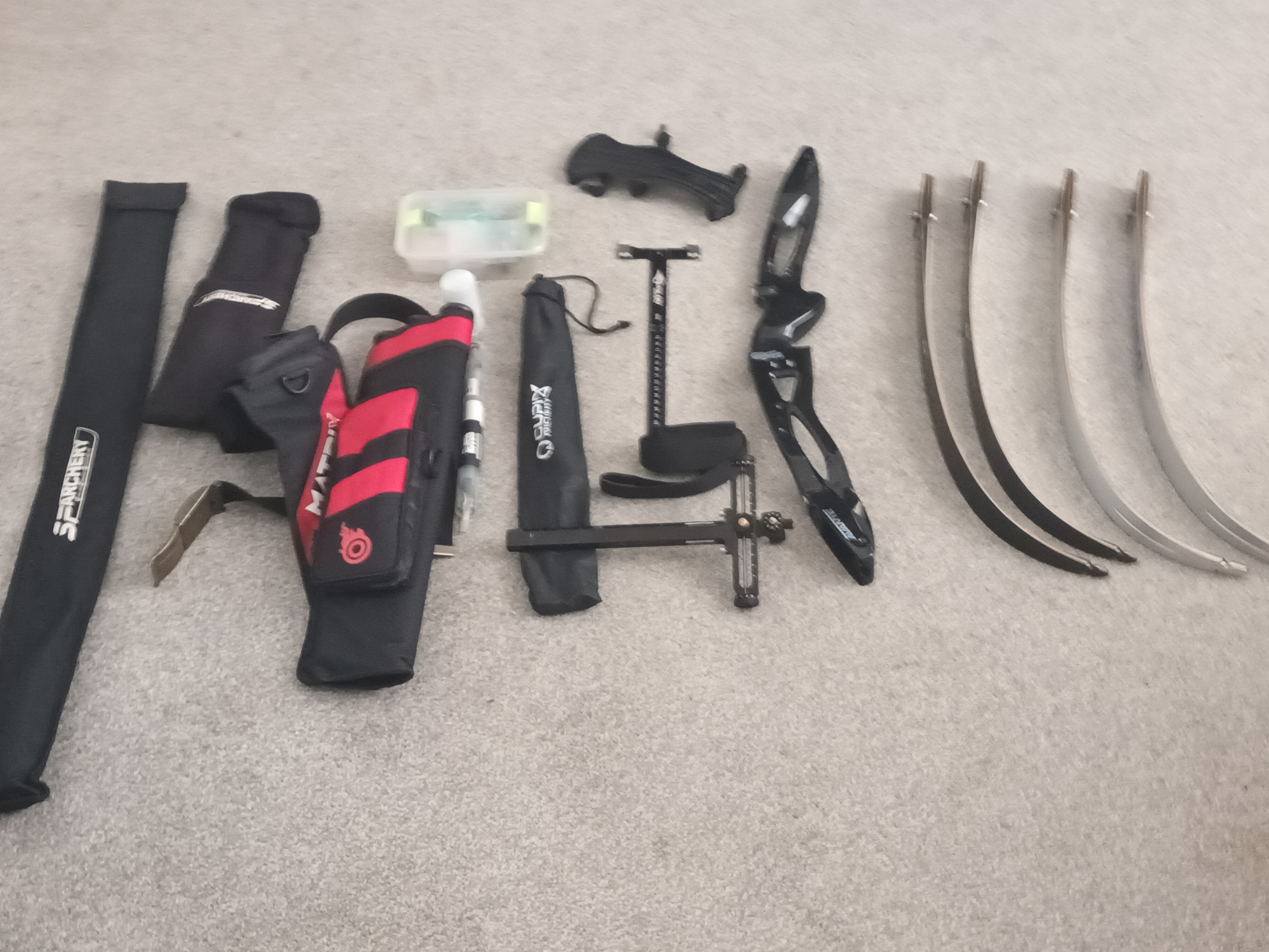 Here I have my recurve bow 70 inch and 30 lb pull weight. 2 sets of arrows, spare set of limbs, a trolly case and a avalon bag. Also weights fir bare bow and 2 books.