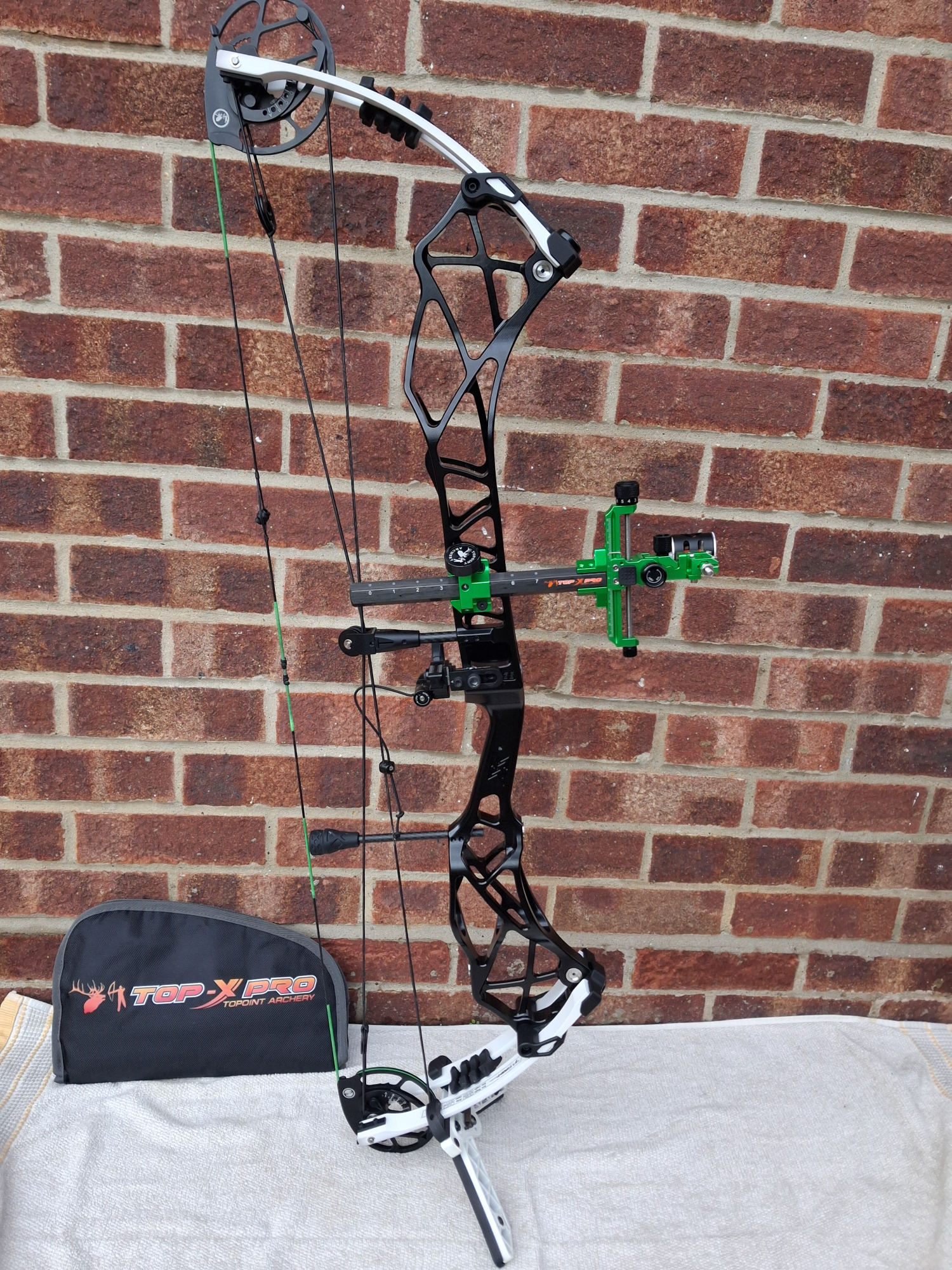 Anodised Gloss Black with white limbs, and a shoot through riser.