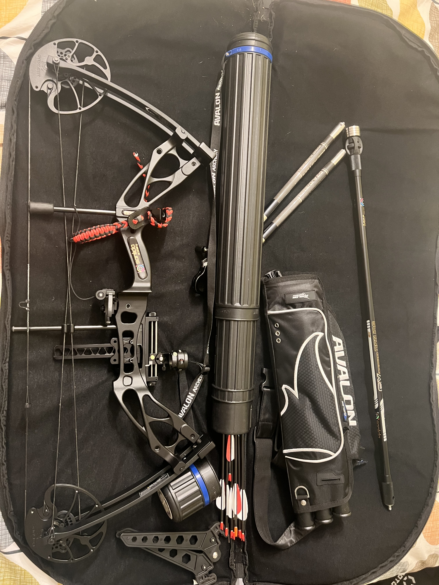 Sanlida Hero X8 compound bow as new. Avalon bag. Avalon pouch. Avalon X-Tex sights. Maximal eraxor arrow launcher. Arrow puller. Sanlida balance bars x 3. Torpiont release. Arrows & box.