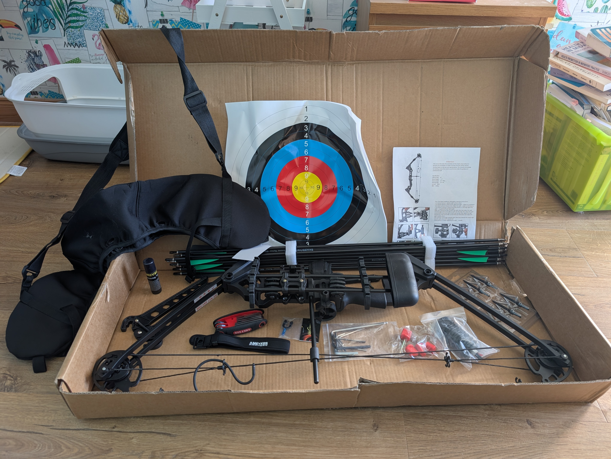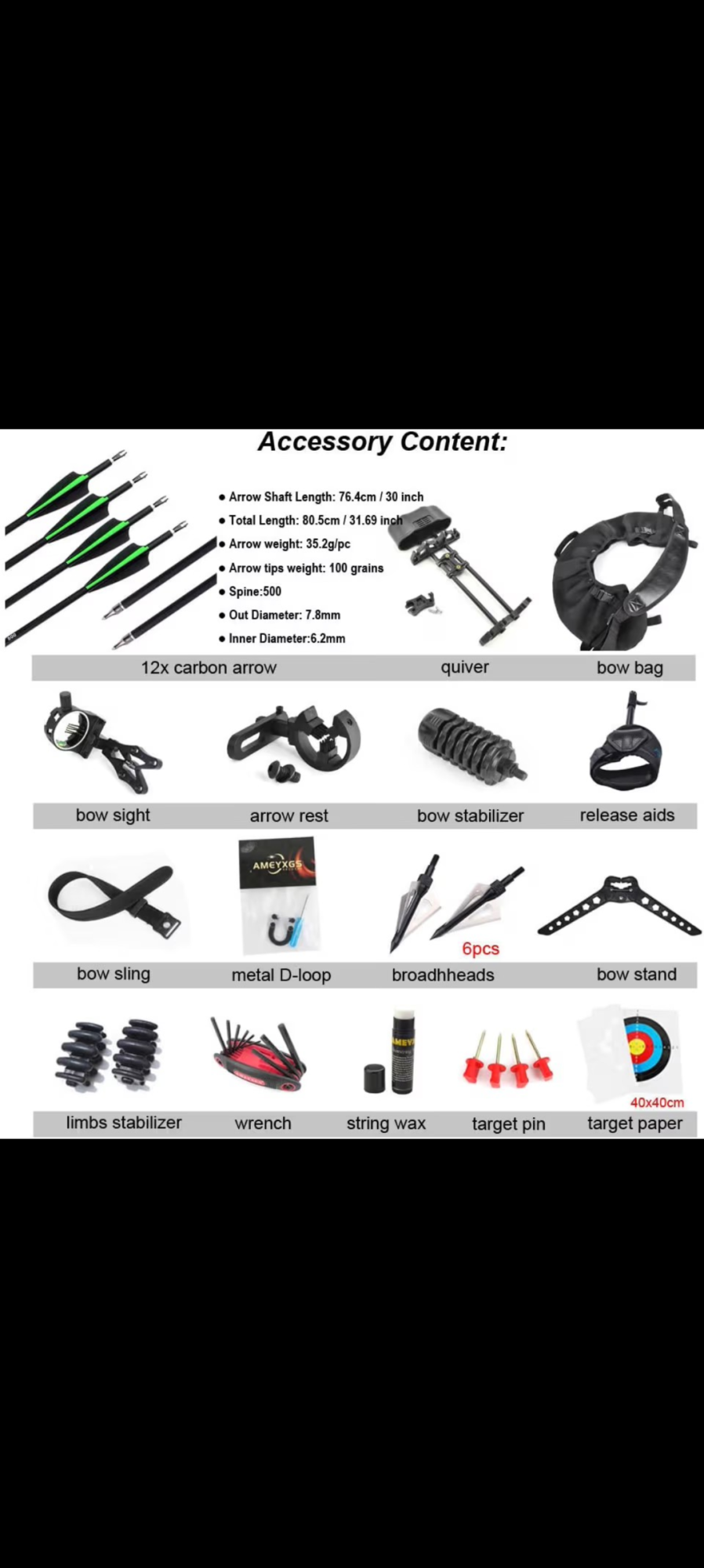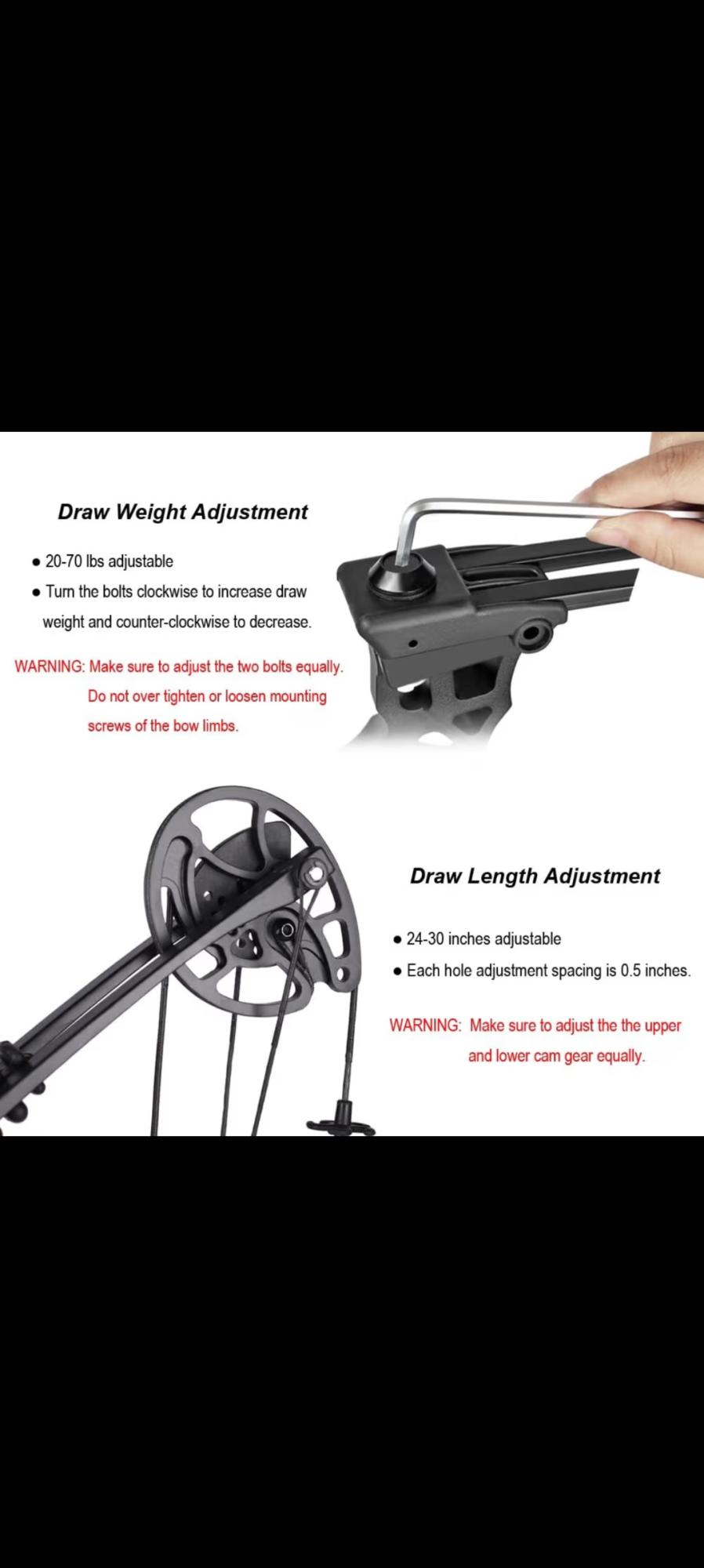Specification: Draw weight: 20-70 lbs adjustable; Draw length: 24"-30" adjustable; Axle-to-Axle: 34"; Brace Height: 7.3"; IBO arrow speed: 320fps; Let-off: 80%