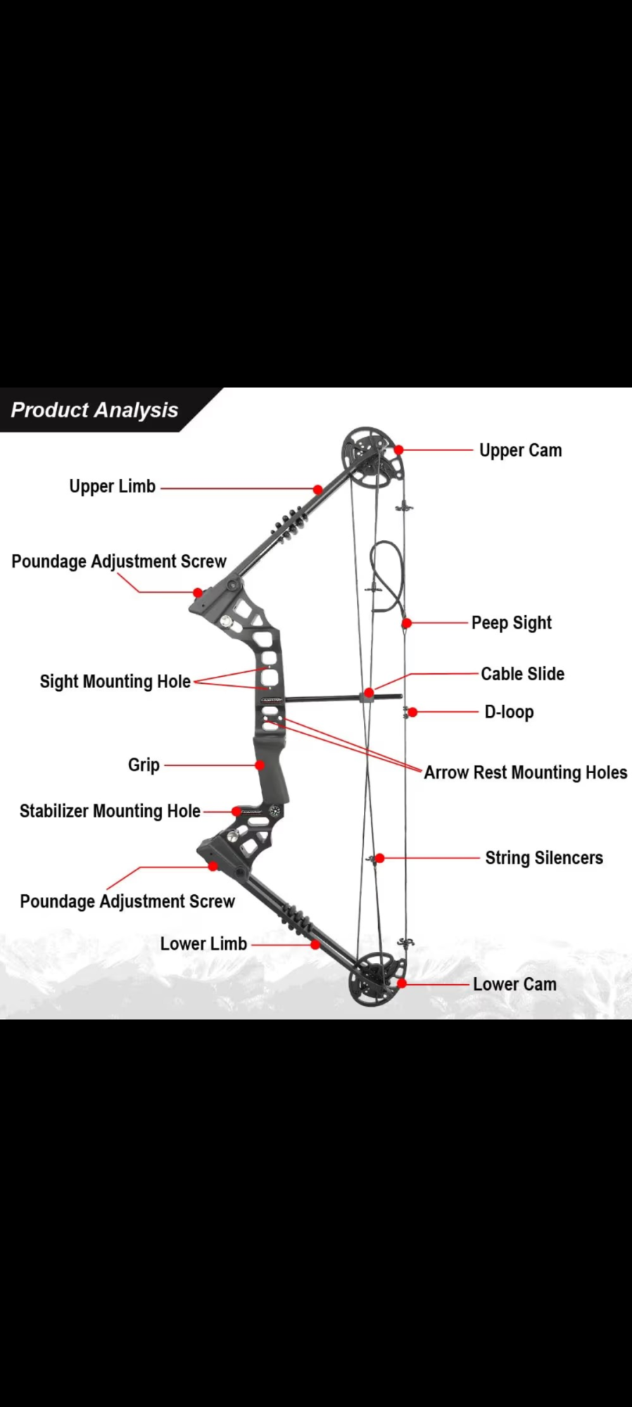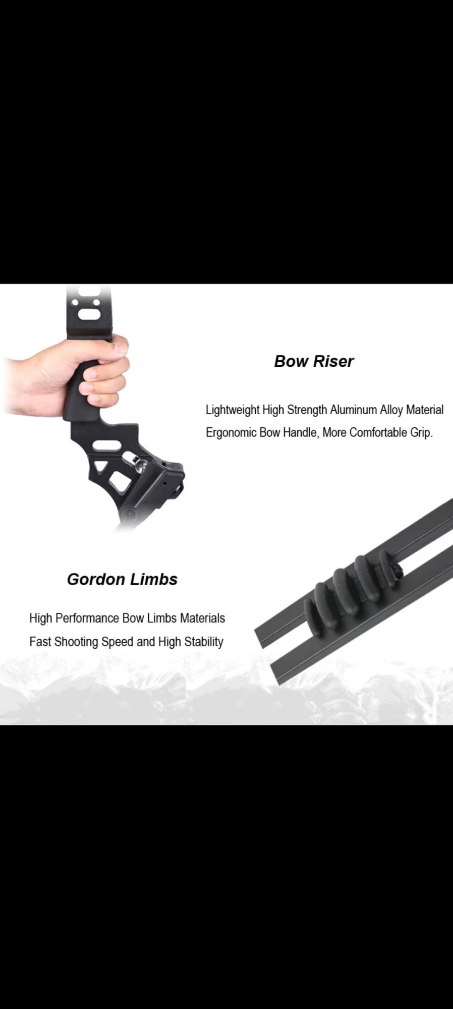 Riser: Aluminum CNC machined riser, sturdy and durable. Ergonomic bow handle, more comfortable grip.