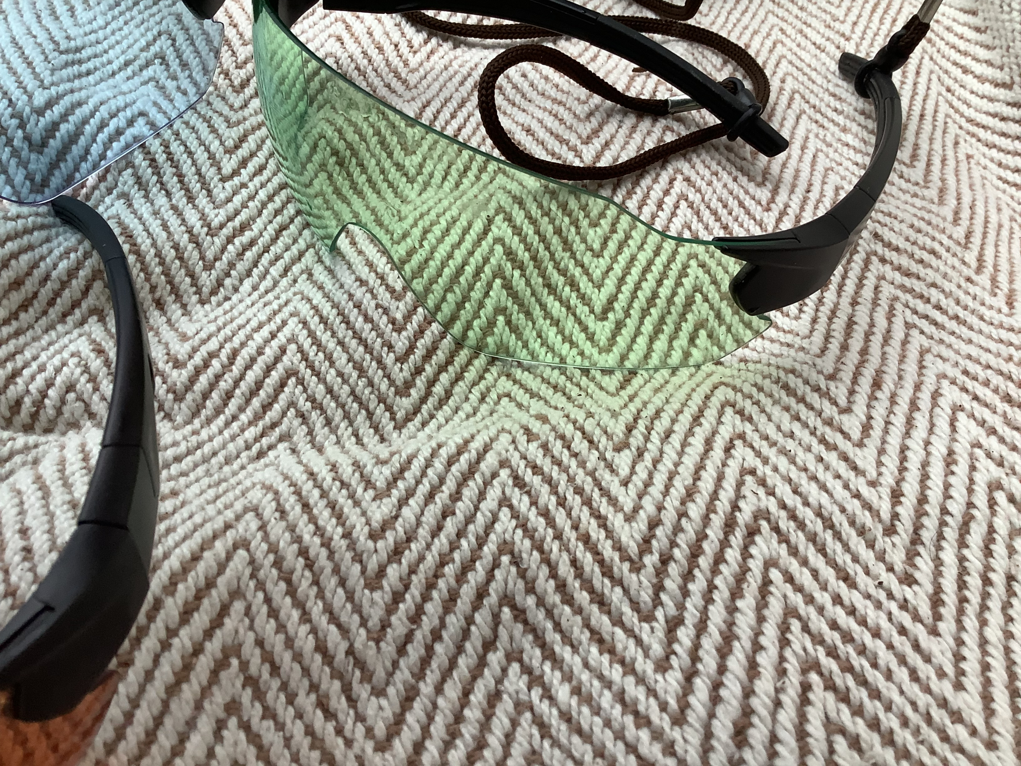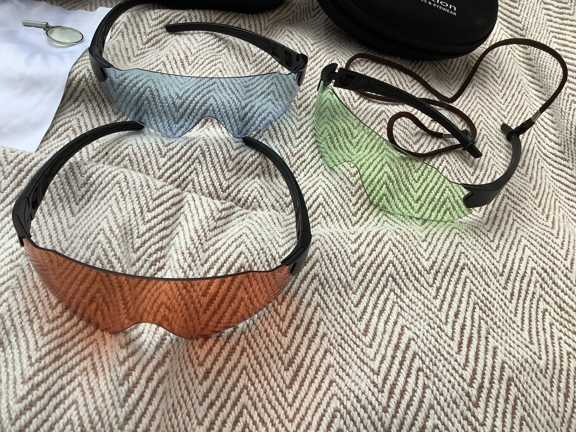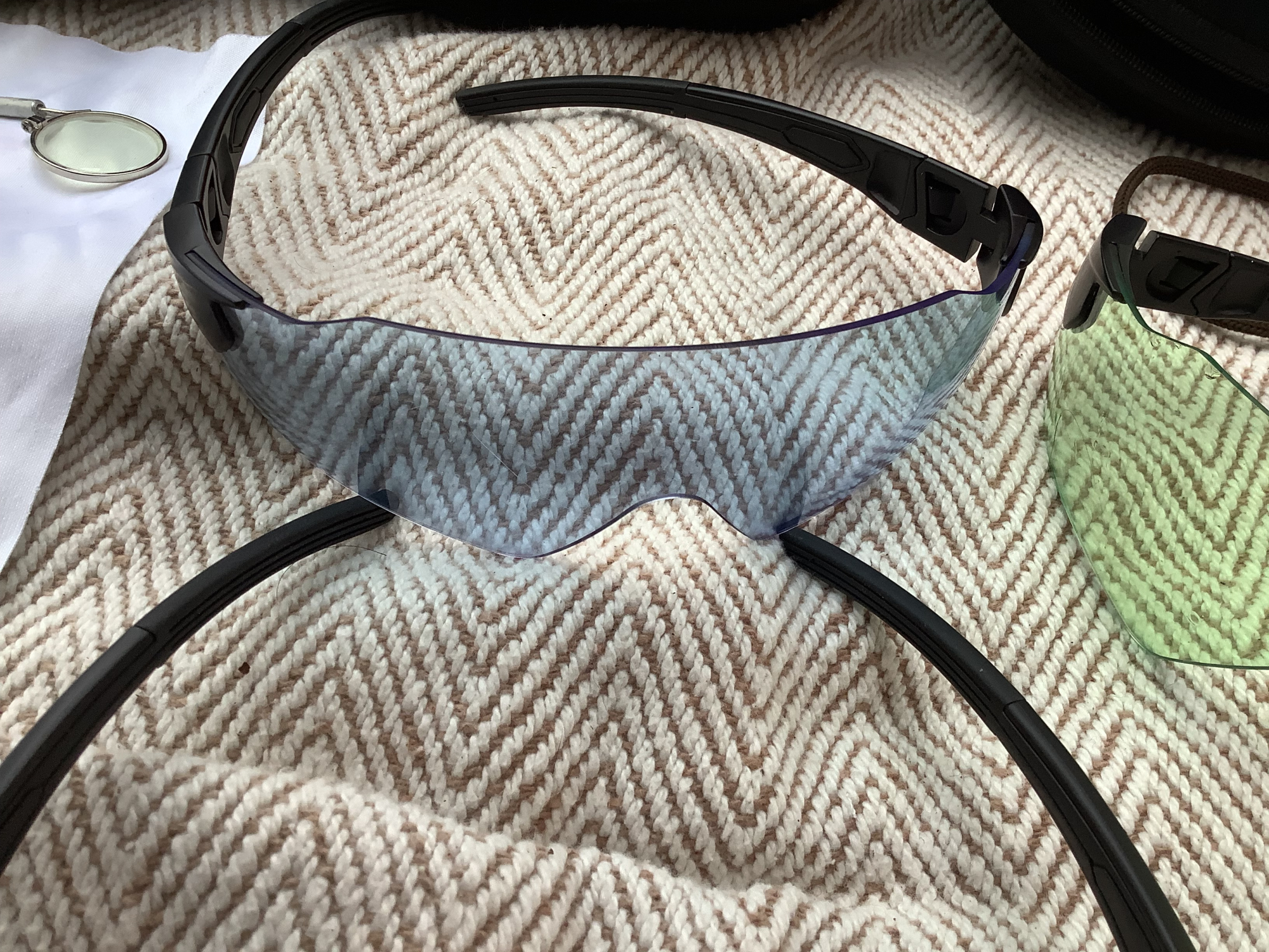 Three pair of Paradox Archery bridge less glasses in 3 different colours priced half price and includes postage.it also comes with 2 clamp on clarifiers with different magnification to clear up target down range.