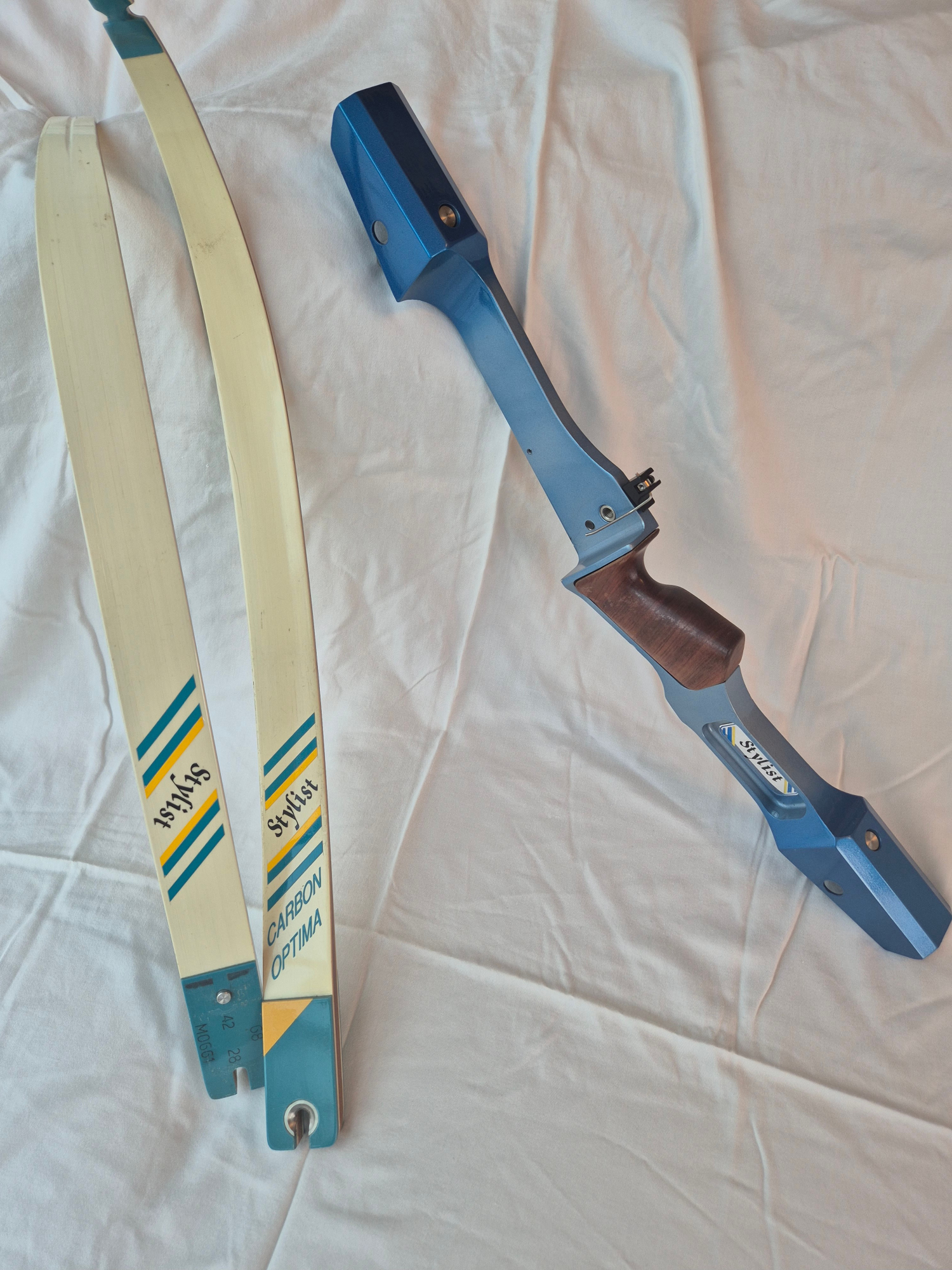 Stylist recurve bow with carbon optima limbs, colour blue, 68" 42lbs @ 28". Fitted with Spigarelli magnetic arrow rest.
